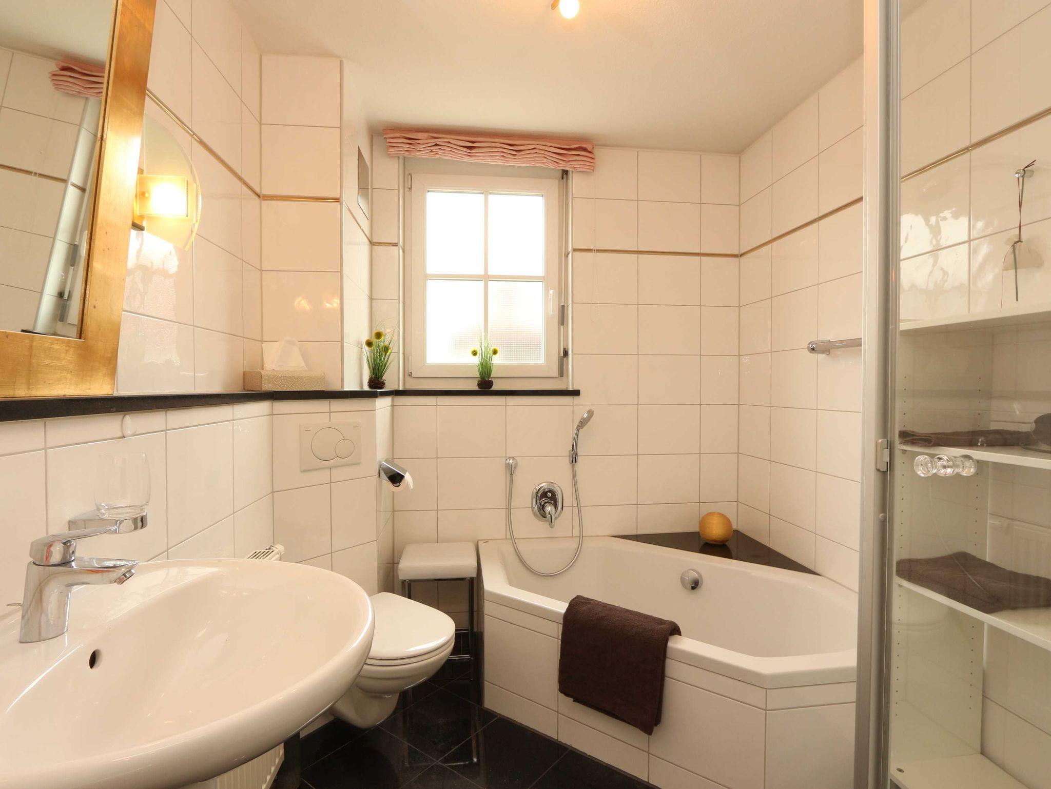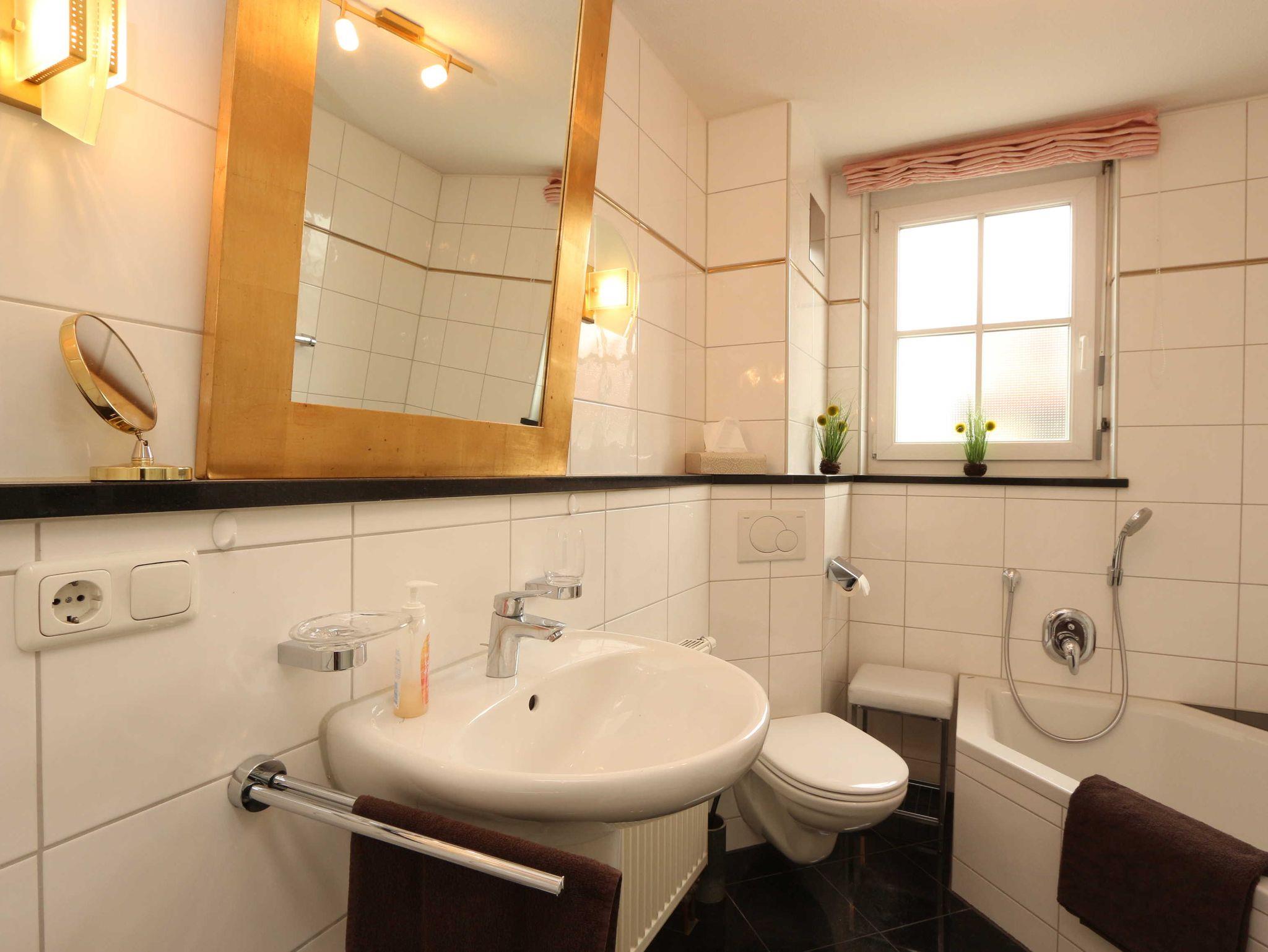 • Badezimmer mit WC, Dusche, Badewanne, Haarfön, Fußbodenheizung.