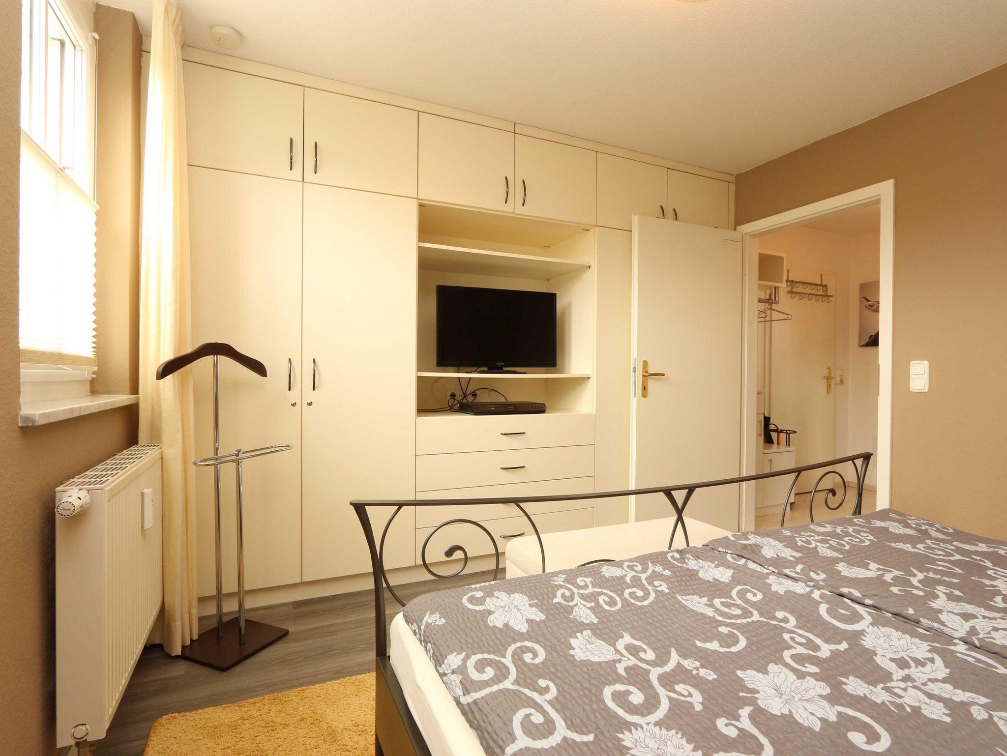• Schlafzimmer mit Doppelbett (180 x 200 cm) für 2 Personen, großer Einbauschrank, Flachbildfernseher und DVD-Player.