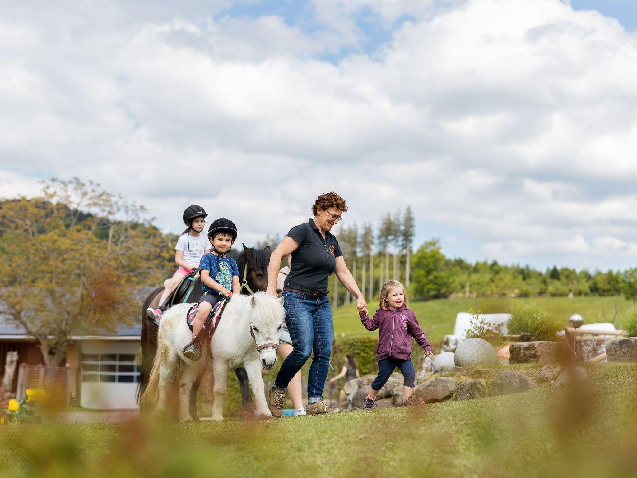 Hier dürfen Kinder noch richtig Kind sein: Ponyreiten, Pferde auf die Koppel bringen, Hasen füttern, mit Kater Fredi kuscheln. Spielplatz, Fahrzeuge, Klettergerüst und viele Tiere warten – und das Schönste ist die gemeinsame Zeit. Jeder Tag wird zum kleinen Abenteuer.