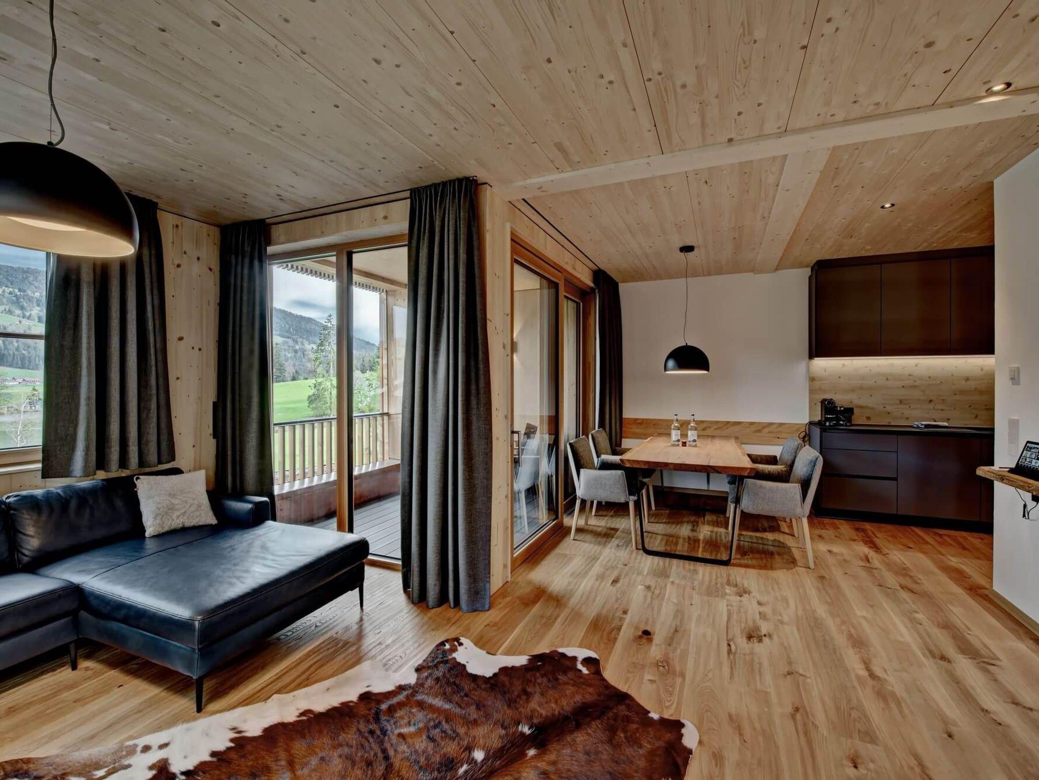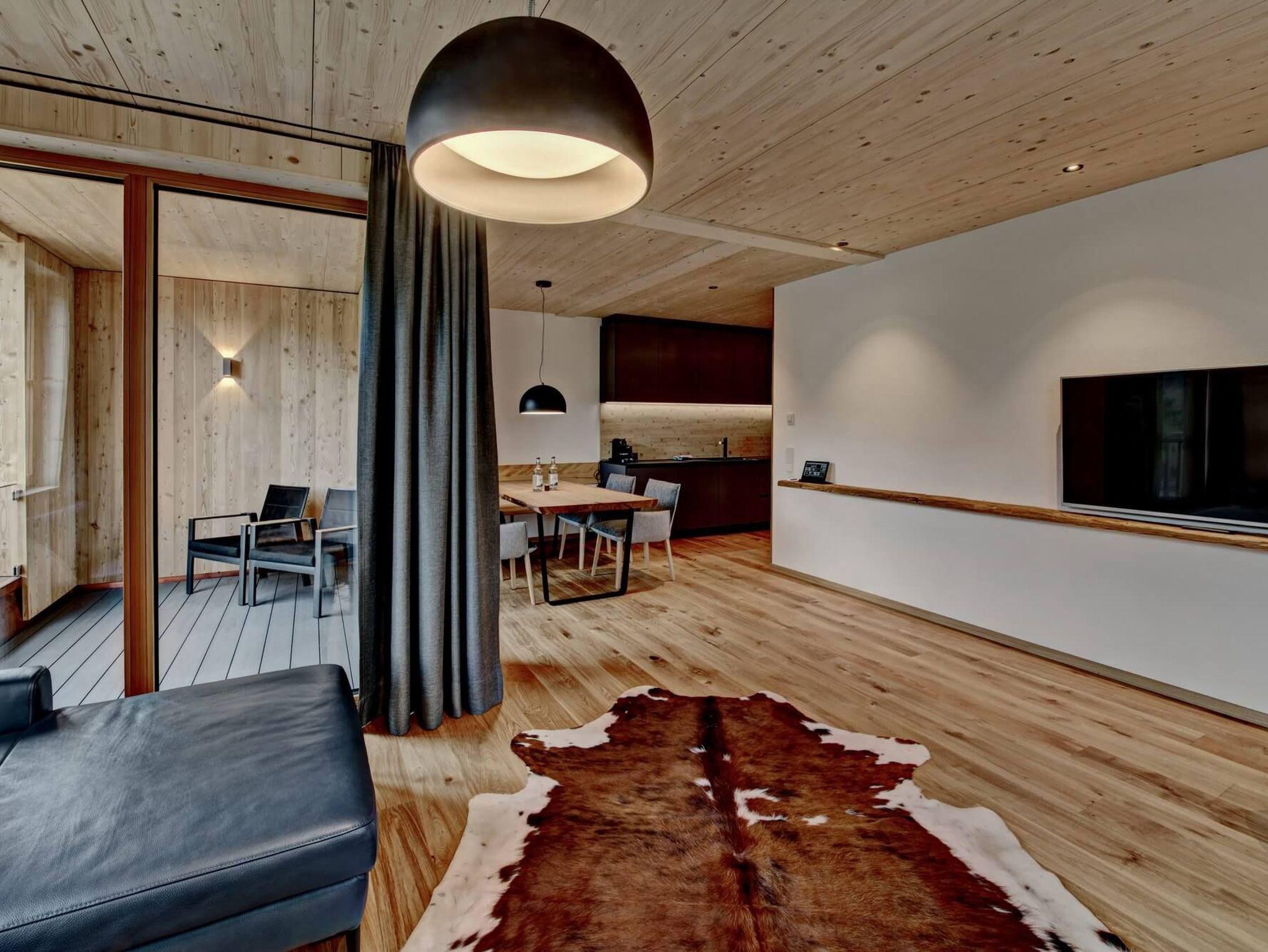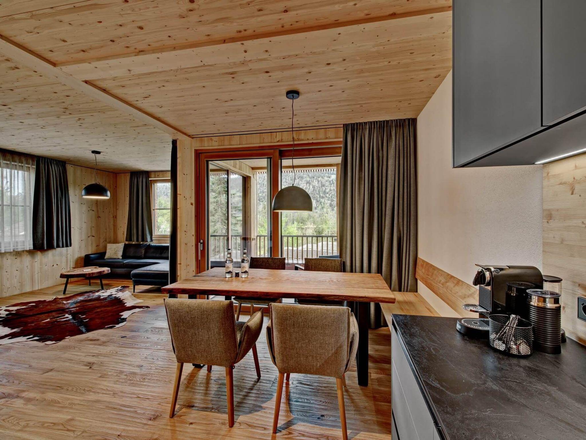 Genießen Sie den Ausblick auf der Loggia, entspannen auf dem hochwertigen Ledersofa und speisen an einer einzigartigen Tafel aus gebürsteter Platane. Nach einem Tag an der frischen Luft in dem Bergen genießen Sie die großzügige Regendusche in Ihrem Wohlfühltempel und erleben den Luxus einer eigenen Sauna im Chalet.