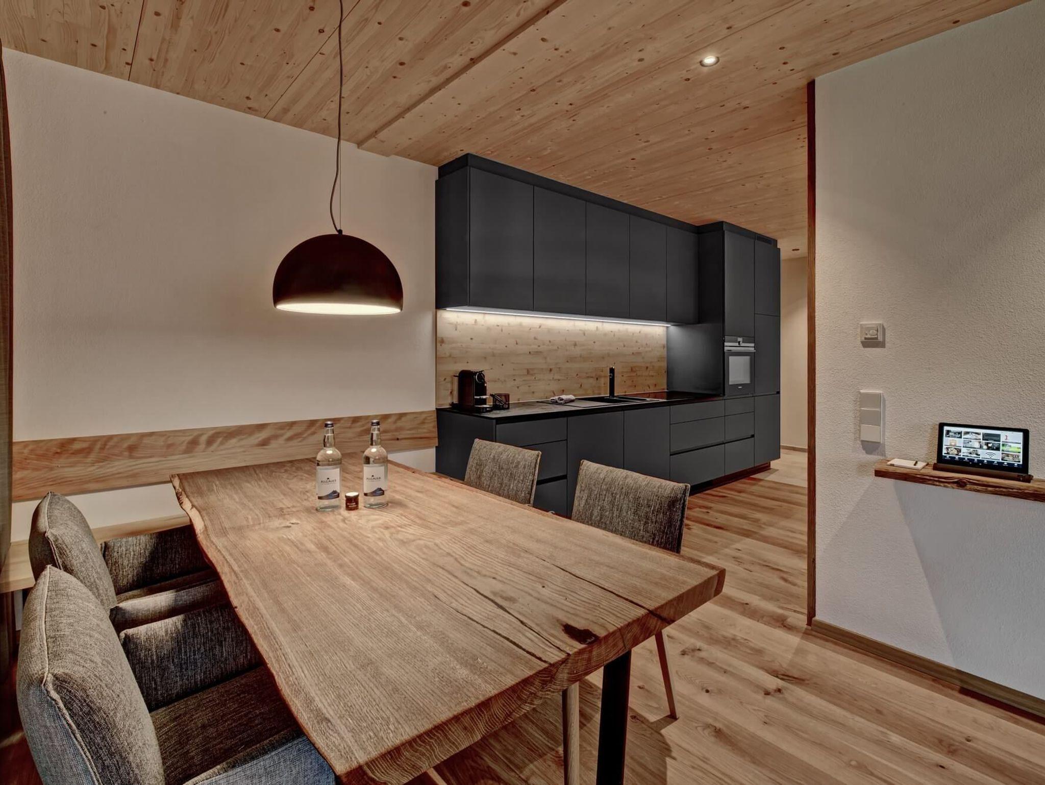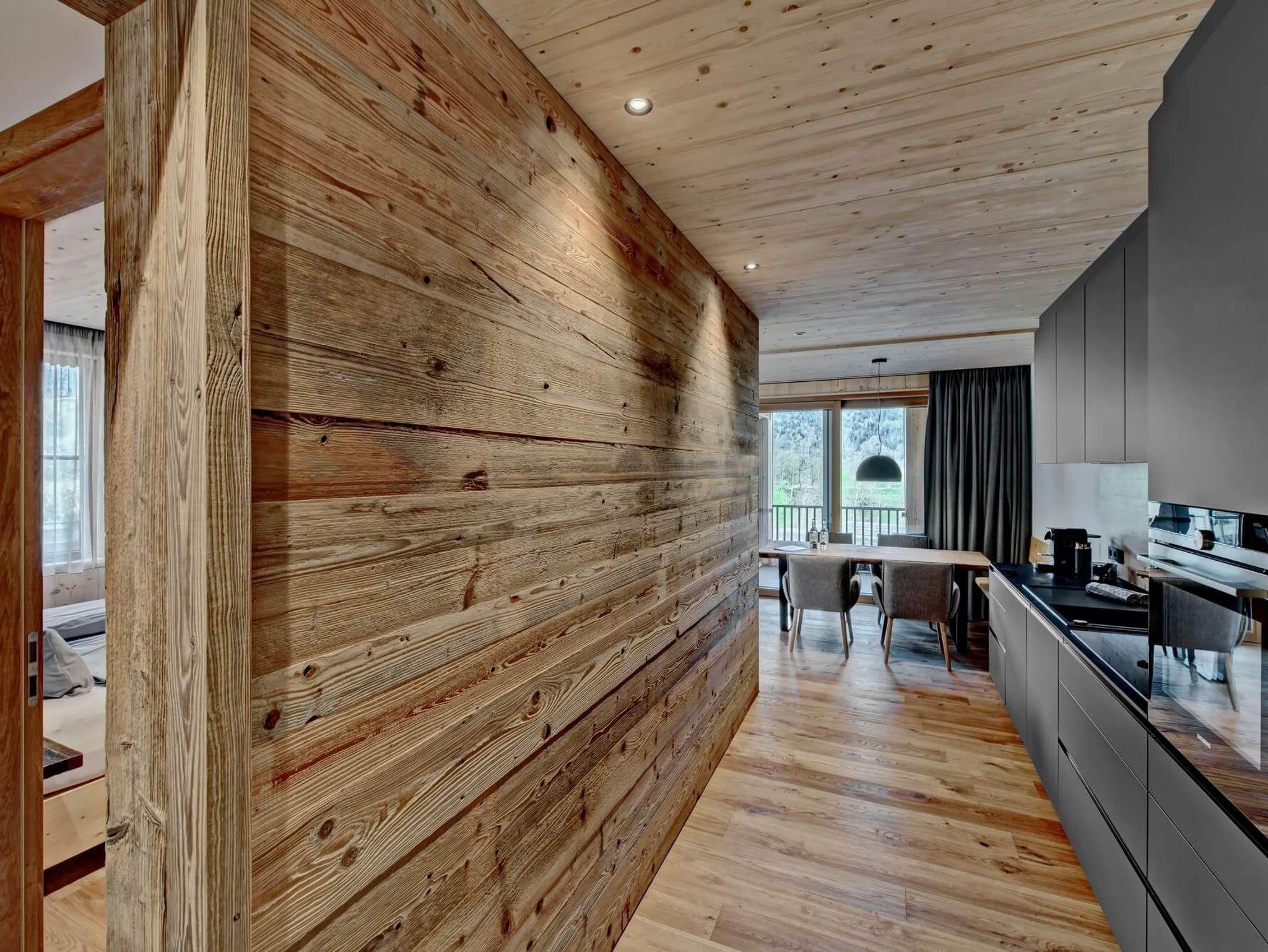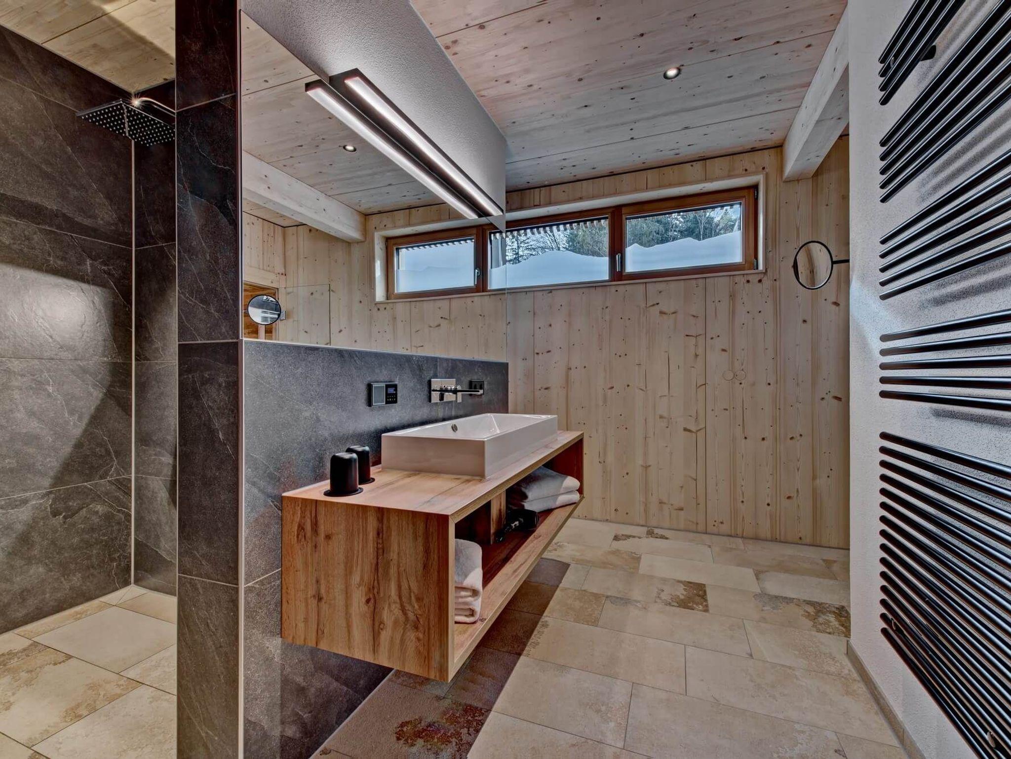 Genießen Sie den Ausblick auf der Loggia, entspannen auf dem hochwertigen Ledersofa und speisen an einer einzigartigen Tafel aus gebürsteter Platane. Nach einem Tag an der frischen Luft in dem Bergen genießen Sie die großzügige Regendusche in Ihrem Wohlfühltempel und erleben den Luxus einer eigenen Sauna im Chalet.
