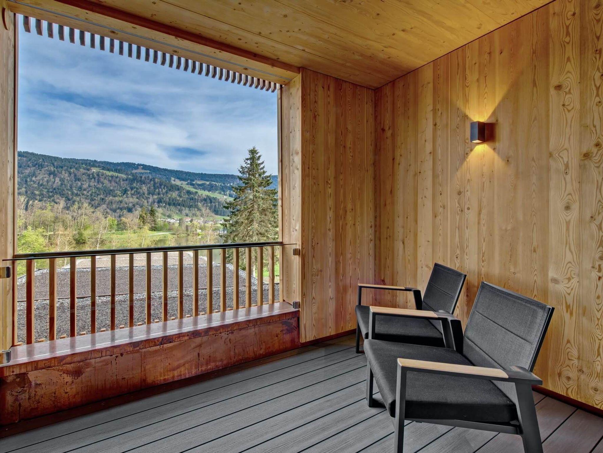 In jedem der Chalets empfängt Sie ein unverbauter Blick auf das Tal mit dem kleinen See, beschlossen von der bewaldeten Bergkette. Wanderwege beginnen direkt am Haus.