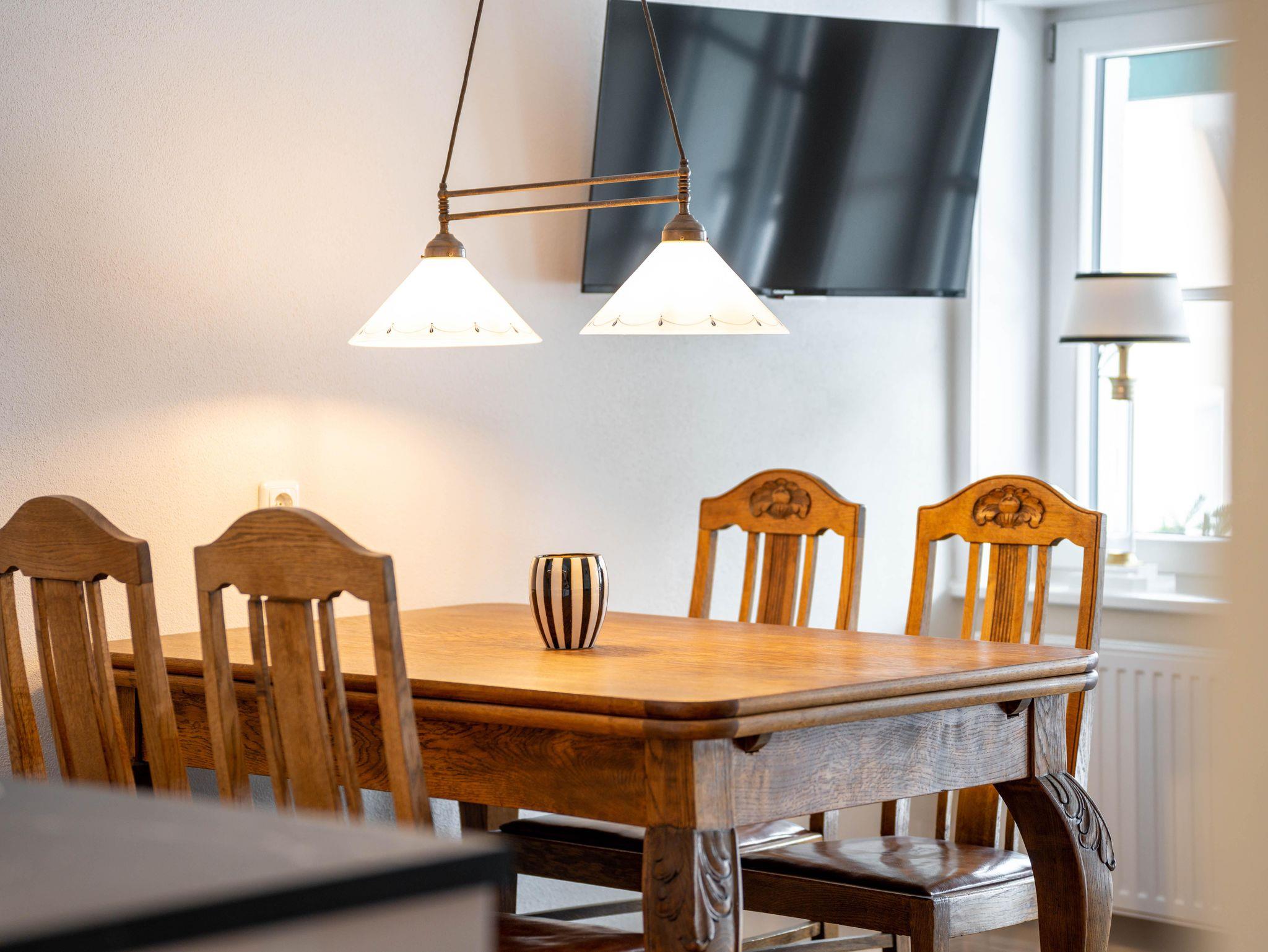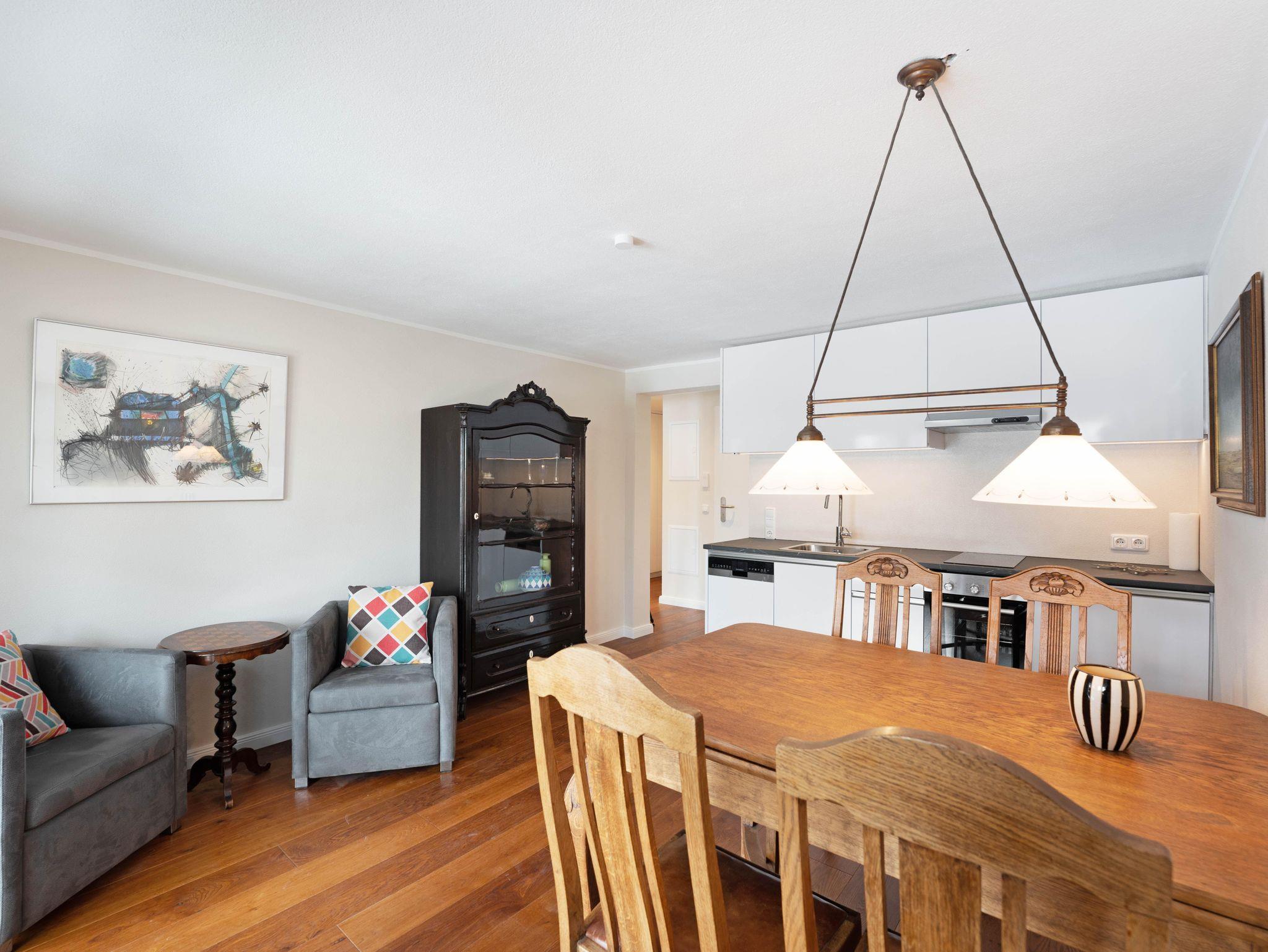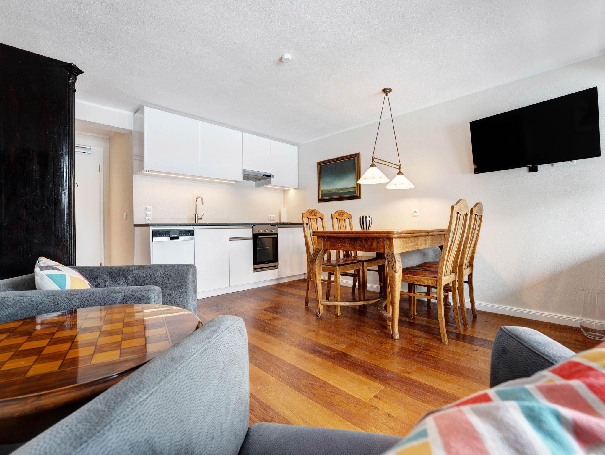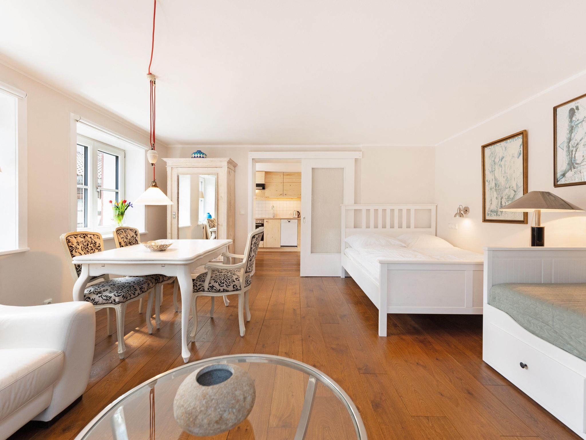 Das 2-Zimmer-Appartement Louis bietet mit 43 Quadratmetern reichlich Raum für bis zu zwei Personen. Wenn Sie es gern gemütlich mögen, mit einem Hauch schlichter Eleganz, dann werden Sie sich hier wohlfühlen. Für eine warme Atmosphäre sorgen ein gepflegter Parkettboden und stimmig arrangierte restaurierte Möbelstücke - jedes für sich ein Hingucker. Der Wohnbereich verfügt über eine moderne, vollausgestattete Küchenzeile, einen stilvollen Esstisch sowie zwei gemütliche Polstersessel mit Spieltisch, der zu einer Partie Schach oder Dame einlädt. Das separate Schlafzimmer ist mit einem Doppelbett (1,80 x 2,00 m) sowie Kleiderschrank und einem Beistelltisch ausgestattet.