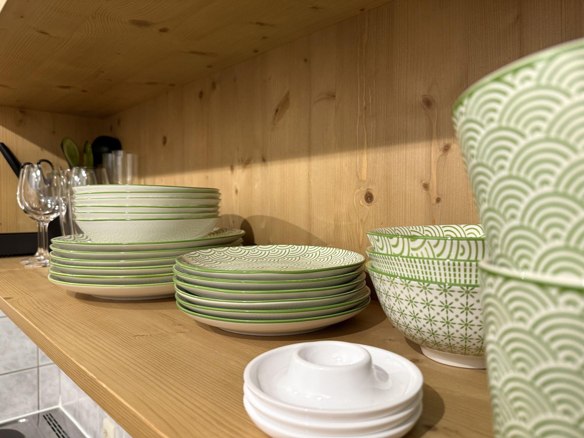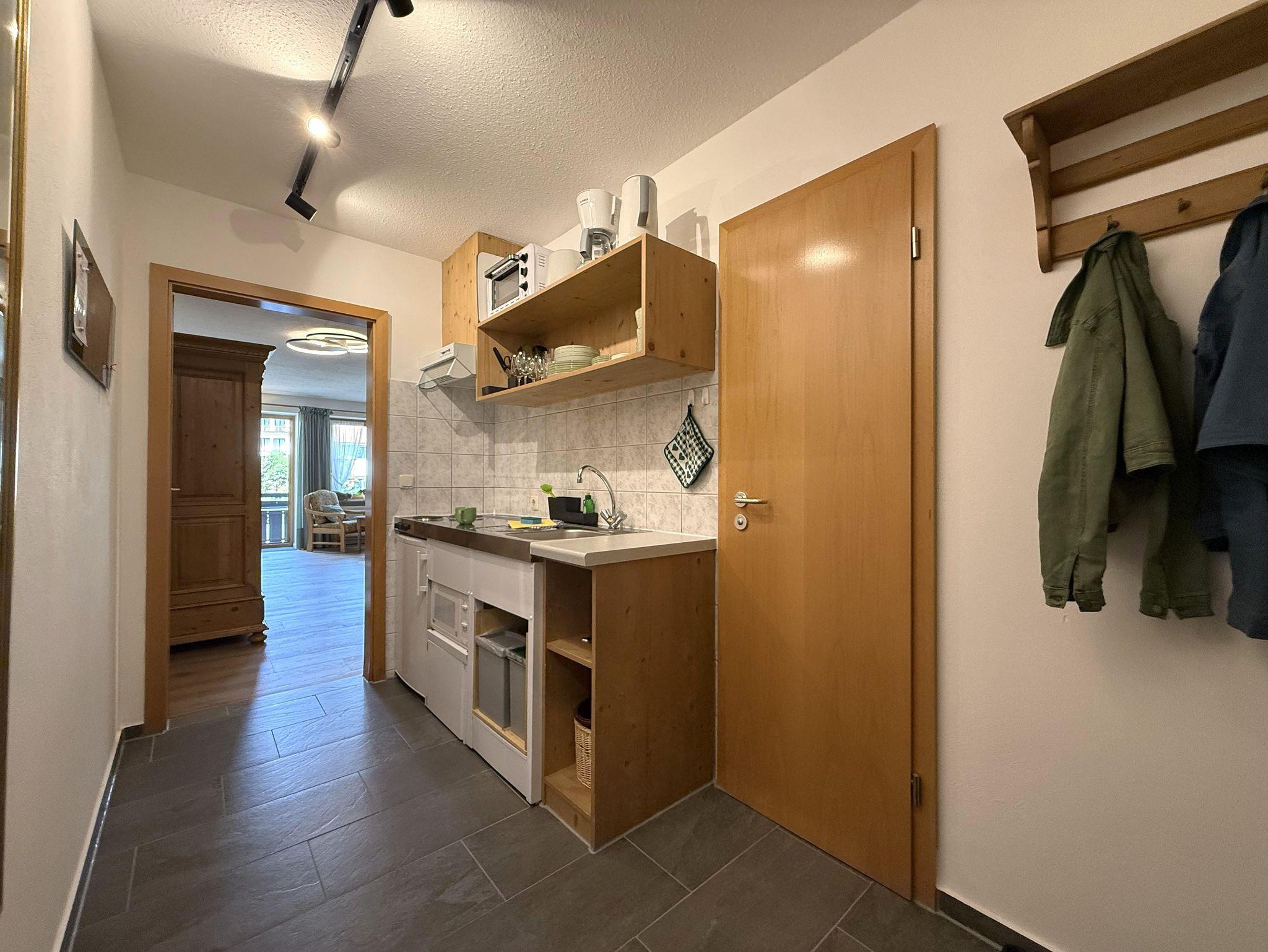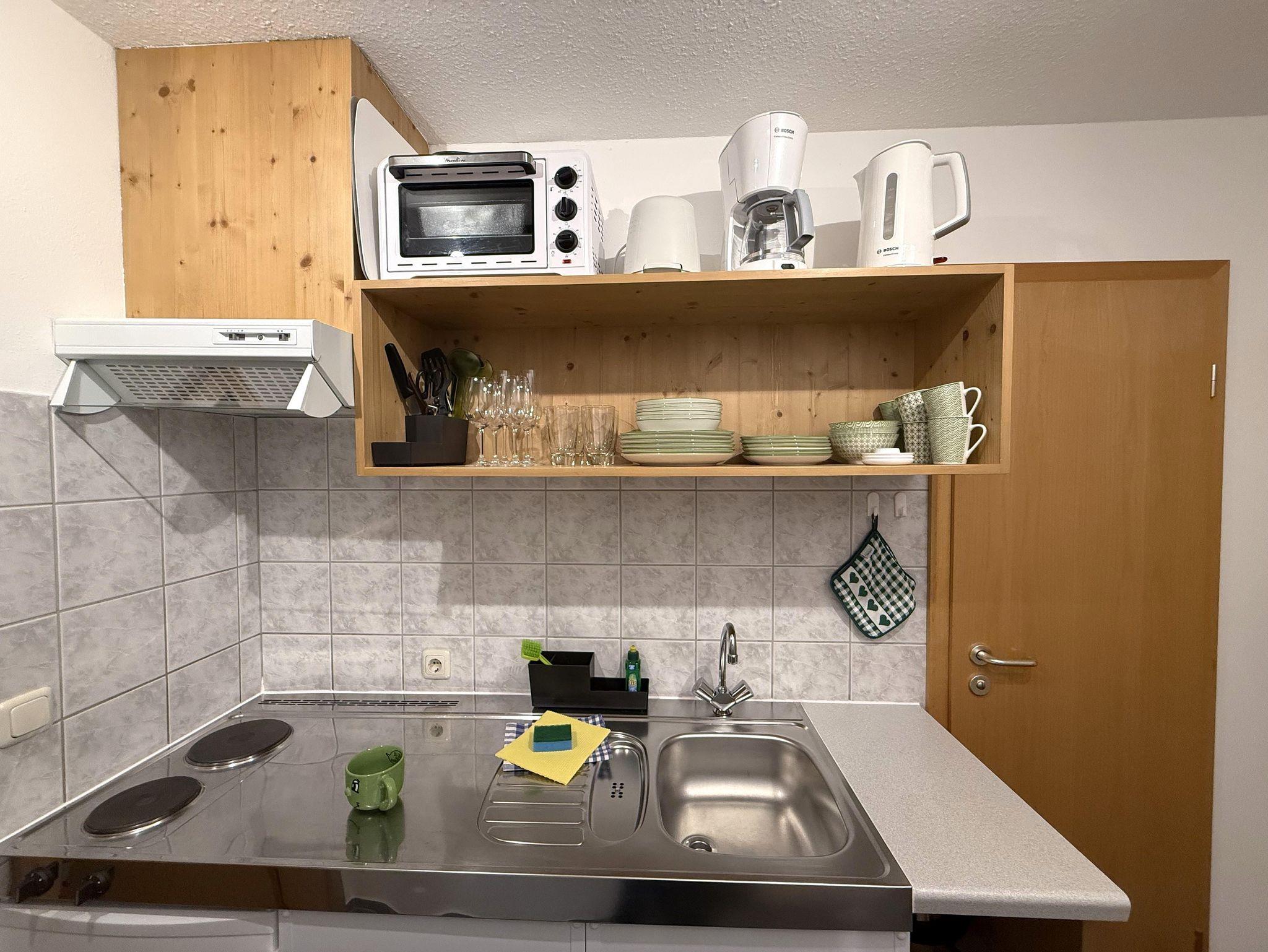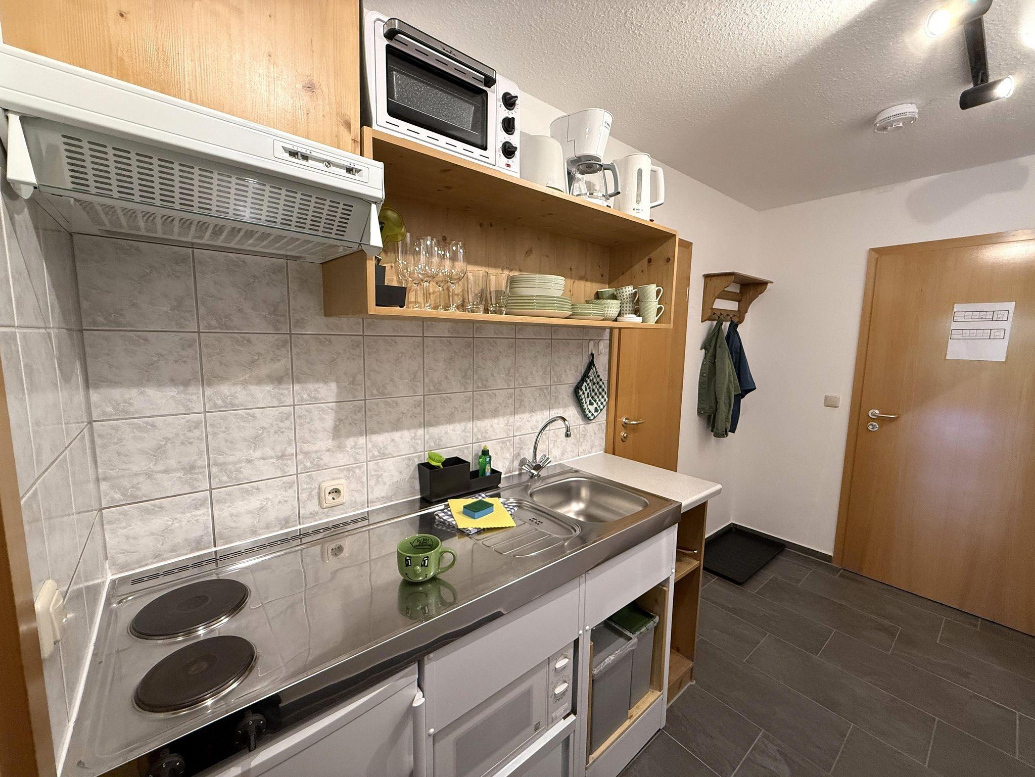 Im Eingangsbereich befindet sich die praktische und voll ausgestattete Küche mit Kühlschrank, Gefrierfach, Kochherd, Backofen, Wasserkocher, Toaster, Kaffeemaschine und ausreichend Geschirr.