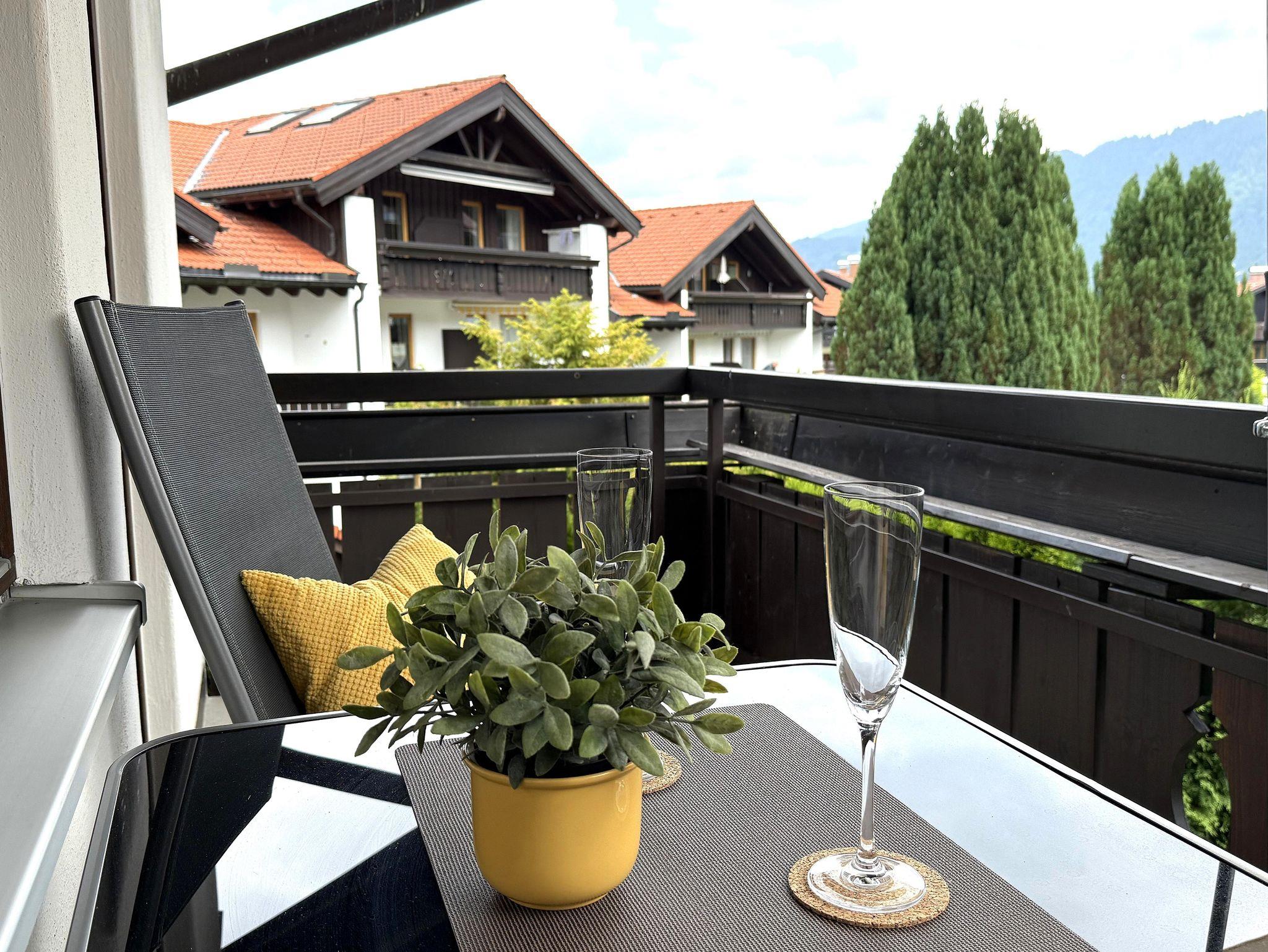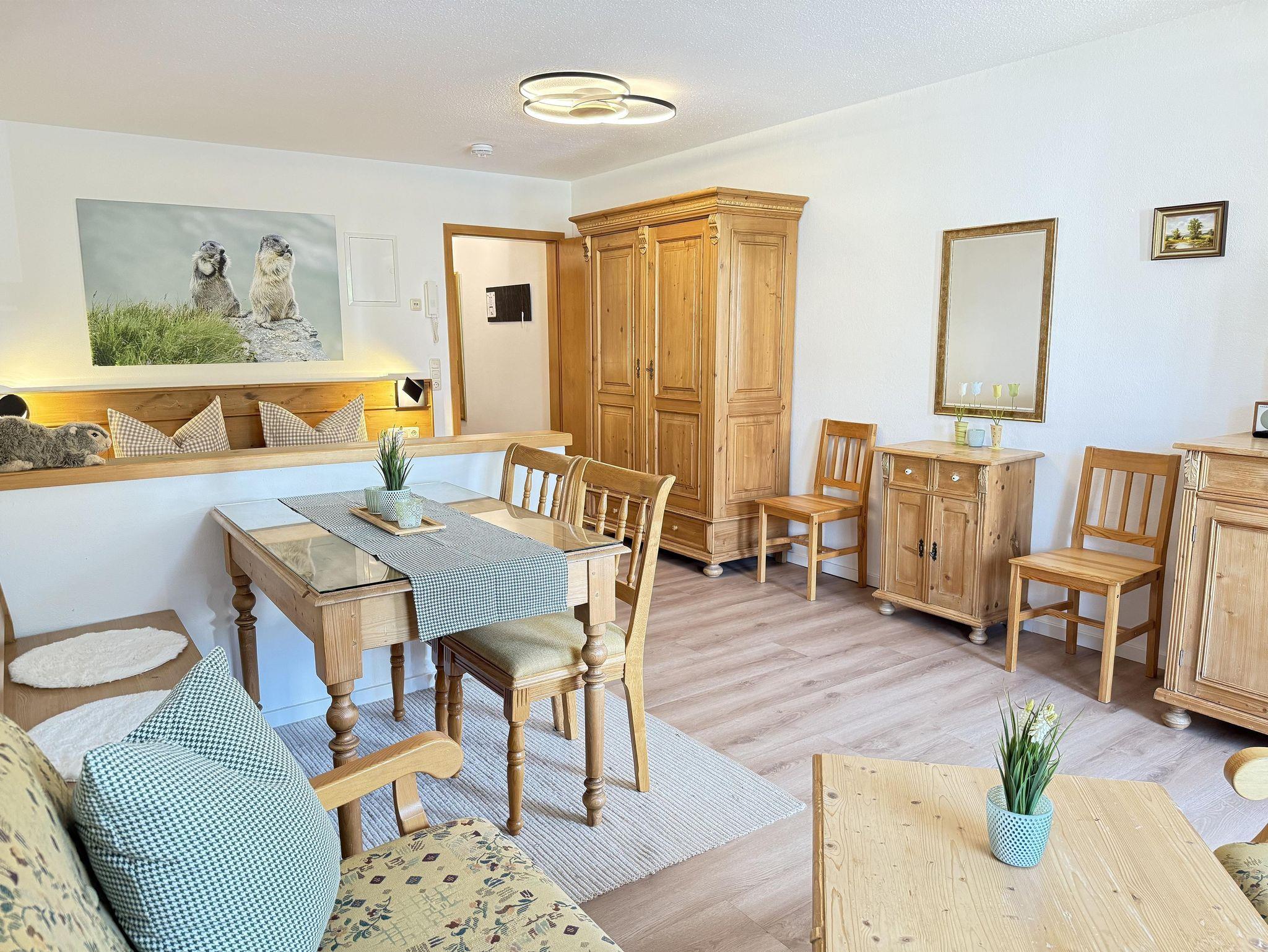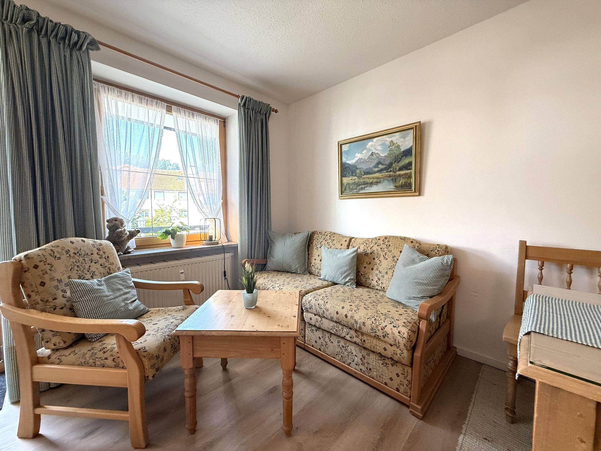 Mit Allgäuer Charme - in dem gemütlichen, großen Doppelbett bekommt man den erholsamen Schlaf, die Couch mit Schlaffunktion, der Essbereich und der überdachte möblierte Balkon laden zum Verweilen ein. WLAN, ein großer TV und ein modernes All-in-One Radio sorgen dabei für beste Unterhaltung.