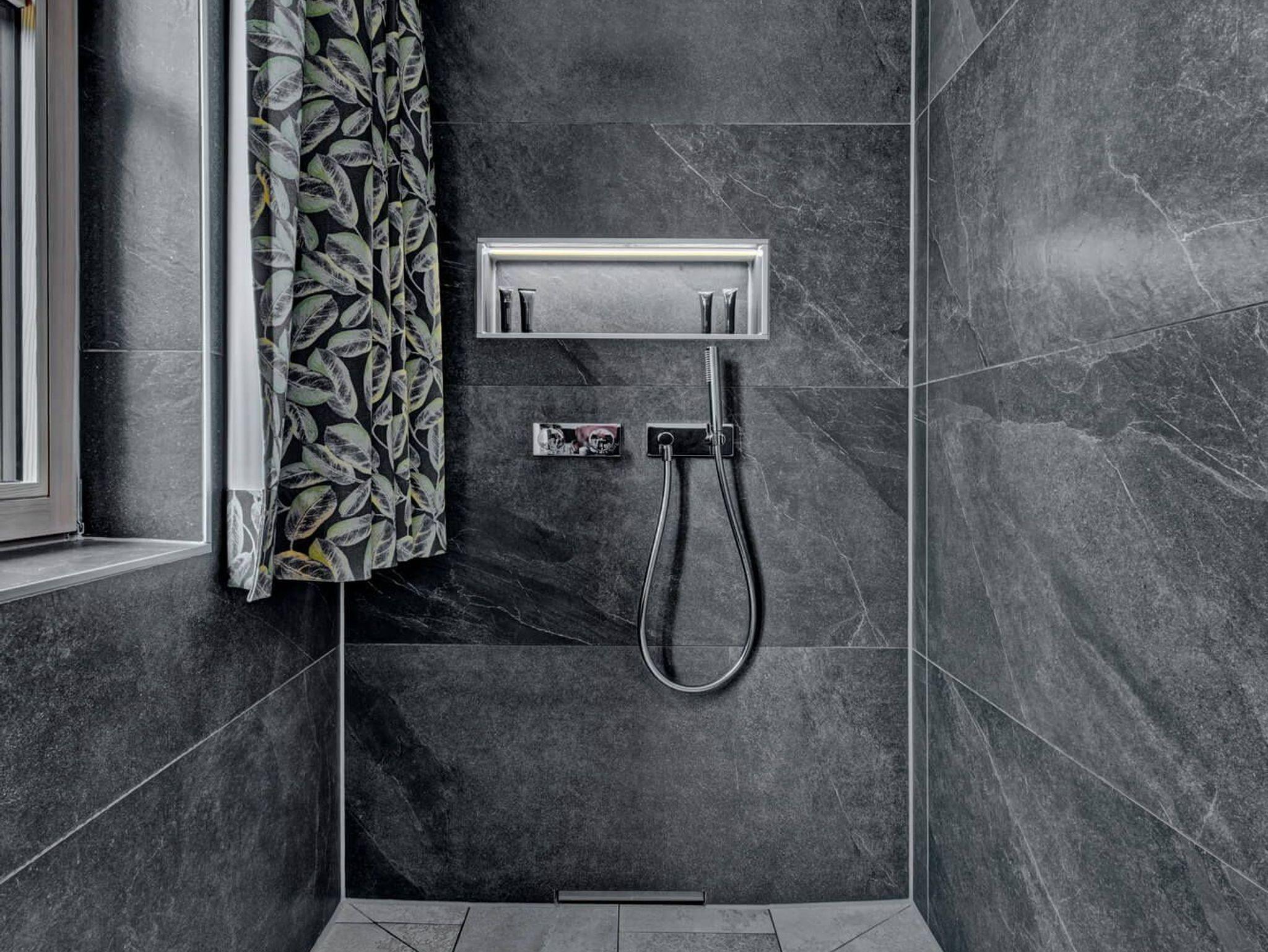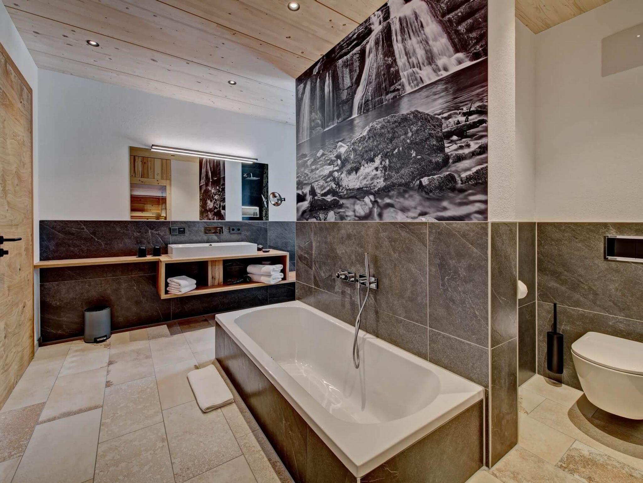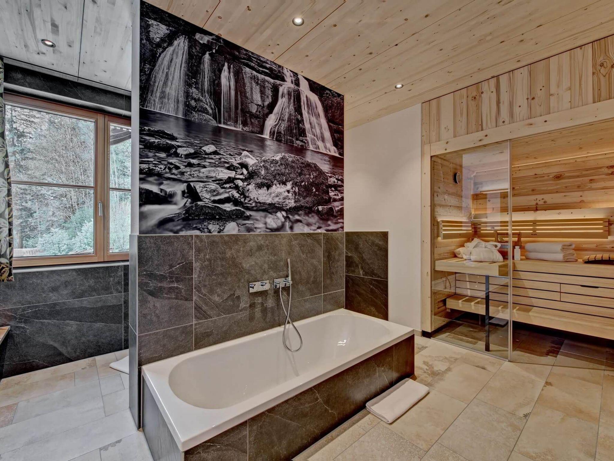 Im luxuriösen Bad mit eigener Sauna, Badewanne und Regendusche mit Blick auf den Wasserfall fehlt Ihnen nichts an Komfort.