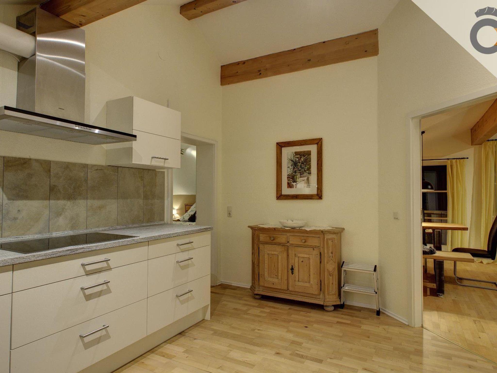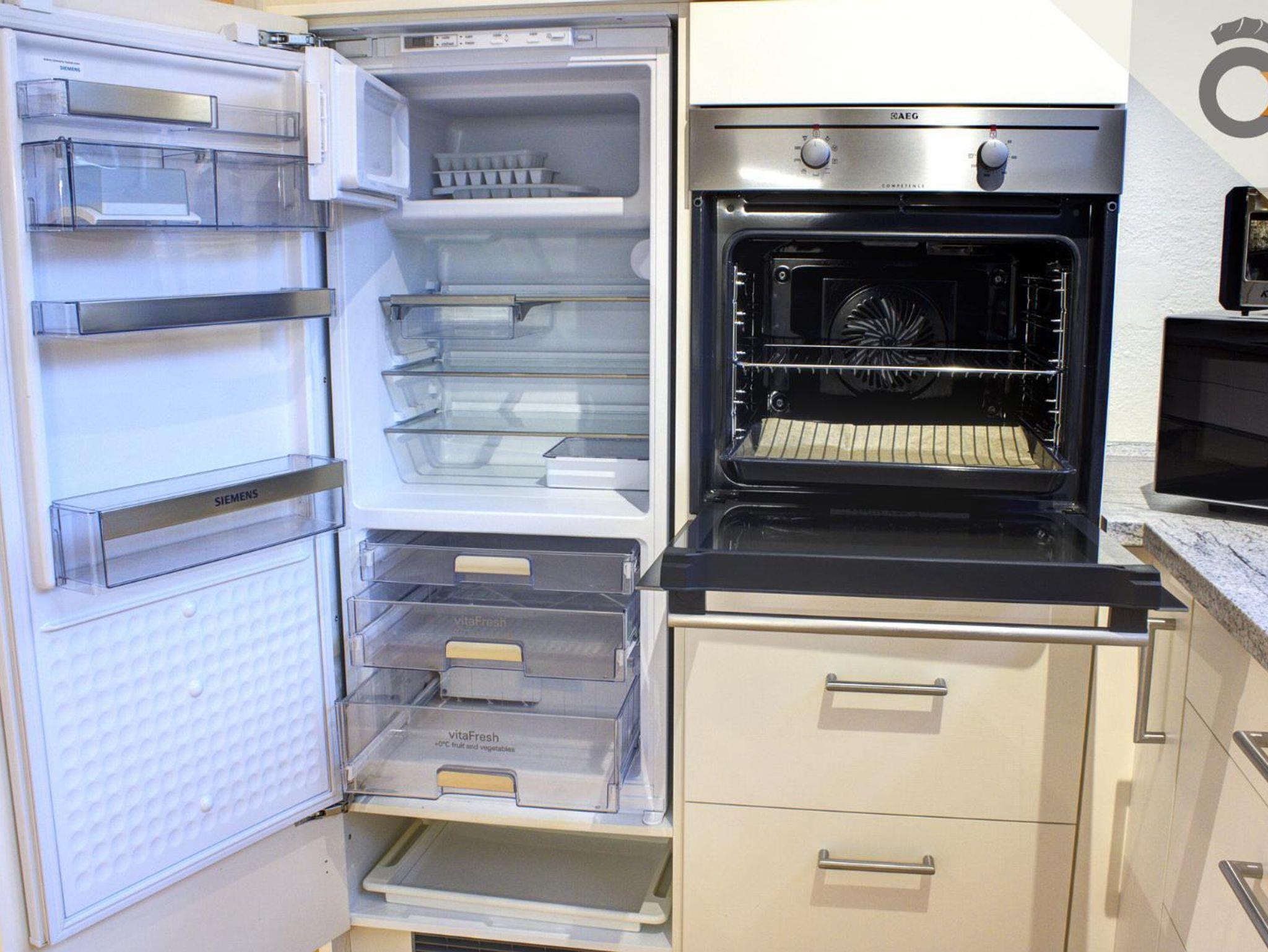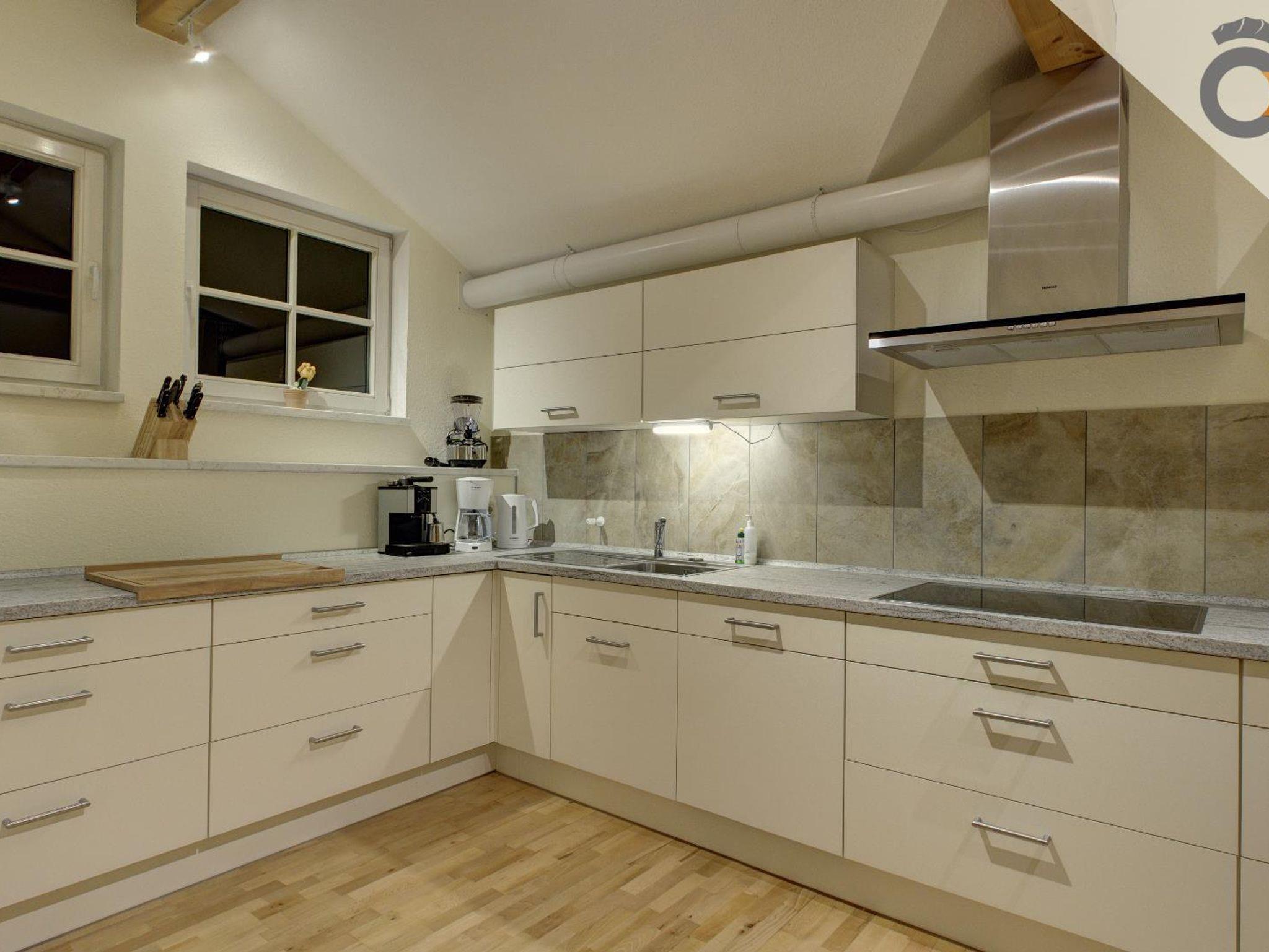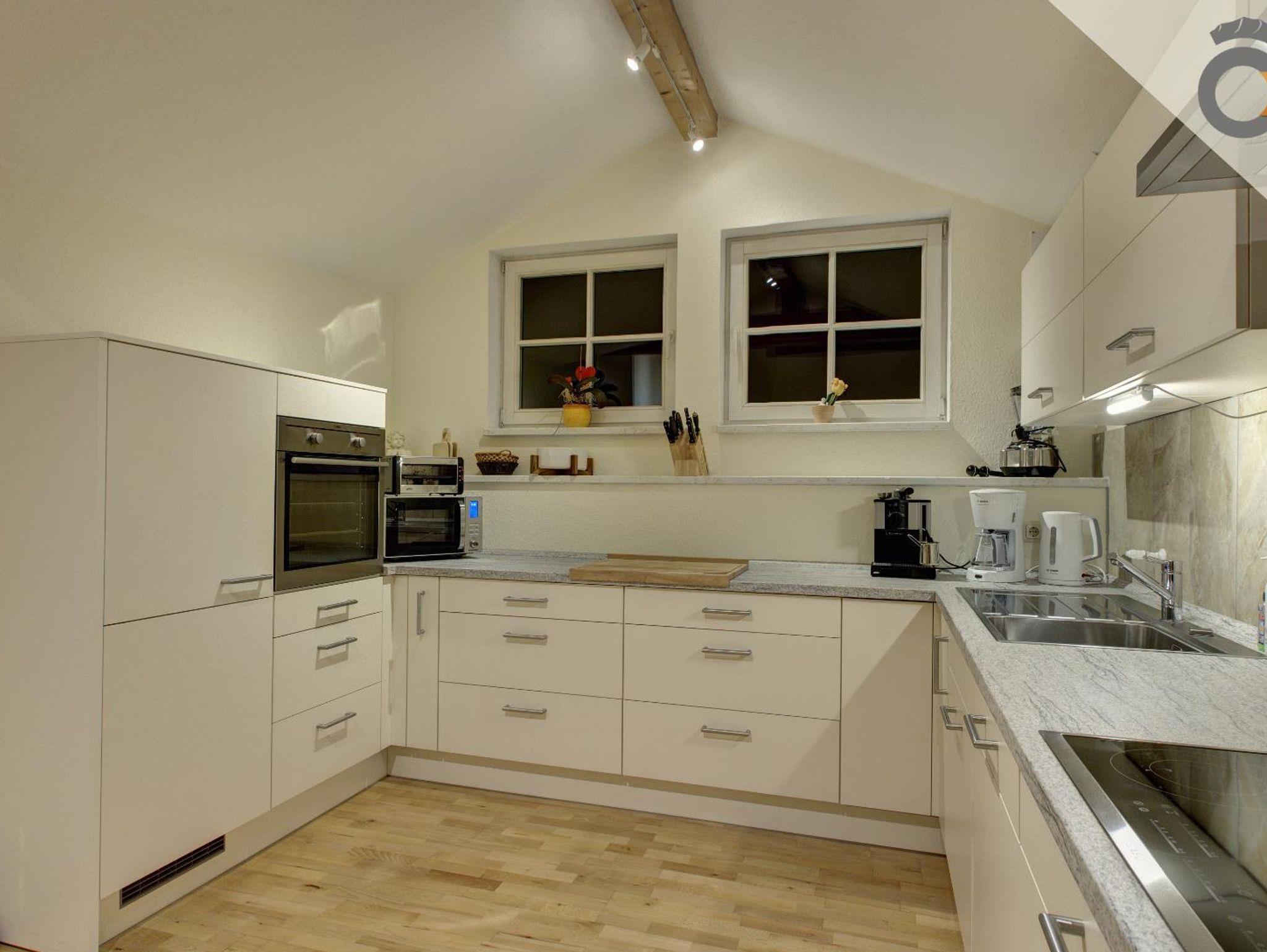 Die Ausstattung der Ferienwohnung beinhaltet: Waschmaschine, Spülmaschine, Kühlschrank mit Gefrierfach, Backofen, Cerankochfeld mit hochgelagertem E-Herd, Mikrowelle, Kaffeemaschine (Filtermaschine und Pad-Kaffeemaschine), Wasserkocher, Toaster, Fön, TV, Kinderhochstuhl.
