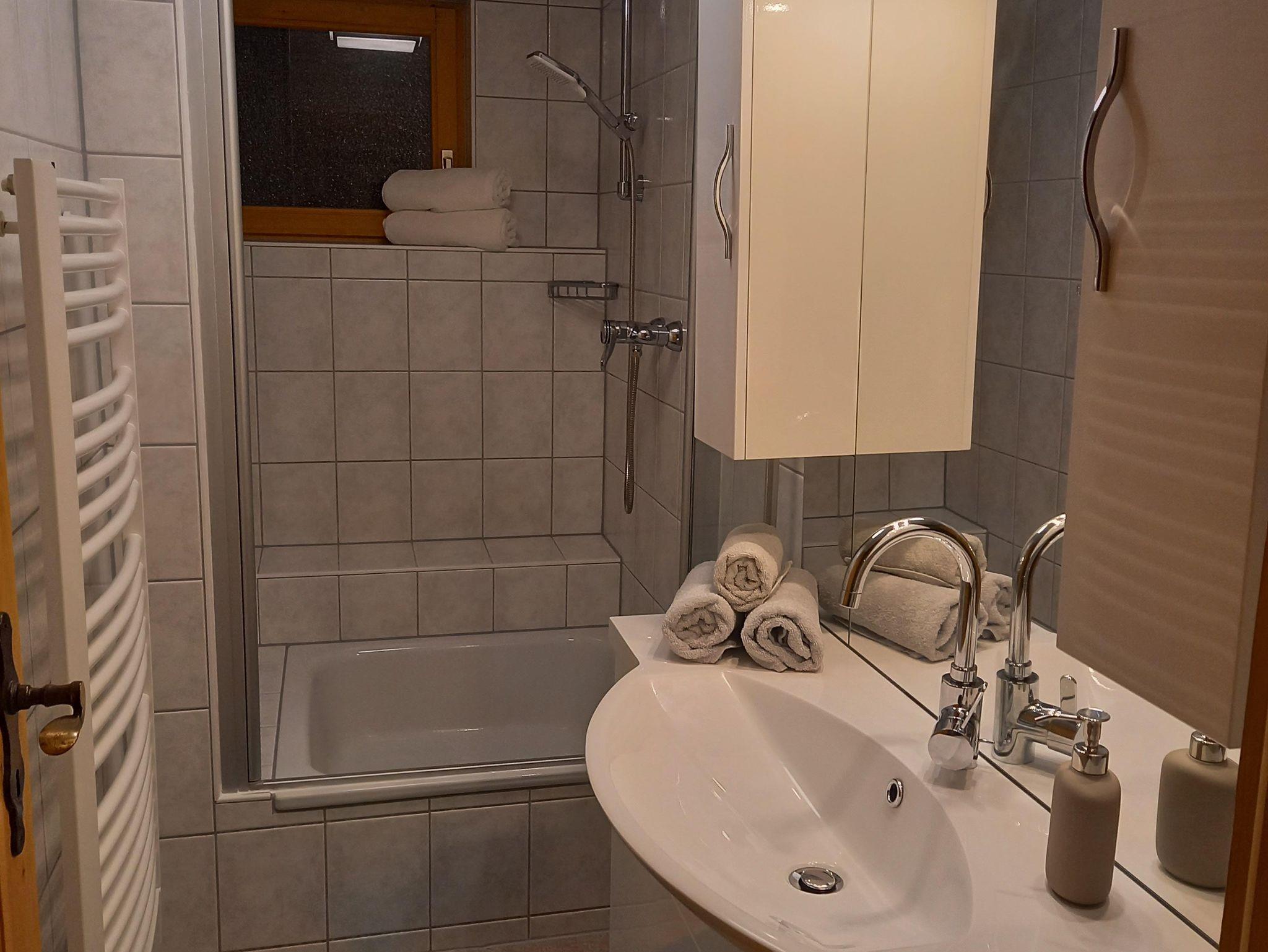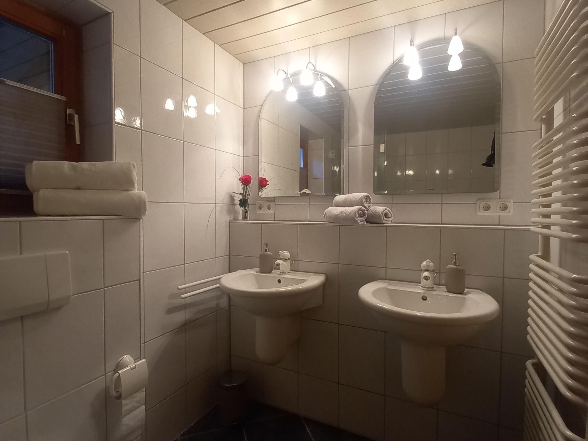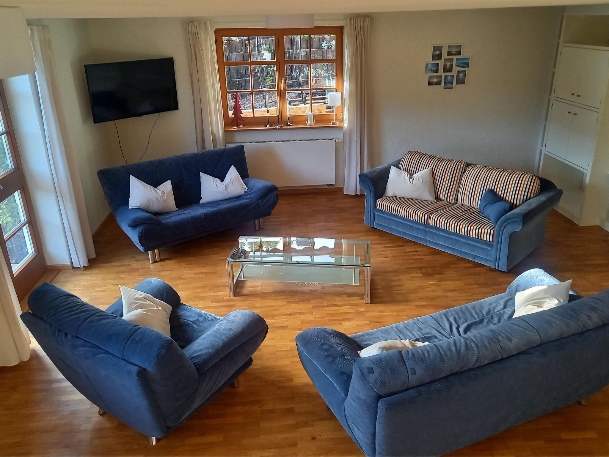 Im Erdgeschoss befinden sich das große helle Wohnzimmer mit Eckbank im Essbereich, kleiner Bar, gemütlichem Kachelofen mit Holzbank, mehrteiliger Sofasitzgruppe mit Glastisch, schwenkbarem Amazon TV und großem Schrank mit Spielen und Büchern. Hier sind 2 ausziehbare Schlafsofas vorhanden. Dieser Bereich hat ca.75m². Neben dem oberen Schlafzimmer befindet sich das Bad mit Doppelwaschbecken und einer Dusch- Badewannenkombination.