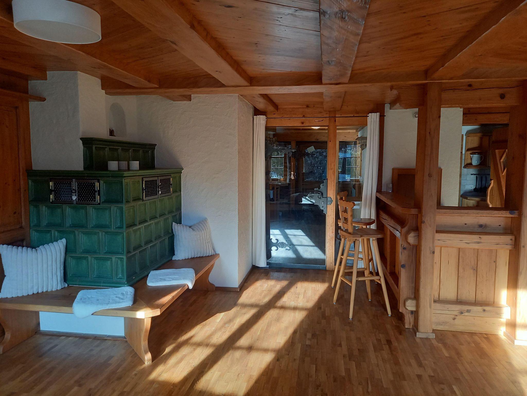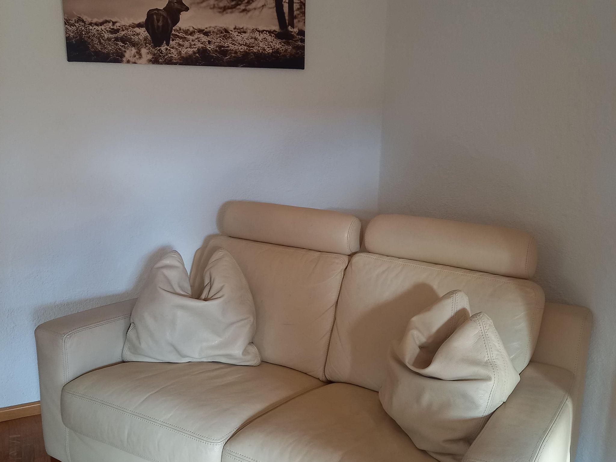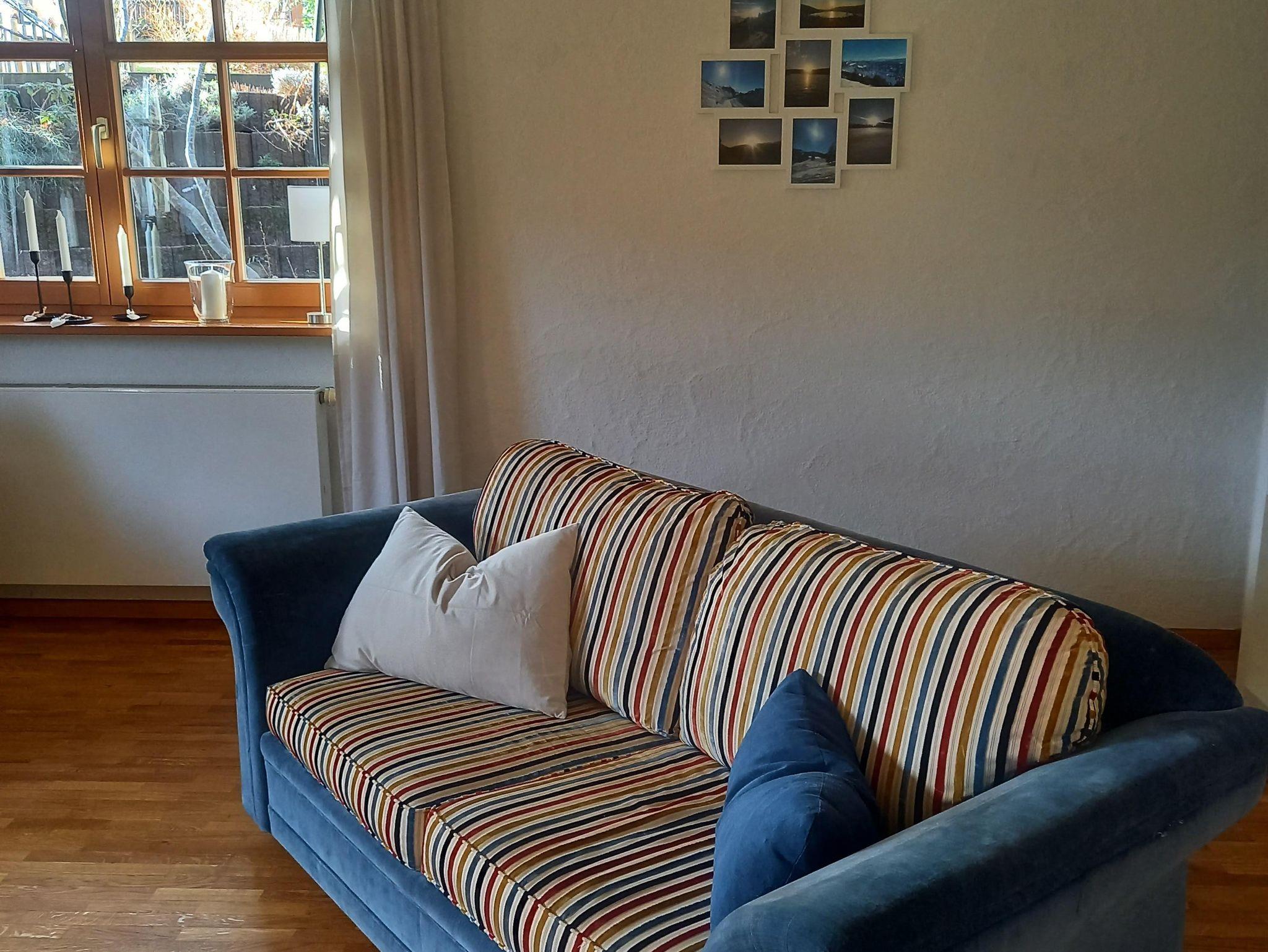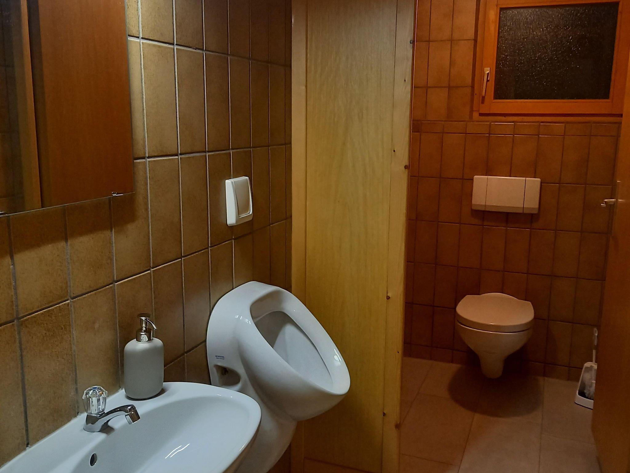 Im Erdgeschoss befinden sich das große helle Wohnzimmer mit Eckbank im Essbereich, kleiner Bar, gemütlichem Kachelofen mit Holzbank, mehrteiliger Sofasitzgruppe mit Glastisch, schwenkbarem Amazon TV und großem Schrank mit Spielen und Büchern. Hier sind 2 ausziehbare Schlafsofas vorhanden. Dieser Bereich hat ca.75m². Neben dem oberen Schlafzimmer befindet sich das Bad mit Doppelwaschbecken und einer Dusch- Badewannenkombination.