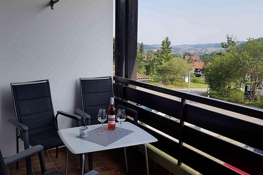 Auf dem Balkon sind Sitzmöbeln vorhanden.