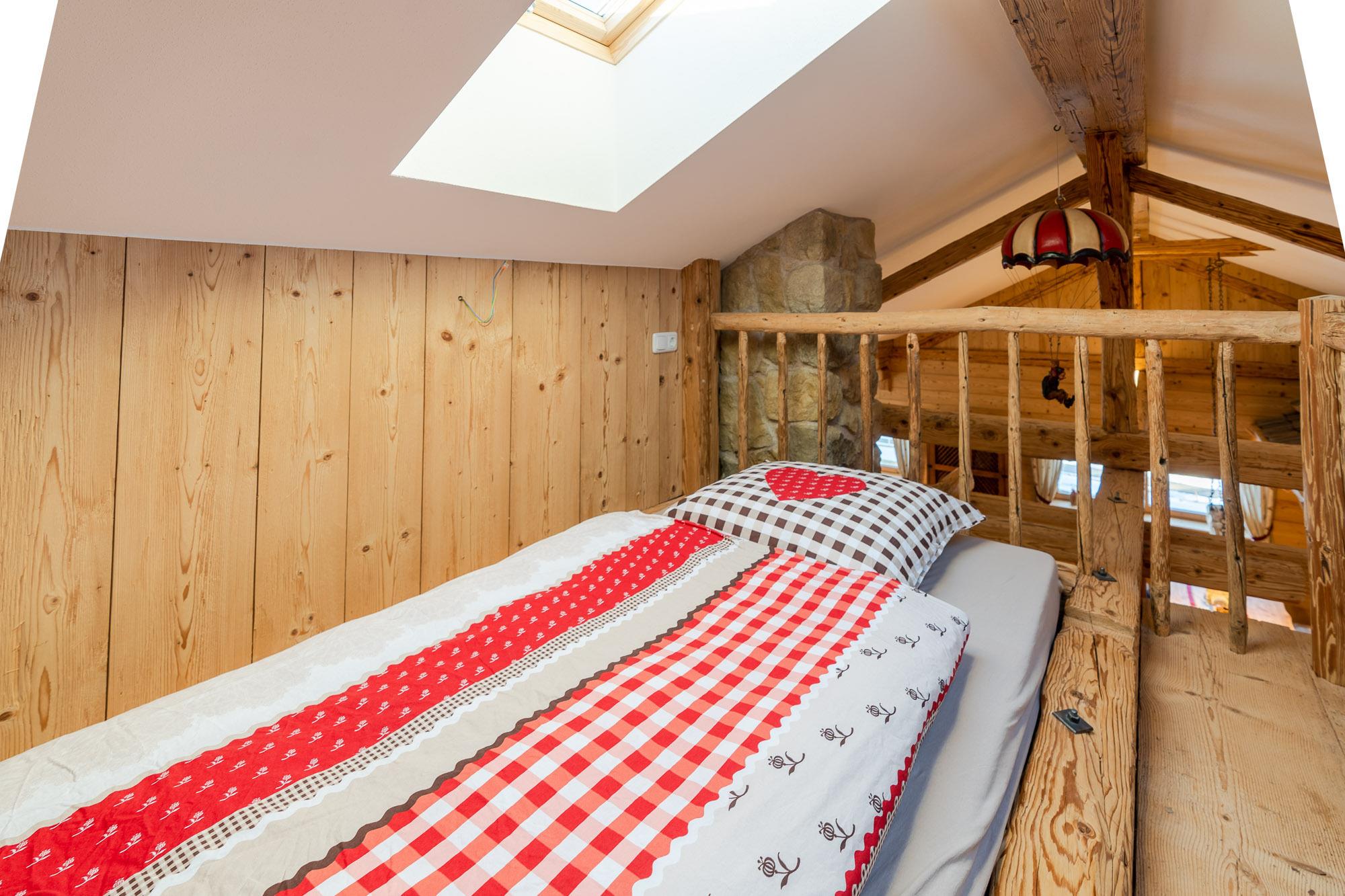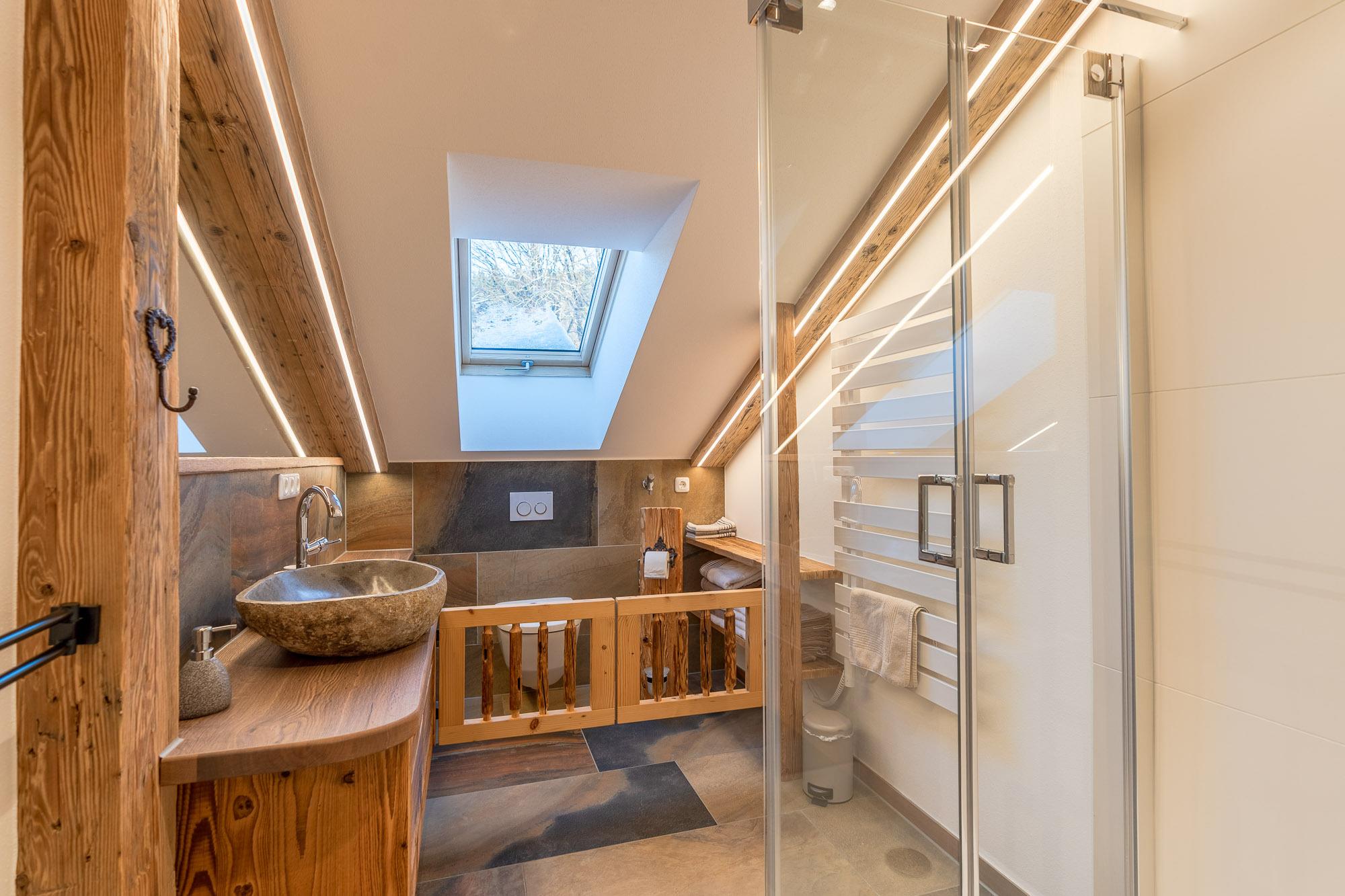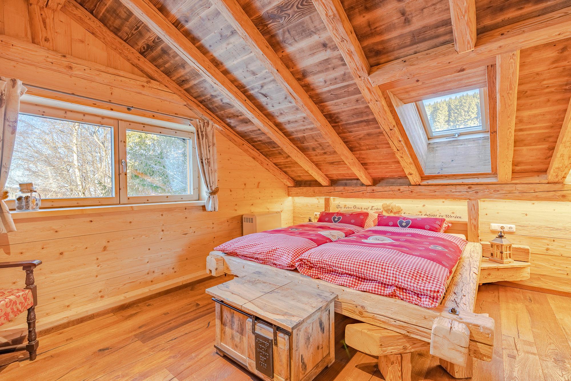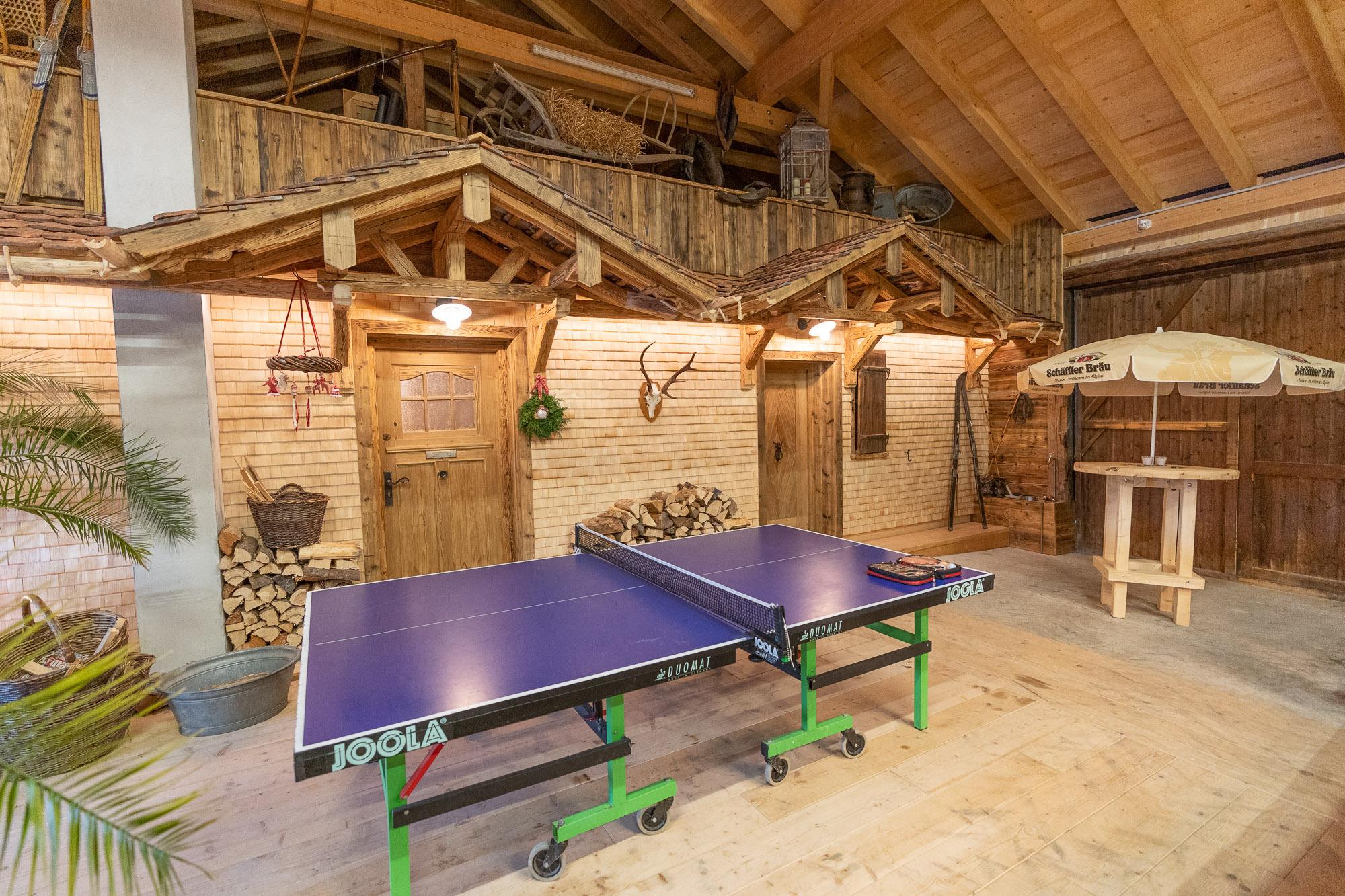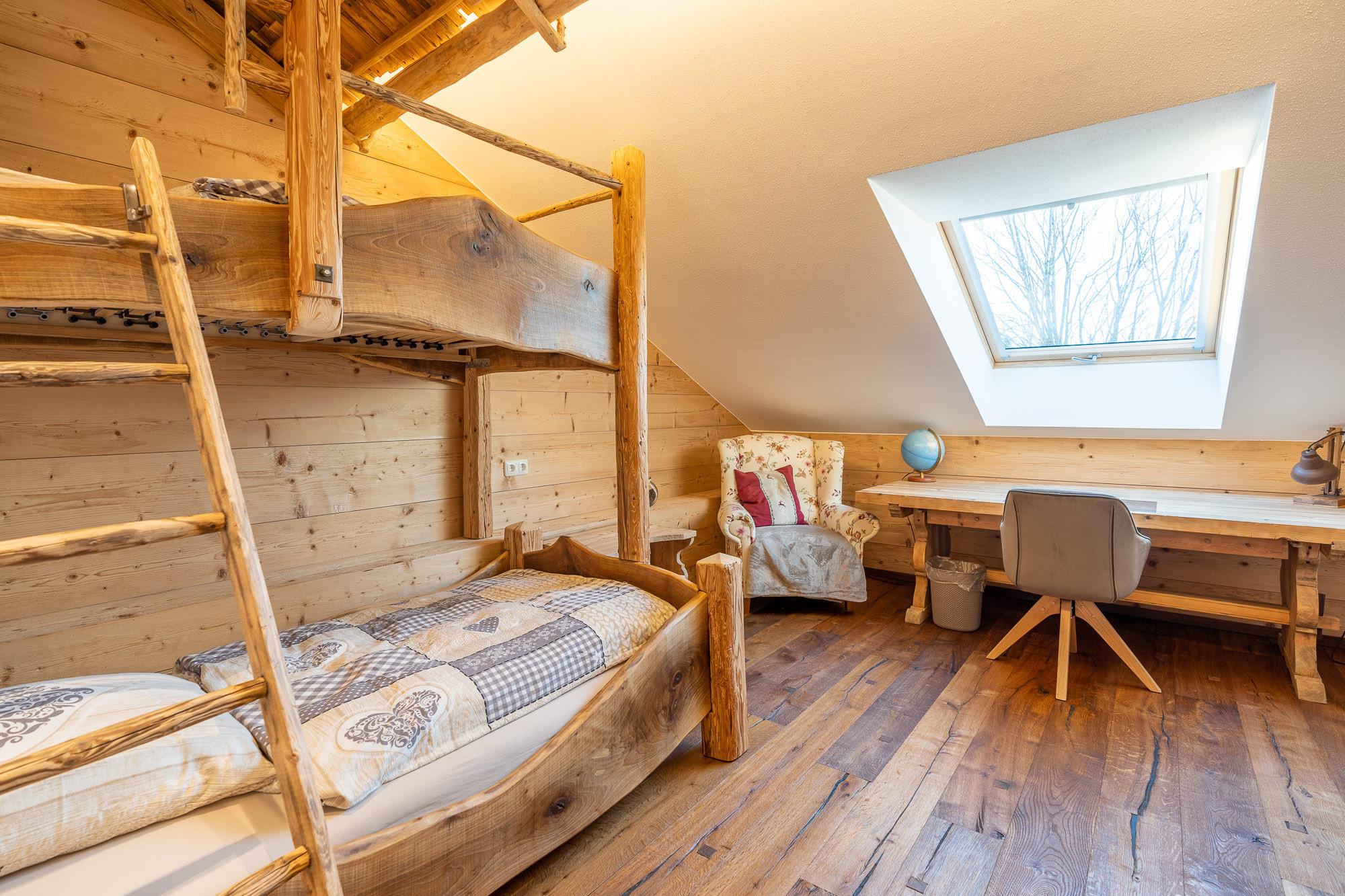 Die Ferienwohnung liegt im Dachgeschoss und hat ca.120m² Wohnfläche. Der besondere Hüttencharakter entsteht durch die rustikalen Schindeldächer, die das Schlafzimmerhüttle und das WC-Häusle schmücken. Im großem Wohn- Essbereich mit Kaminofen können Sie die Ruhe und die Aussicht in die Natur genießen. Zur Wohnung gehört ein Schlafzimmer mit Doppelbett, ein Schlafzimmer mit Stockbett sowie ein Bett auf der Empore. Zur Wohnung gehört die Nutzung der Scheune mit Billardtisch, Tischkicker, Tischtennisplatte und viel mehr.