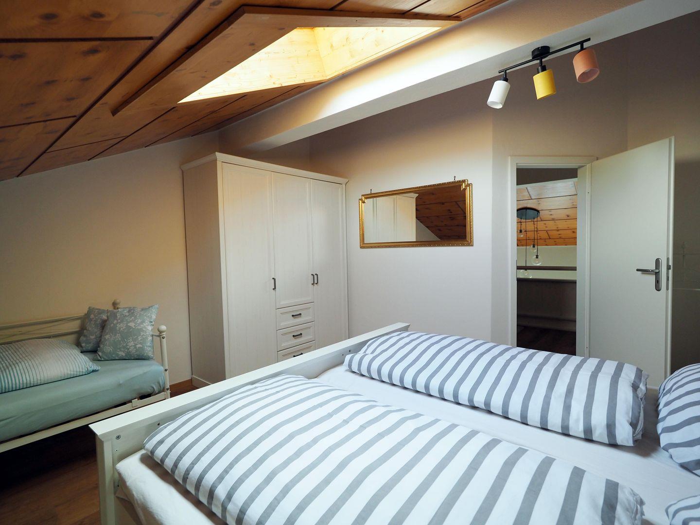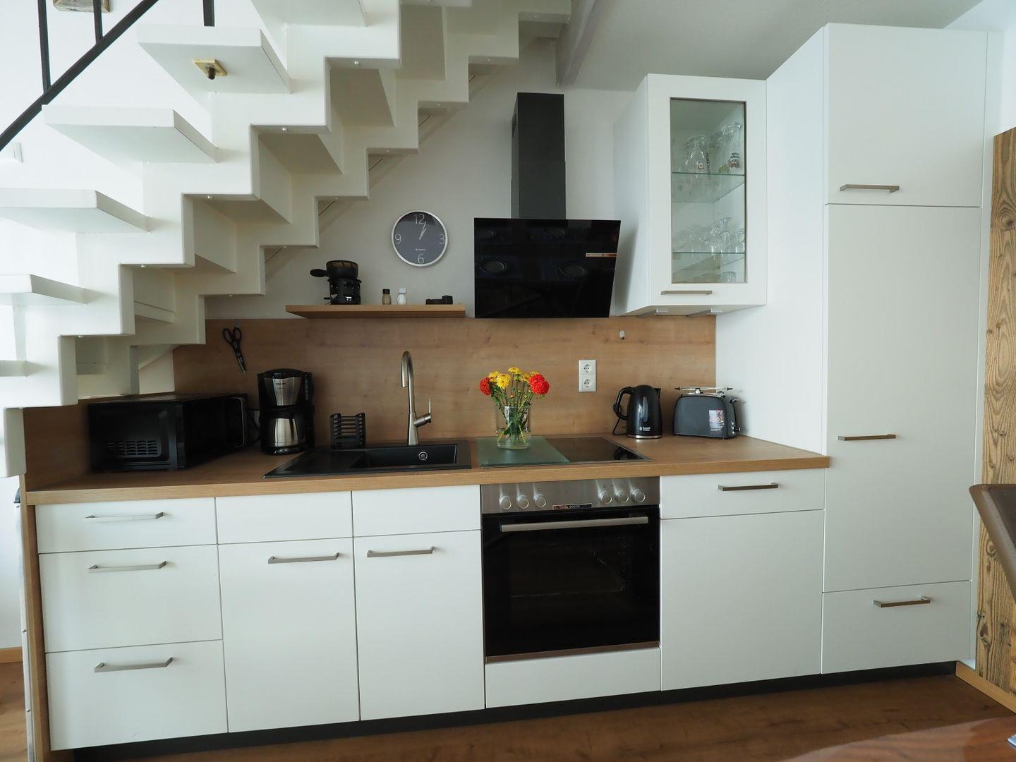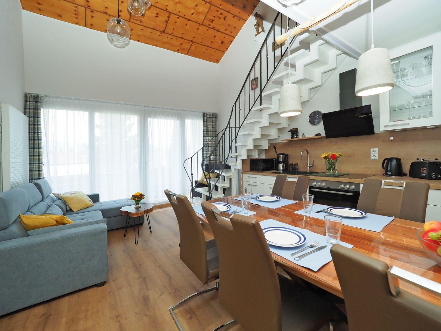 Die Wohnung hat 69 qm, jedoch aufgrund der Dachschräge im OG eine Bodenfläche von etwa 78 qm. Durch die raffinierte Aufteilung und die funktionale Ausstattung ist die Ferienwohnung für bis zu 6 Personen geeignet.