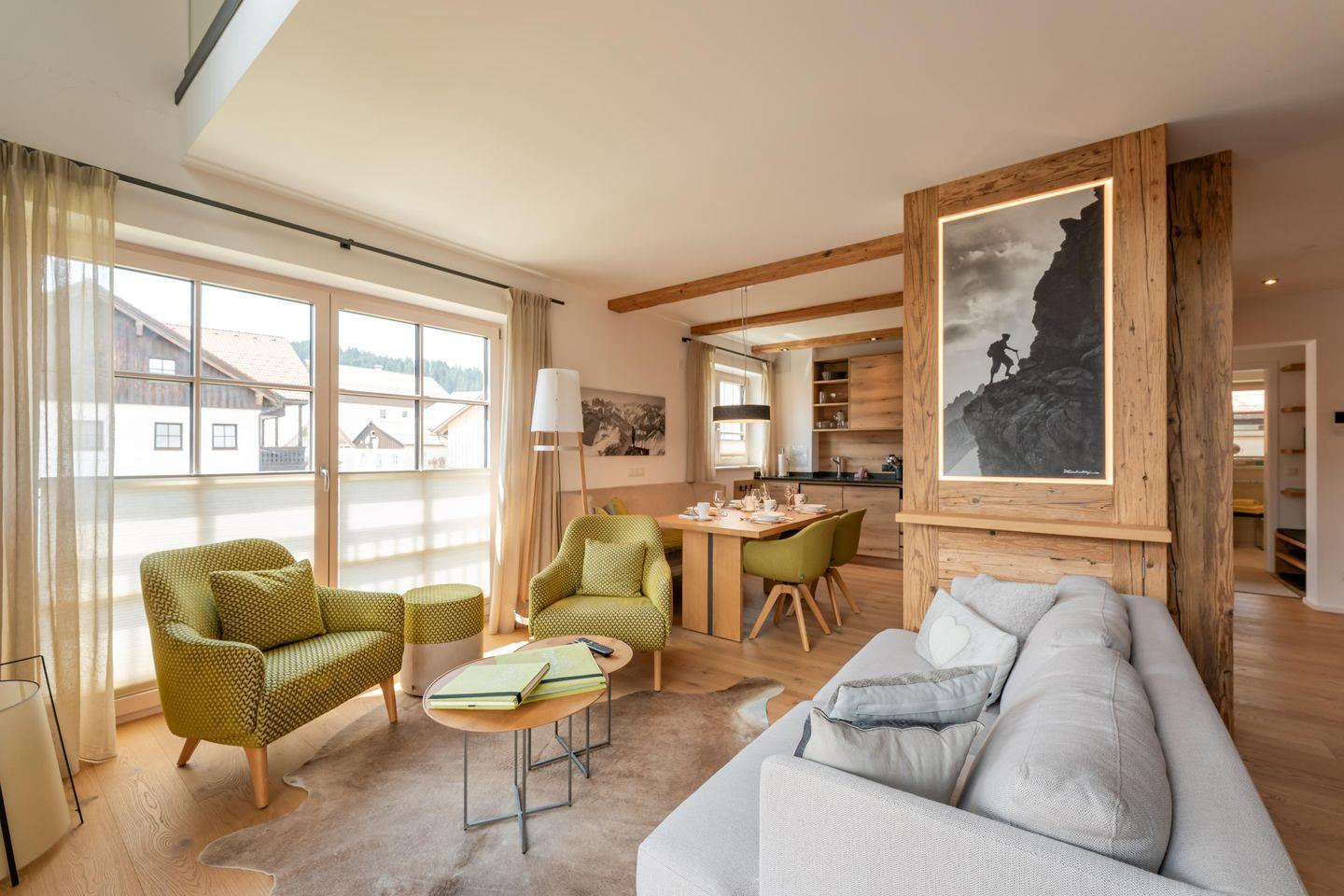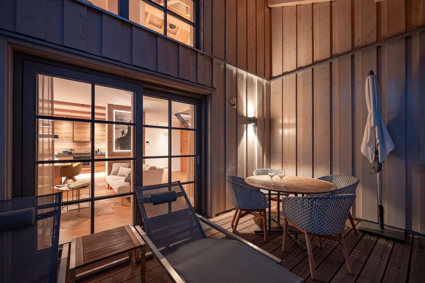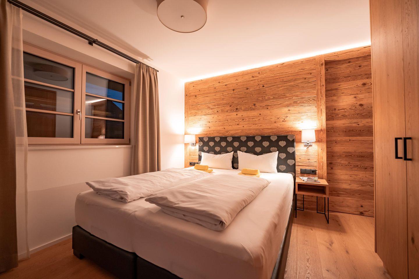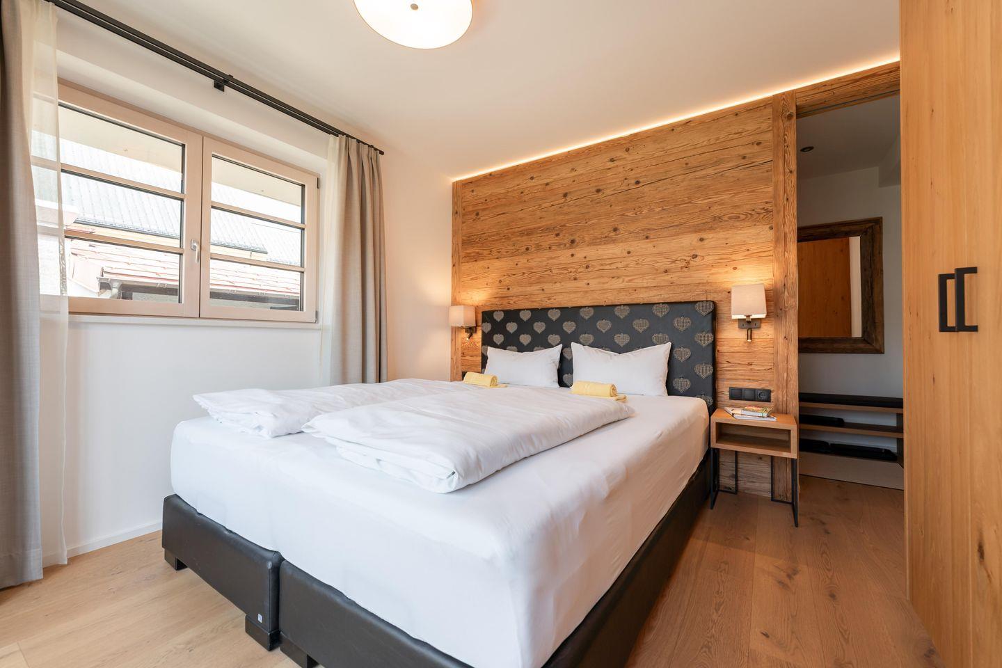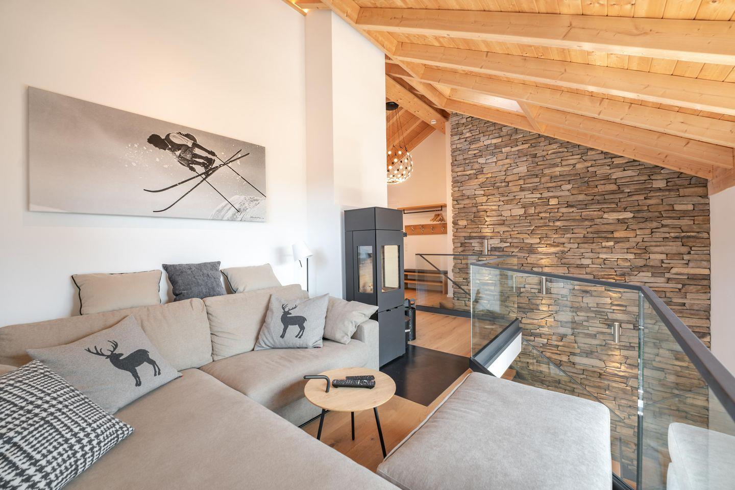 Das Apartment verfügt über zwei gemütliche Schlafzimmer, ein großzügiges Wohnzimmer mit Zugang zum überdachten Balkon, einen einladenden Essbereich mit voll ausgestatteter Designküche, zwei moderne Luxus-Bäder sowie ein Gäste-WC und eine kuschlige Lounge-Ecke mit Kaminofen.