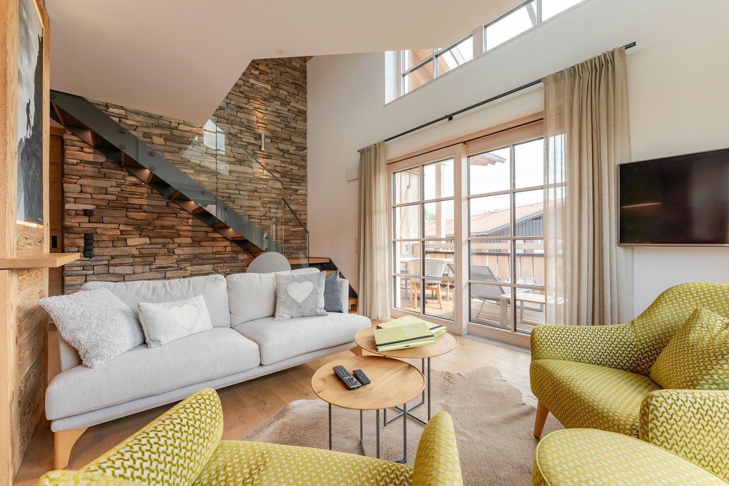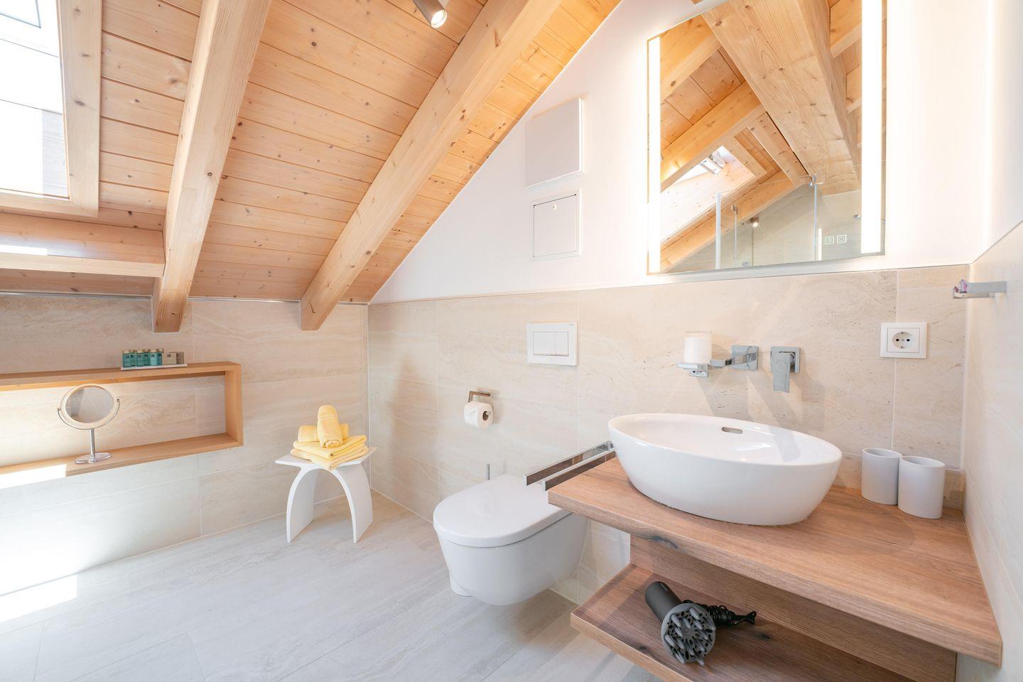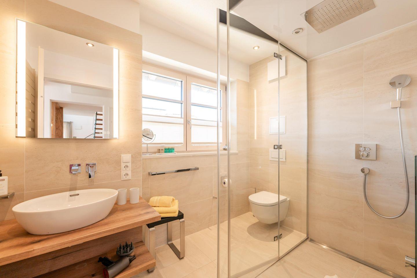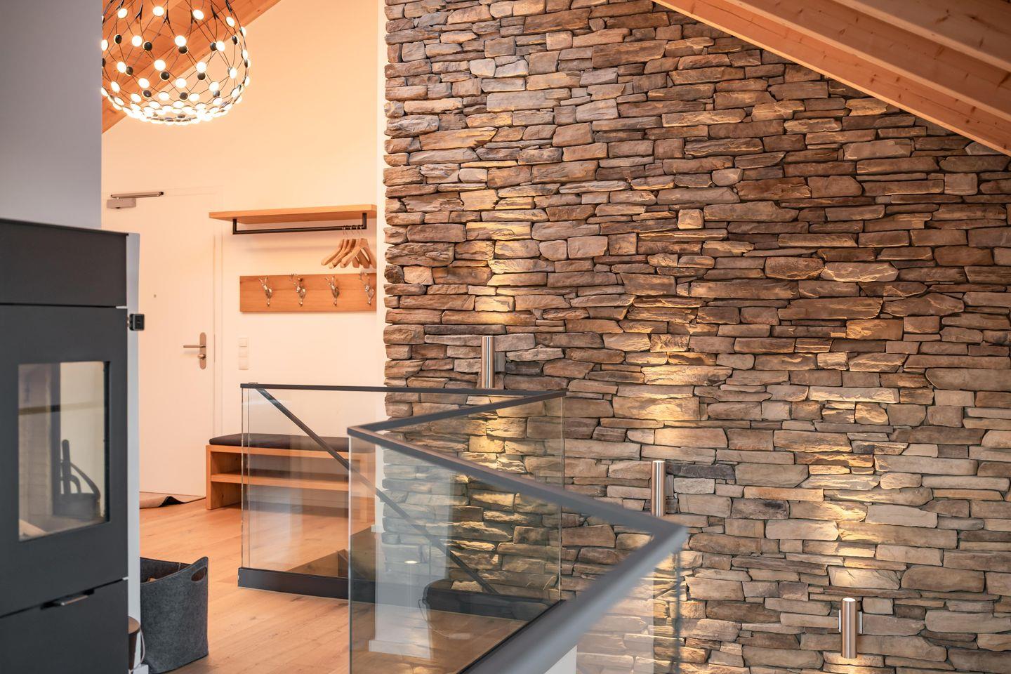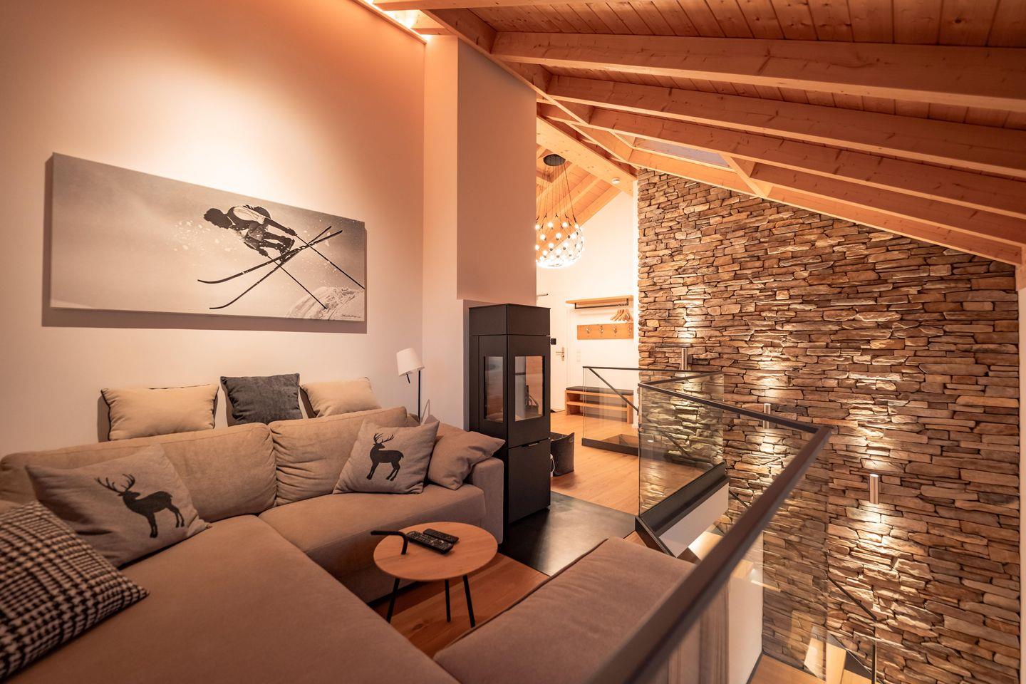 Eines der Highlights der Wohnung ist die illuminierte Steinwand, über deren Treppe Sie in den oberen Wohnbereich gelangen. Hier finden Sie eine zweite Wohnebene mit einem geräumigen Schlafzimmer (Boxspring-Doppelbett in Überlänge, Smart-TV, großer Kleiderschrank, Schreibtisch und Minibar) sowie einem zusätzlichen Bad mit Dusche/WC. Ideal für zwei Paare, da sich auf der oberen Ebene ein zweiter separater Eingang befindet.