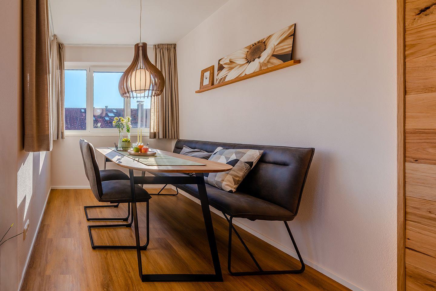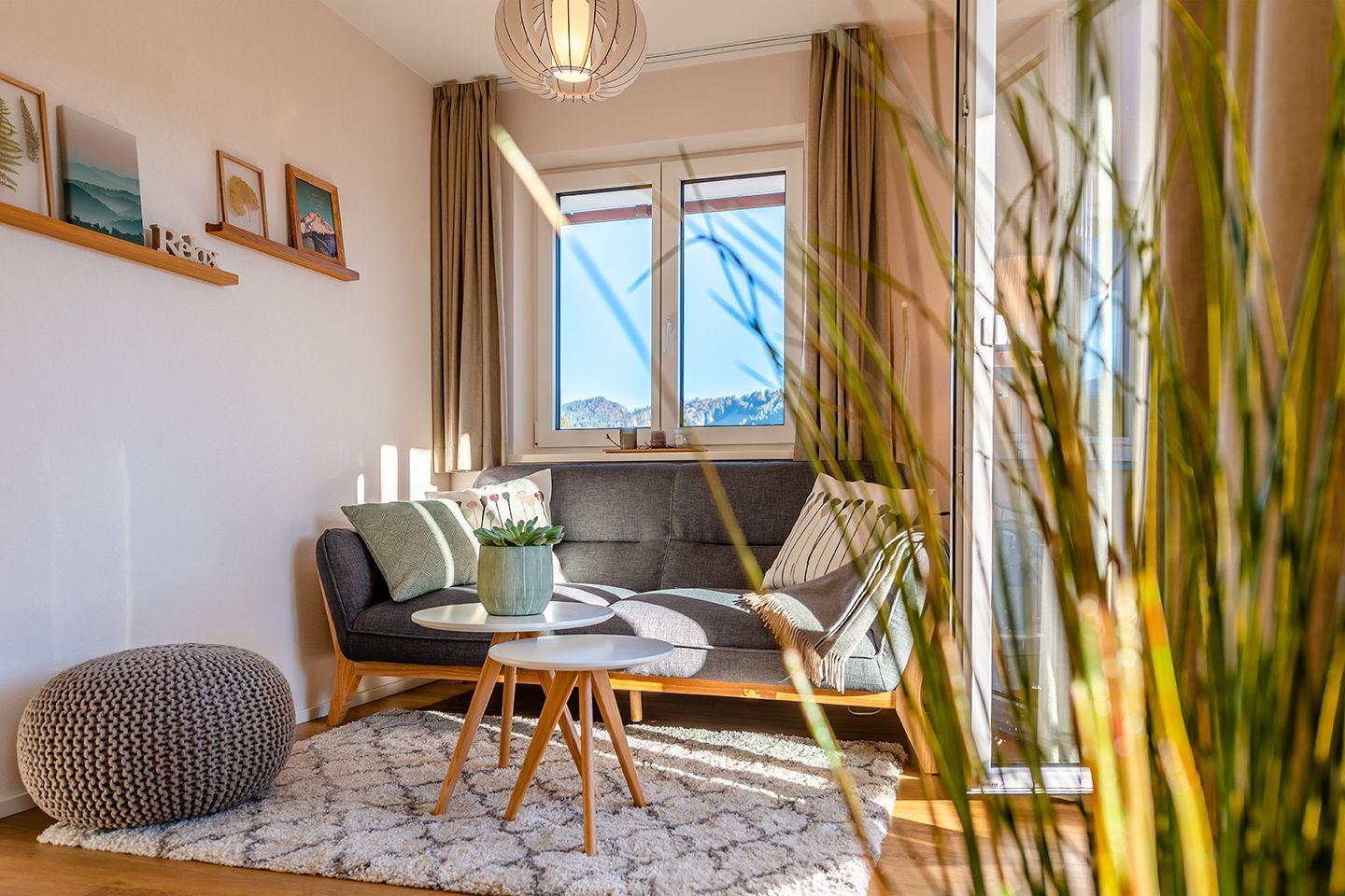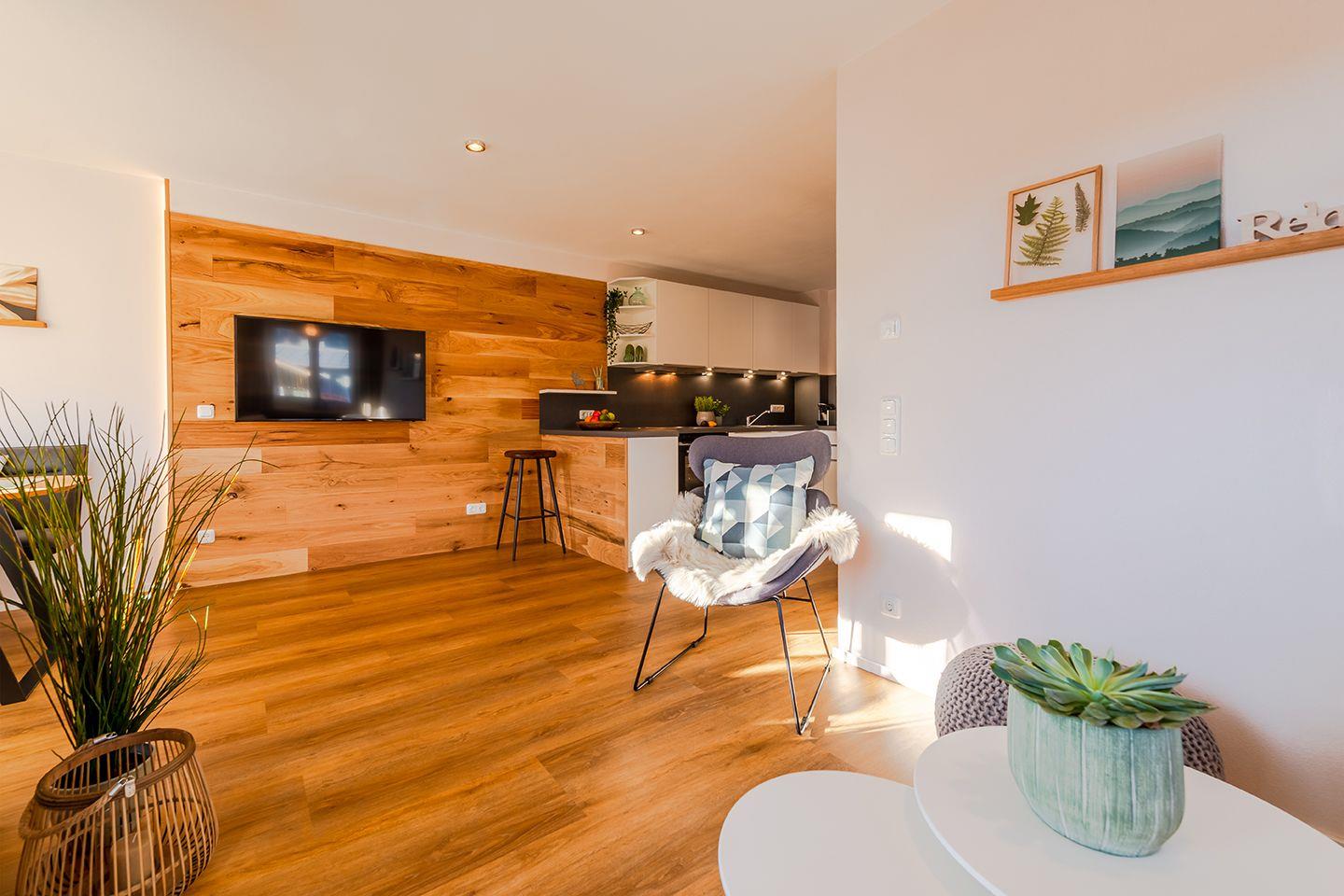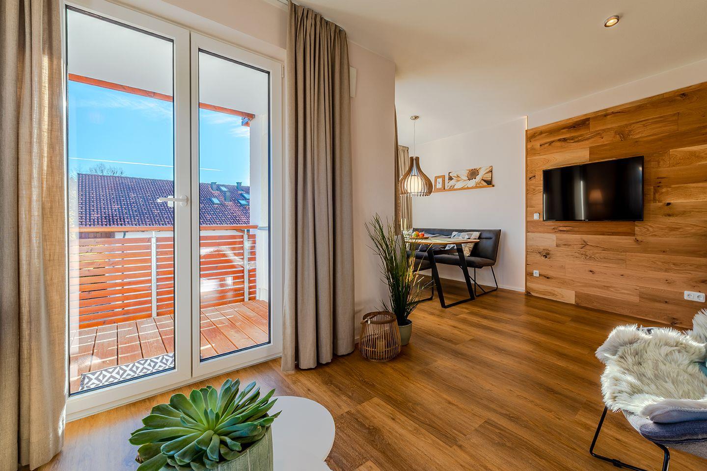 Unsere Ferienwohnung ist hell, freundlich und modern eingerichtet. Mit viel Holz, viel Wärme und Liebe zum Detail. So lässt sich unsere Ferienwohnung „Berggold“ im 1. Obergeschoss am einfachsten beschreiben. Sie verfügt über einen großen Wohn- und Essbereich, Balkon, Bad mit Dusche & WC und zwei Schlafzimmer für bis zu 4 Personen.
