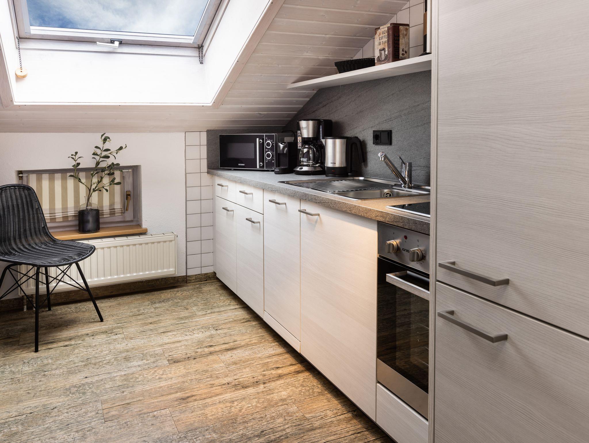 Die 50m² große Ferienwohnung ist gleichermaßen geräumig wie gemütlich. Die großen Dachfenster sowie der Südbalkon schenken viel Helligkeit. Die Wohnung verfügt über einen getrennten Wohn- und Schlafraum.