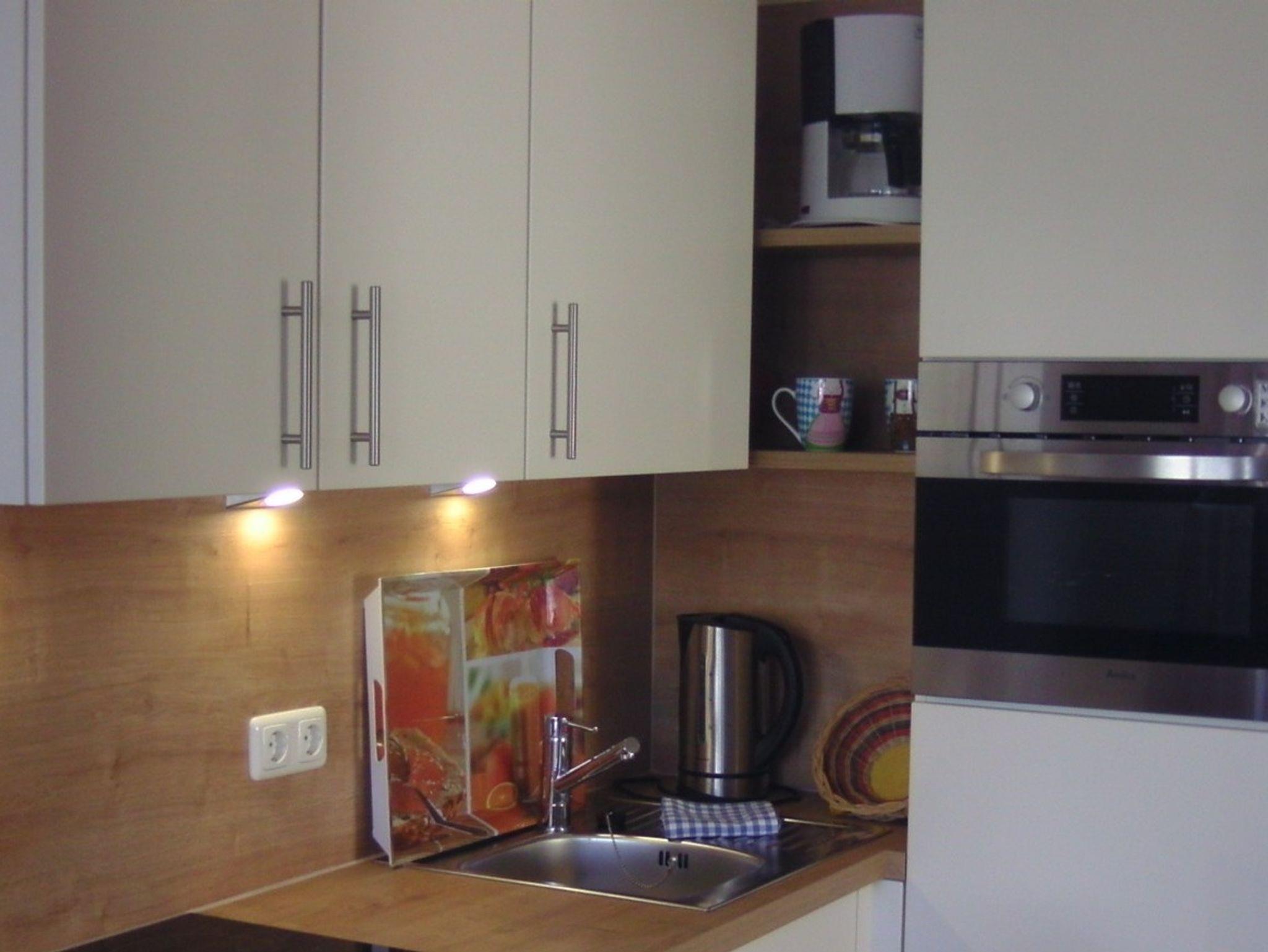 unser Wolkenlos verfügt über ein Wohn/Schlafzimmer, Flachbildschirm, C, neue Küche in Magnolie mit Backofen, Mikrowelle etc mit Essgruppe extra mit 3. Bett, Erlebnisdusche, WC und Südterrasse mit Zugang zum Garten Allergiker