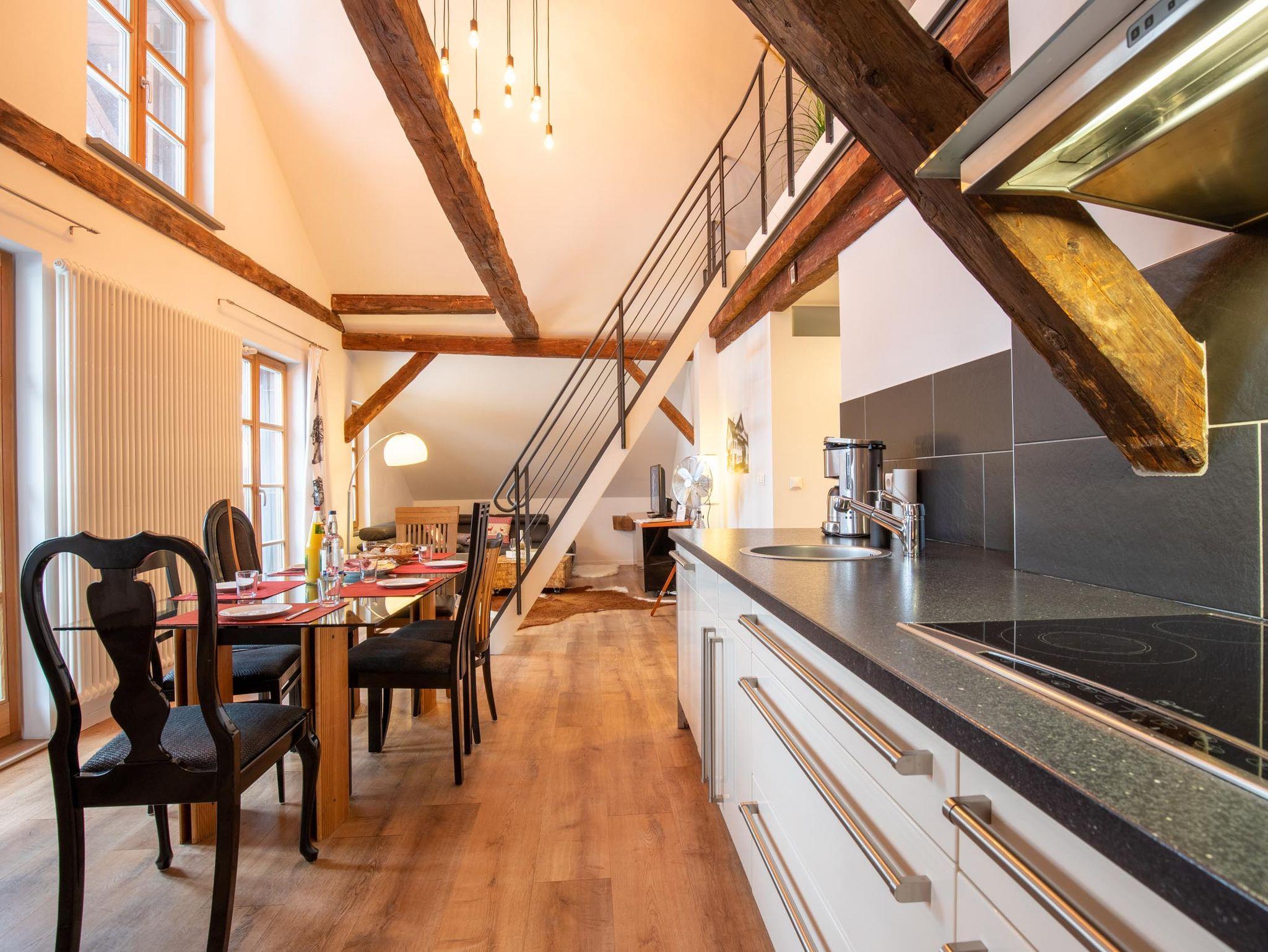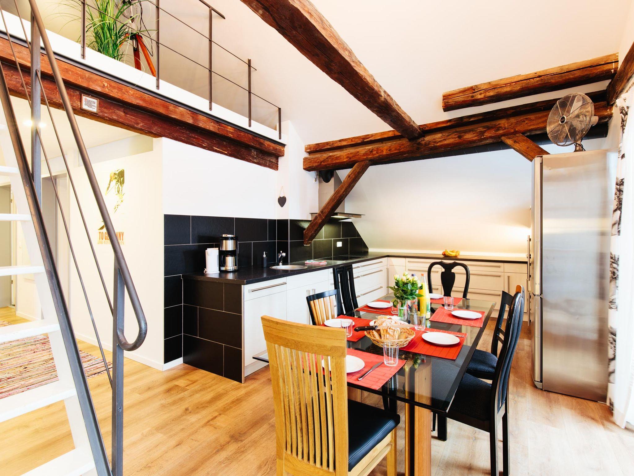 4 Zimmer Ferienwohnung mit 102 m² für 1 bis 6 Personen, 4 Räume mit 3 Schlafzimmern, Wohnzimmer mit offener Küche, Galerie, 2. Obergeschoß/Dachgeschoß, Balkon, Bergblick, Kinderzustellbett/-hochstuhl auf Anfrage möglich