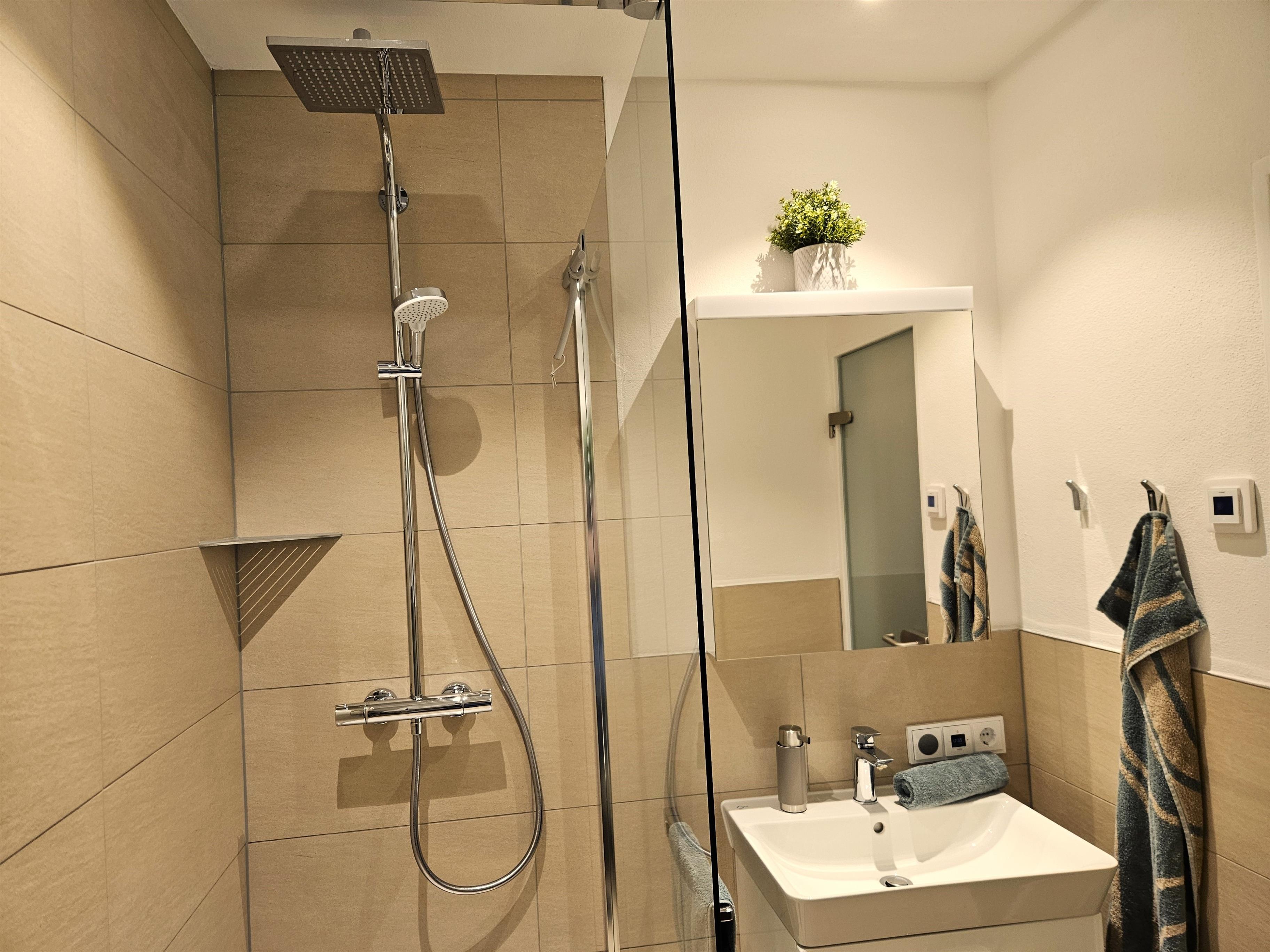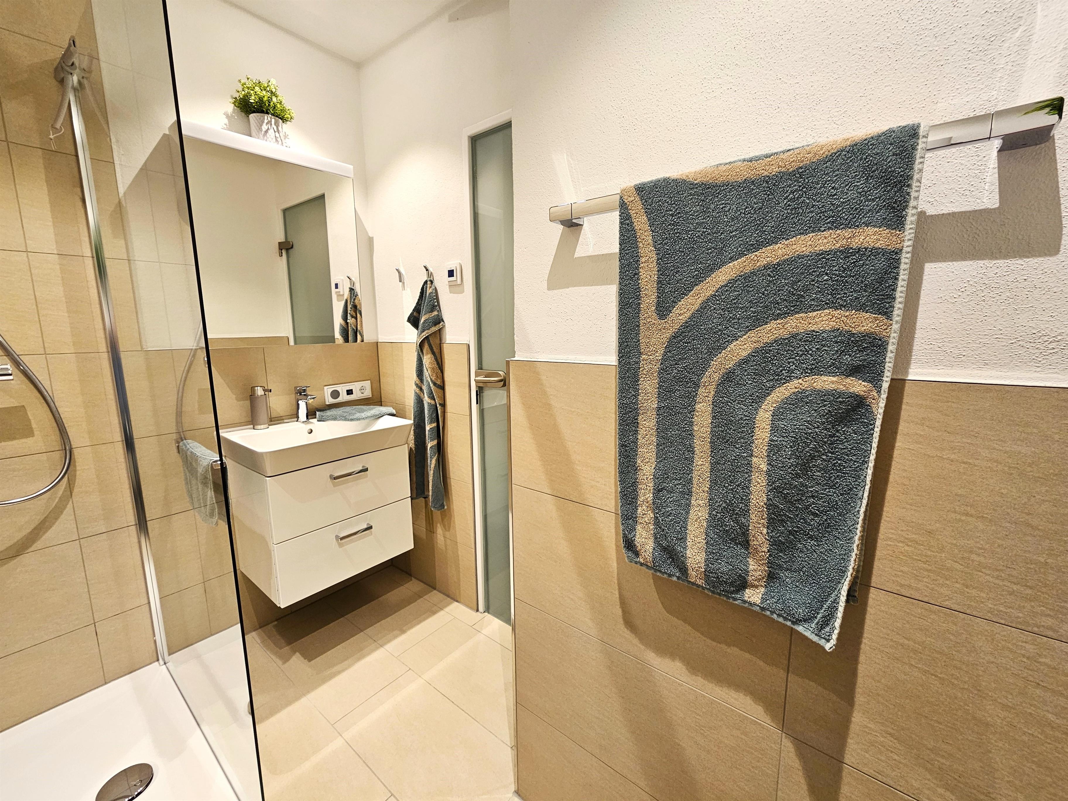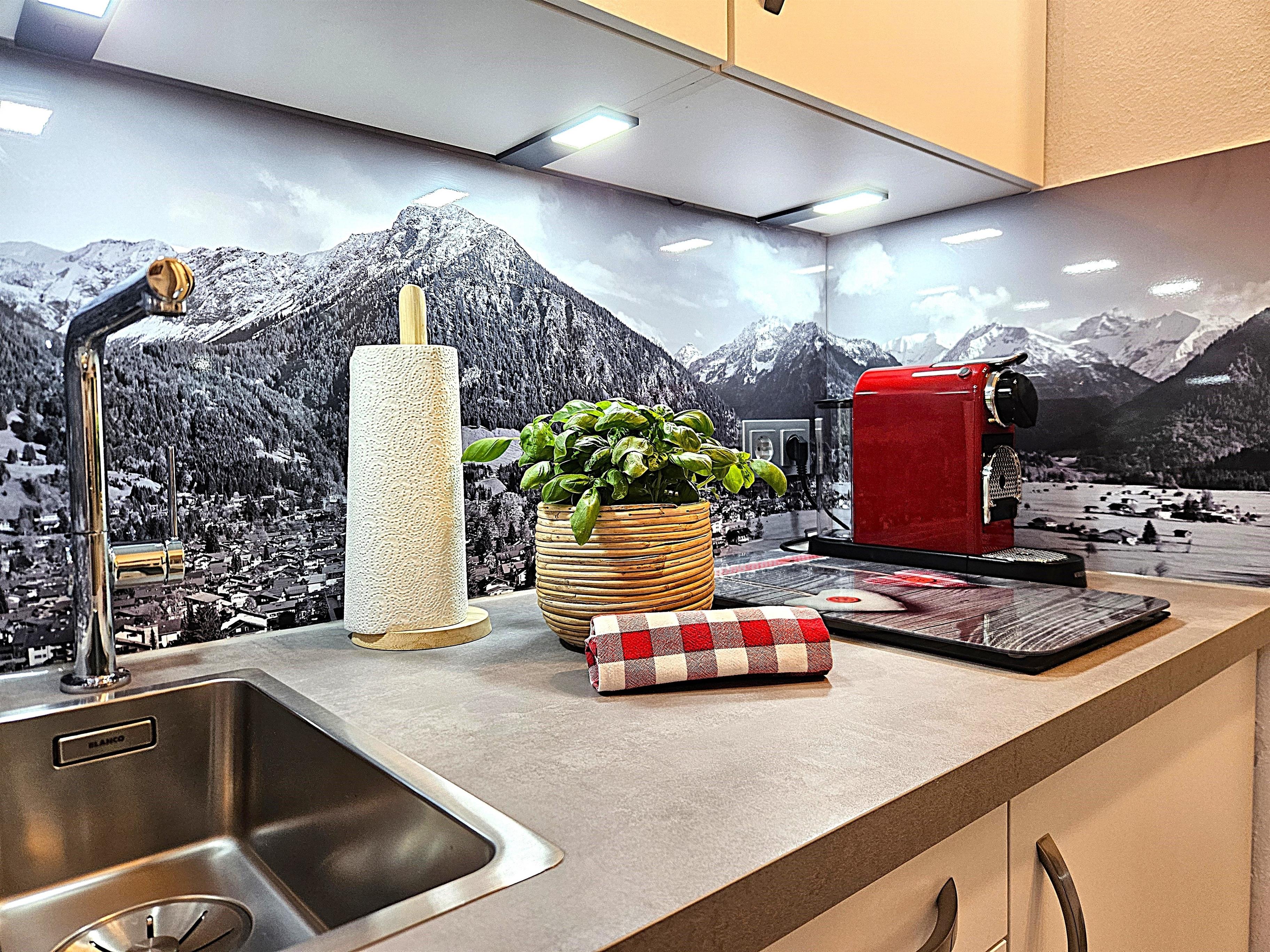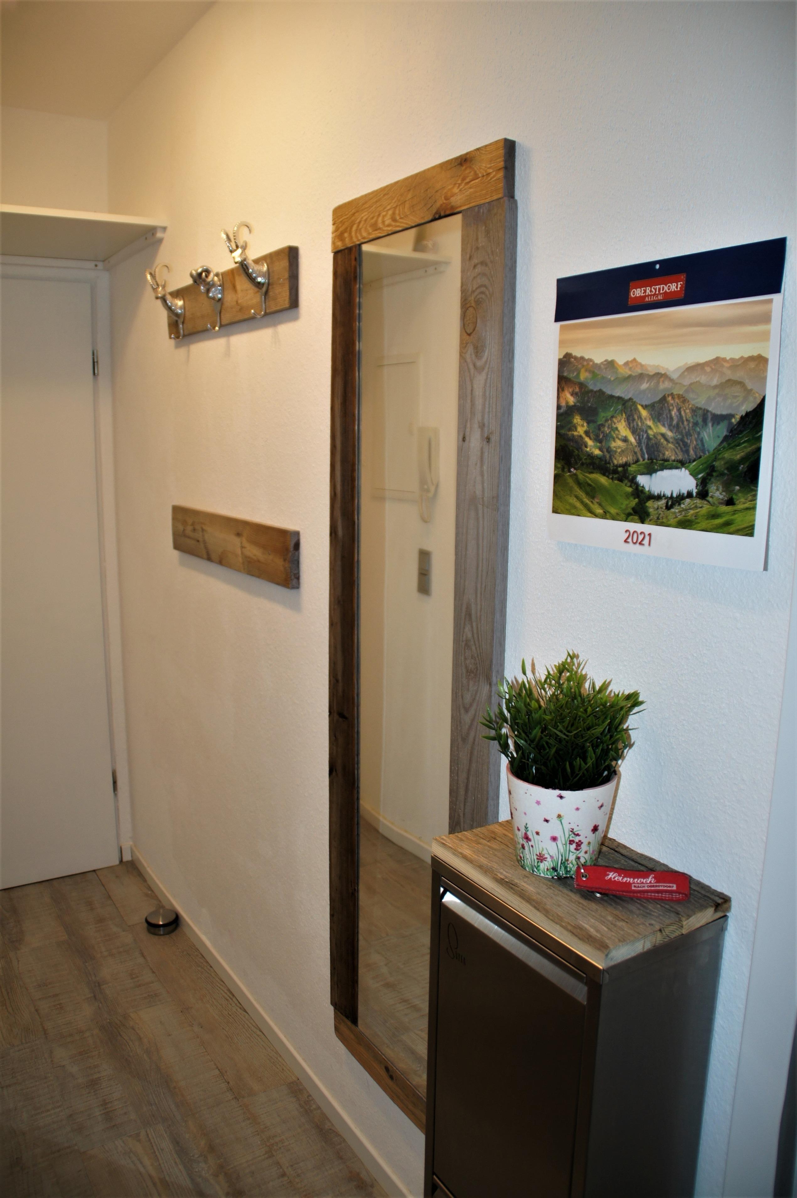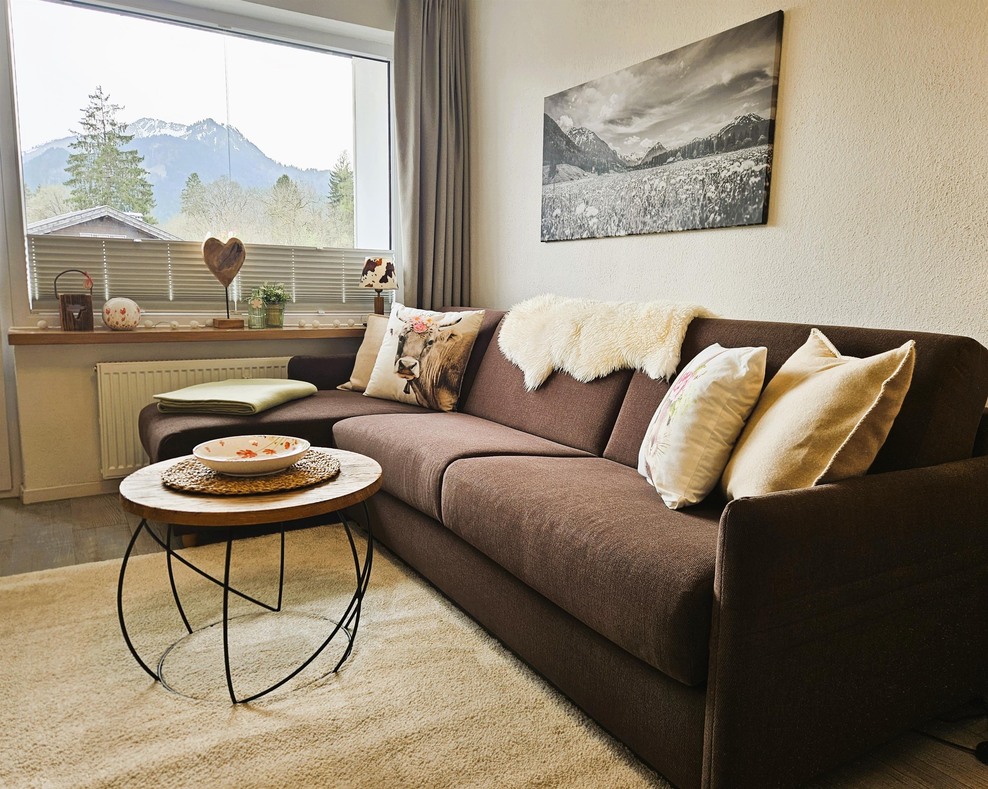 Unsere Ferienwohnung haben wir mit viel Liebe zum Detail eingerichtet; Sie werden sich wohlfühlen! Beim Betreten der Wohnung gelangen Sie in den hellen Flur, der mit einer Altholzgarderobe ausgestattet ist. Gleich auf der rechten Seite kommt man ins neu renovierte Badezimmer mit einer begehbaren Regendusche und WC. Den Abschluss des vorderen Bereiches bildet die sehr gut ausgestattete neue Küche mit Geschirrspülmaschine, Nespressomaschine und einem Milchaufschäumer. Durch eine Glastür kommt man in den lichtdurchfluteten Wohn- und Schlafbereich. Im vorderen Teil befindet sich der Esstisch mit zwei bequemen Armlehnstühlen, sowie ein Kleiderschrank und eine Kommode. Gegenüber vom neuen hochwertigen, gemütlichen Sofa/Bettsofa mit Lattenrost und einer Medicare Matratze mit Topper hängt der, an der Altholzwand montierte, große Smart-TV. Der Südbalkon mit traumhaftem Bergblick lädt bei Sonnenschein mit der bequemen Sitzgruppe und Sonnenschirm zum Essen oder einfach nur zum Füße hochlegen ein.