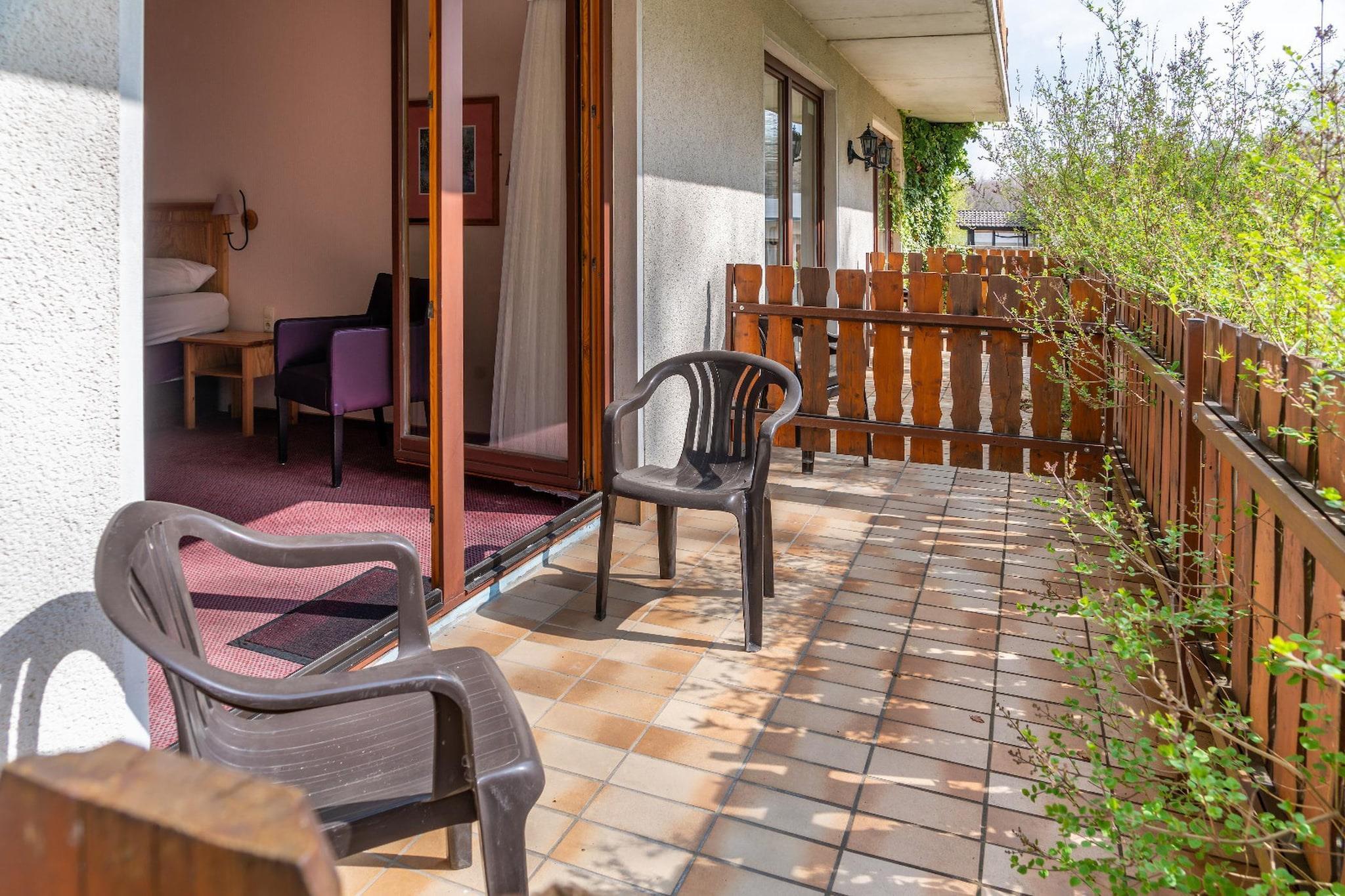 Dette rummelige trepersonersværelse ligger i Südflügel i stueetagen på Hotel Heiderhof og er ideelt for familier, venner eller små grupper, der søger komfort og nem adgang. Værelserne er placeret på den nederste etage for bekvemmelighedens skyld og er designet til komfortabelt at rumme tre separate senge. Værelsesfaciliteter 1. En dobbeltseng og to enkeltsenge, der tilbyder fleksible soveforhold. 2. Fladskærms-tv med kabel- og satellitkanaler. 3. Komfortabelt siddeområde til afslapning. 4. Privat badeværelse med bruser, håndvask, toilet og hårtørrer. 5. Varme for komfort året rundt. 6. Direkte adgang til stueetagen for ekstra bekvemmelighed. Hotelfaciliteter og -service 1. Bar og restaurant på stedet, der serverer regionale retter. 2. Internetadgang tilgængelig. 3. Terrasse, have og havemøbler til udendørs afslapning. 4. Gratis parkering på stedet. 5. Fælles fritidsfaciliteter, herunder bordtennis, dart og billard. Nærliggende attraktioner 1. Vandre- og cykelstier i det naturskønne Rheinischer Westerwald. 2. Altenkirchen (Westerwald) – ca. 19 km. 3. Koblenz centrum – ca. 40 km. Sådan kommer du dertil 1. I bil via regionale motorveje med parkering på stedet. 2. Med tog til Altenkirchen station (19 km). 3. Med fly via Köln Bonn Lufthavn (ca. 45 km). Et praktisk og komfortabelt ophold på landet, der kombinerer god plads, fritidsfaciliteter og Westerwald-regionens naturlige skønhed.