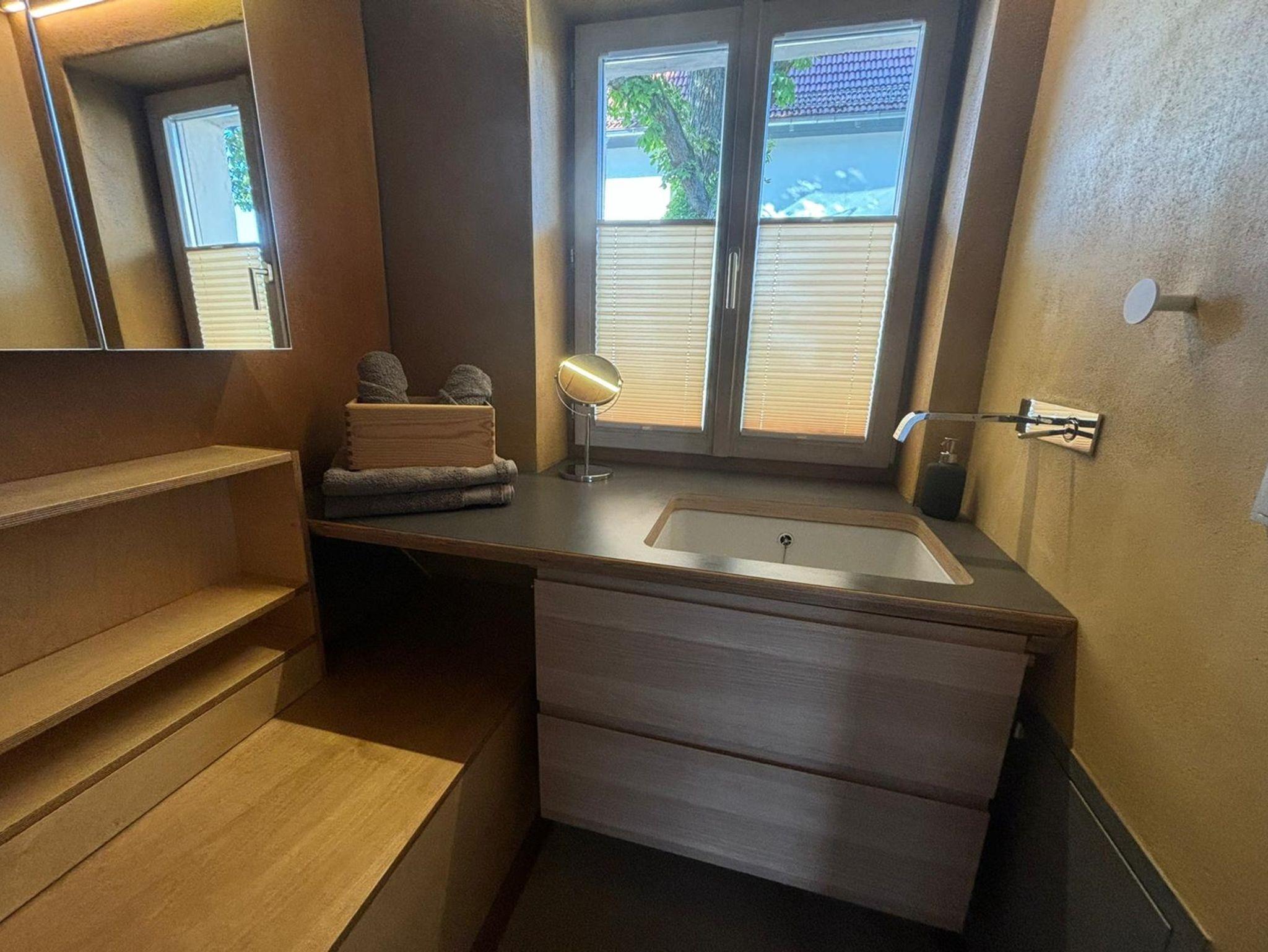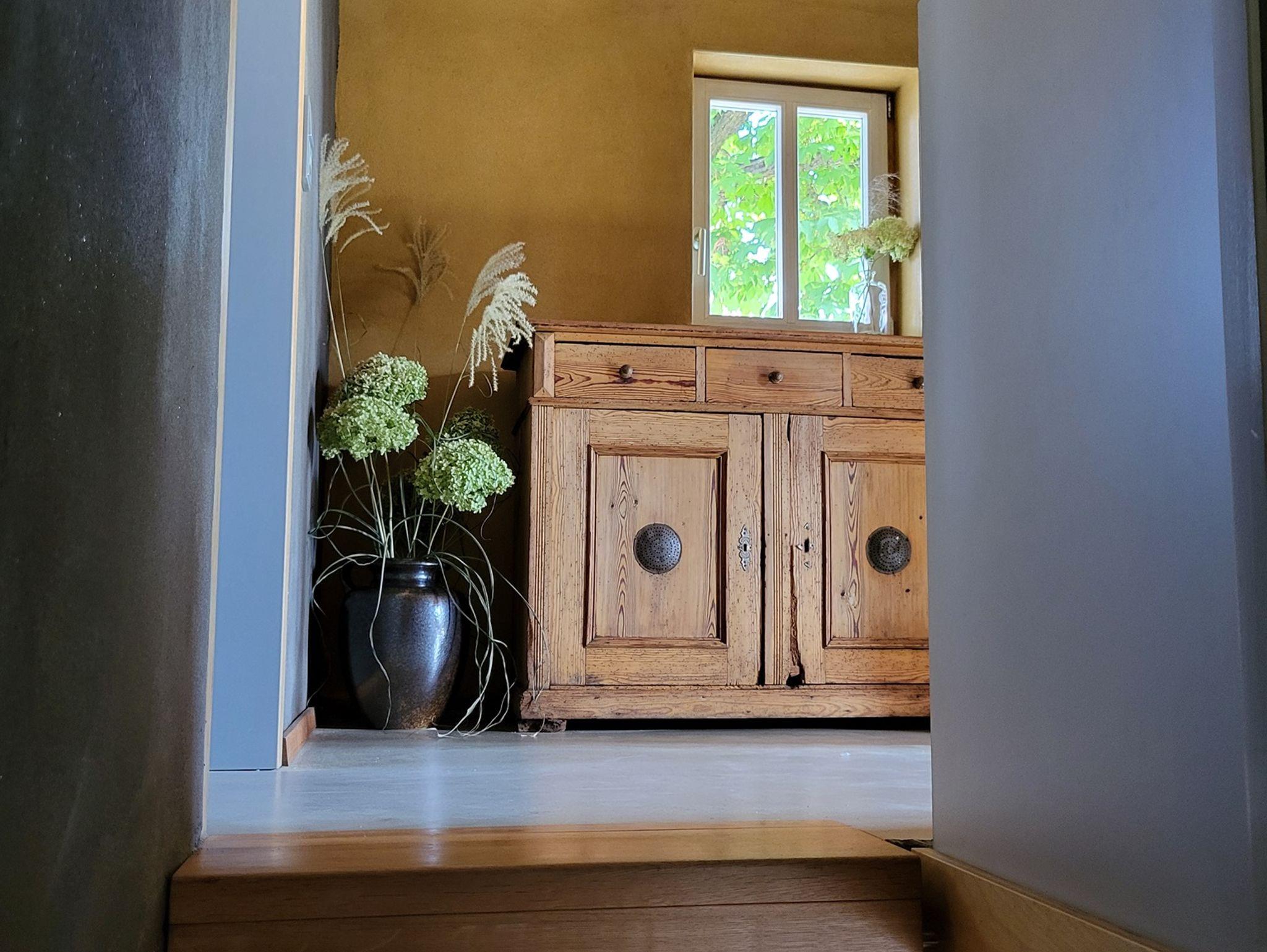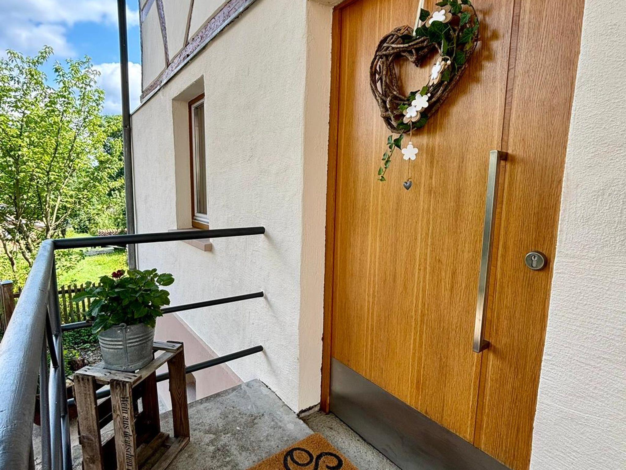 Im Erdgeschoss des historischen Fachwerkhauses befindet sich eine voll ausgestattete Küche, Esszimmer mit Blick auf den Garten, gemütliches Wohnzimmer mit Kaminofen sowie ein Bad (Dusche, WC, Föhn). Außerdem steht eine Waschmaschine zur Verfügung.