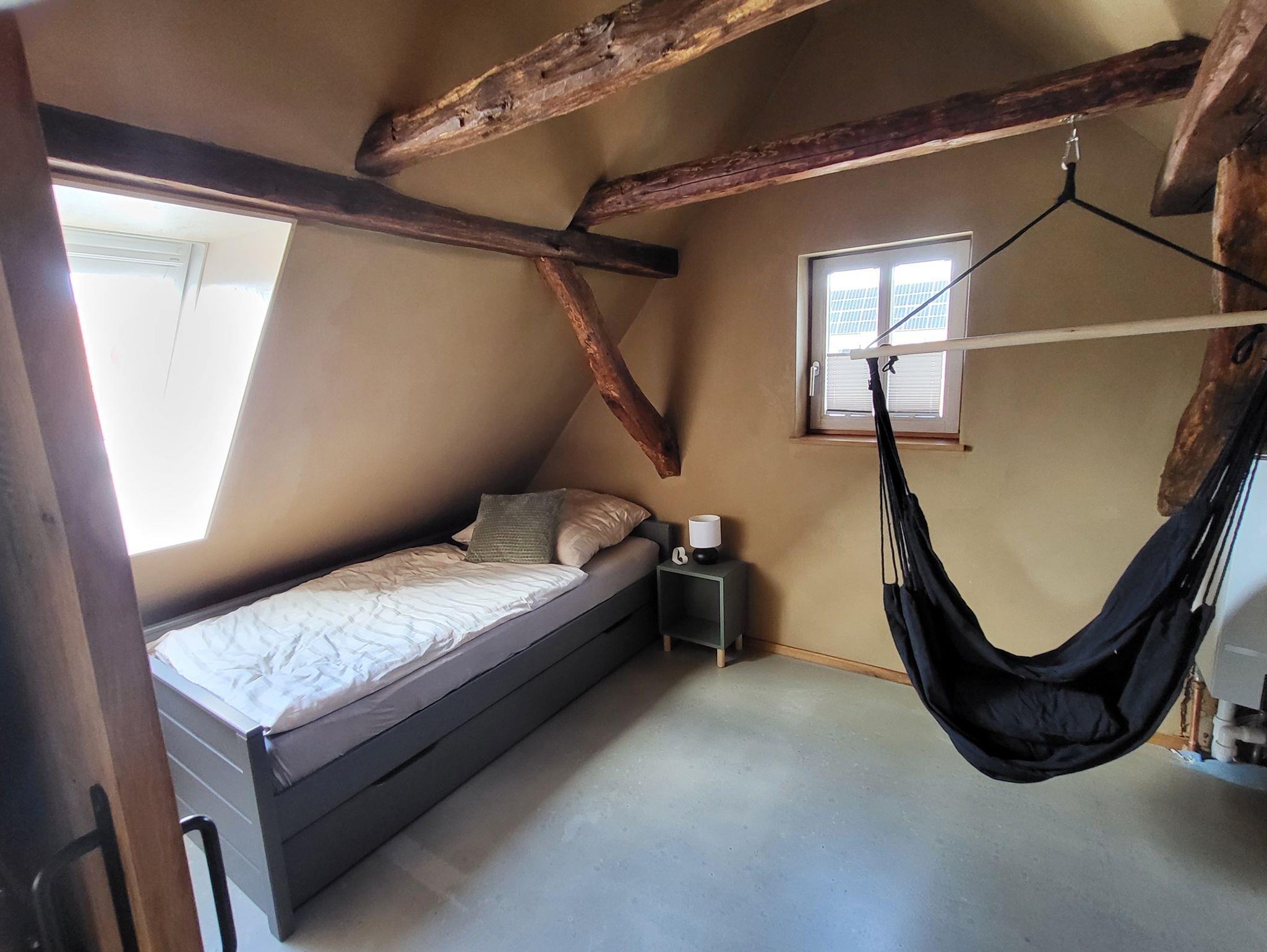 Im Dachgeschoss befinden sich zwei weitere Schlafzimmer (Doppelbett 180x200/ Einzelbett 90x200), welche durch die originalen Dachbalken eine besondere Atmosphäre bieten.