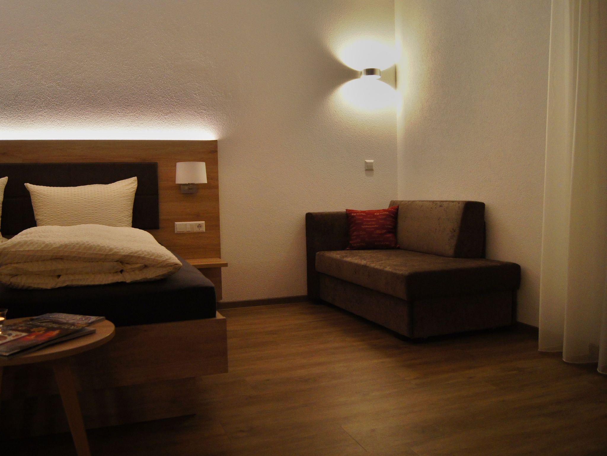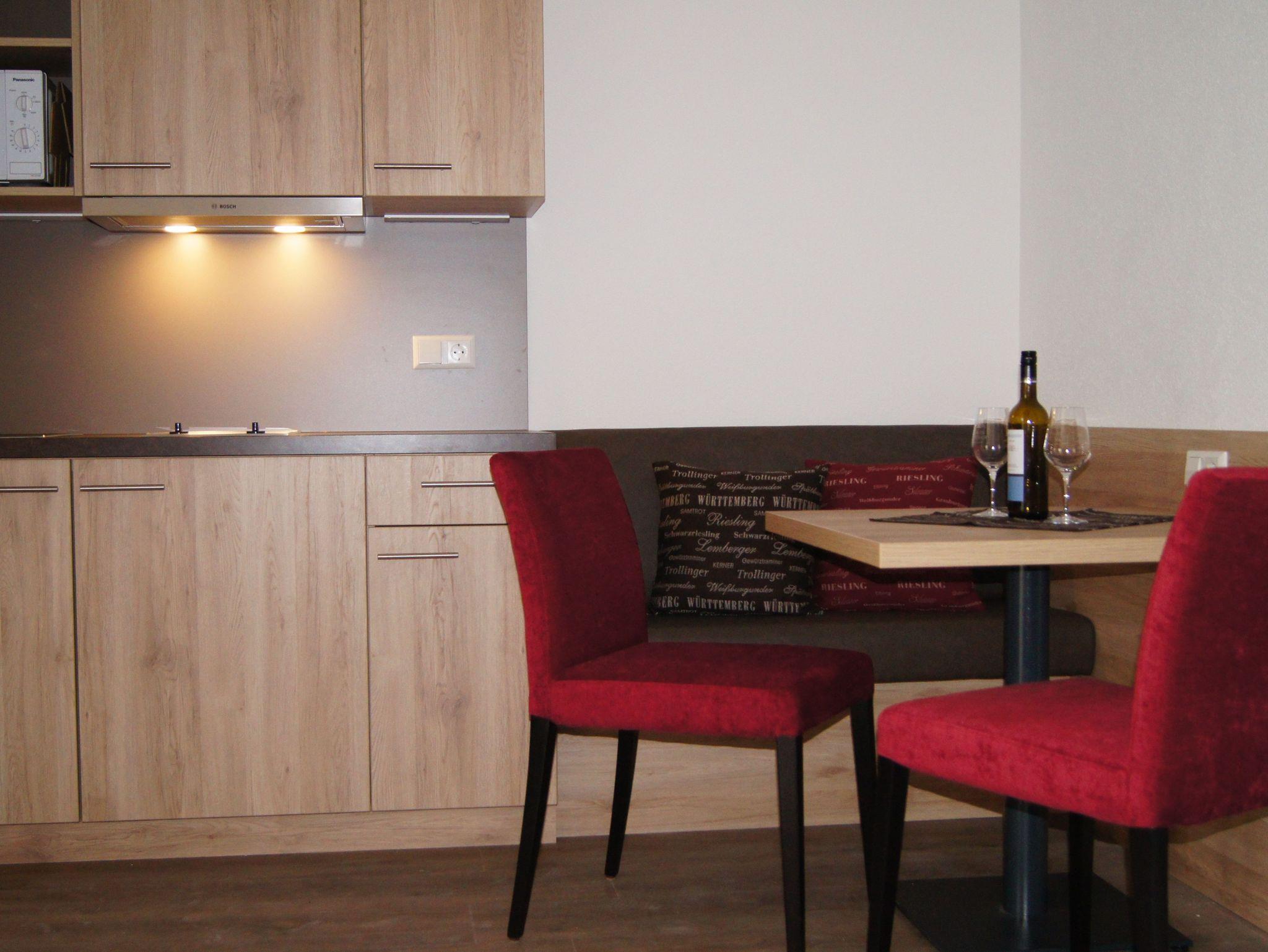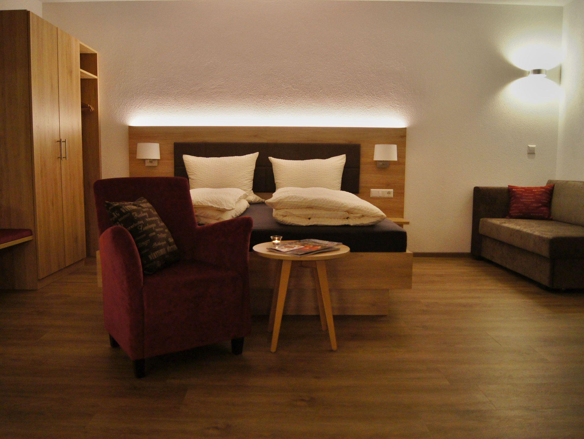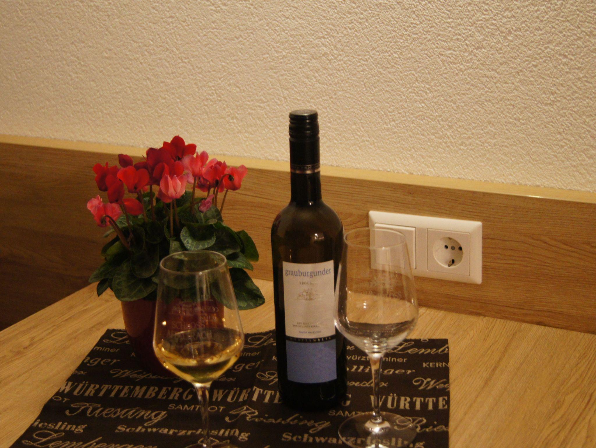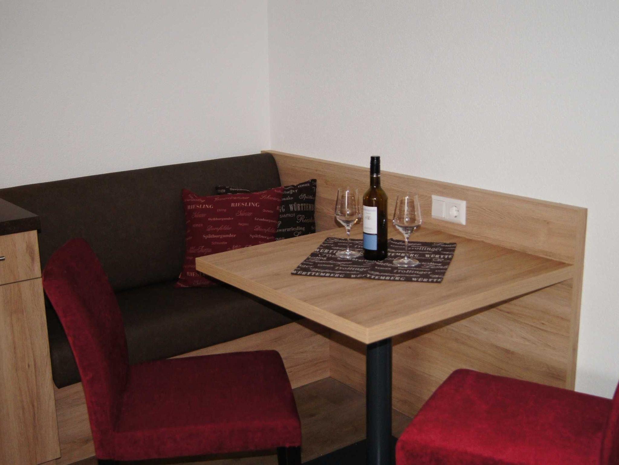 Das Appartment Grauburgunder befindet sich im 1. Stock des Gästehauses mit einem Balkon auf der Südseite. Das Appartment ist mit einem Wohn-Schlafraum, einer Küchenzeile und mit einer gemütliche Essecke ausgestattet. Durch die großen Balkontüren sind die Zimmer hell und freundlich. Zum Abdunkeln gibt es einen Rollladen.