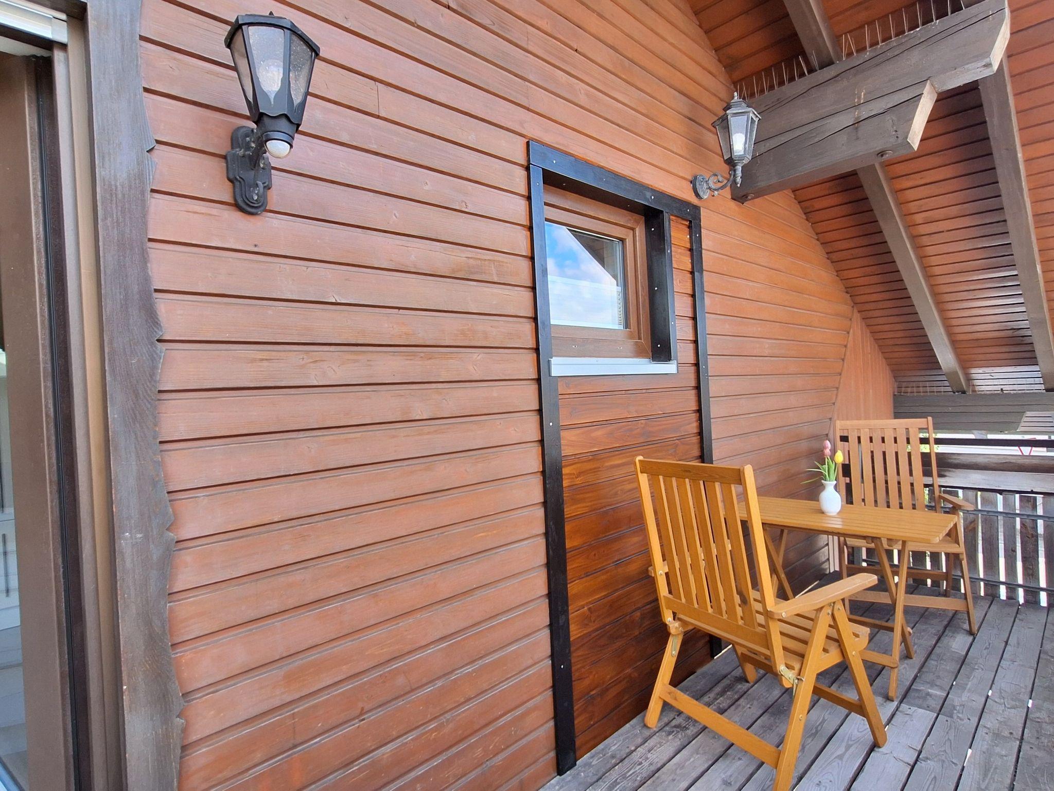 Der Zugang zur Wohnung erfolgt über eine außenliegende Wendeltreppe.