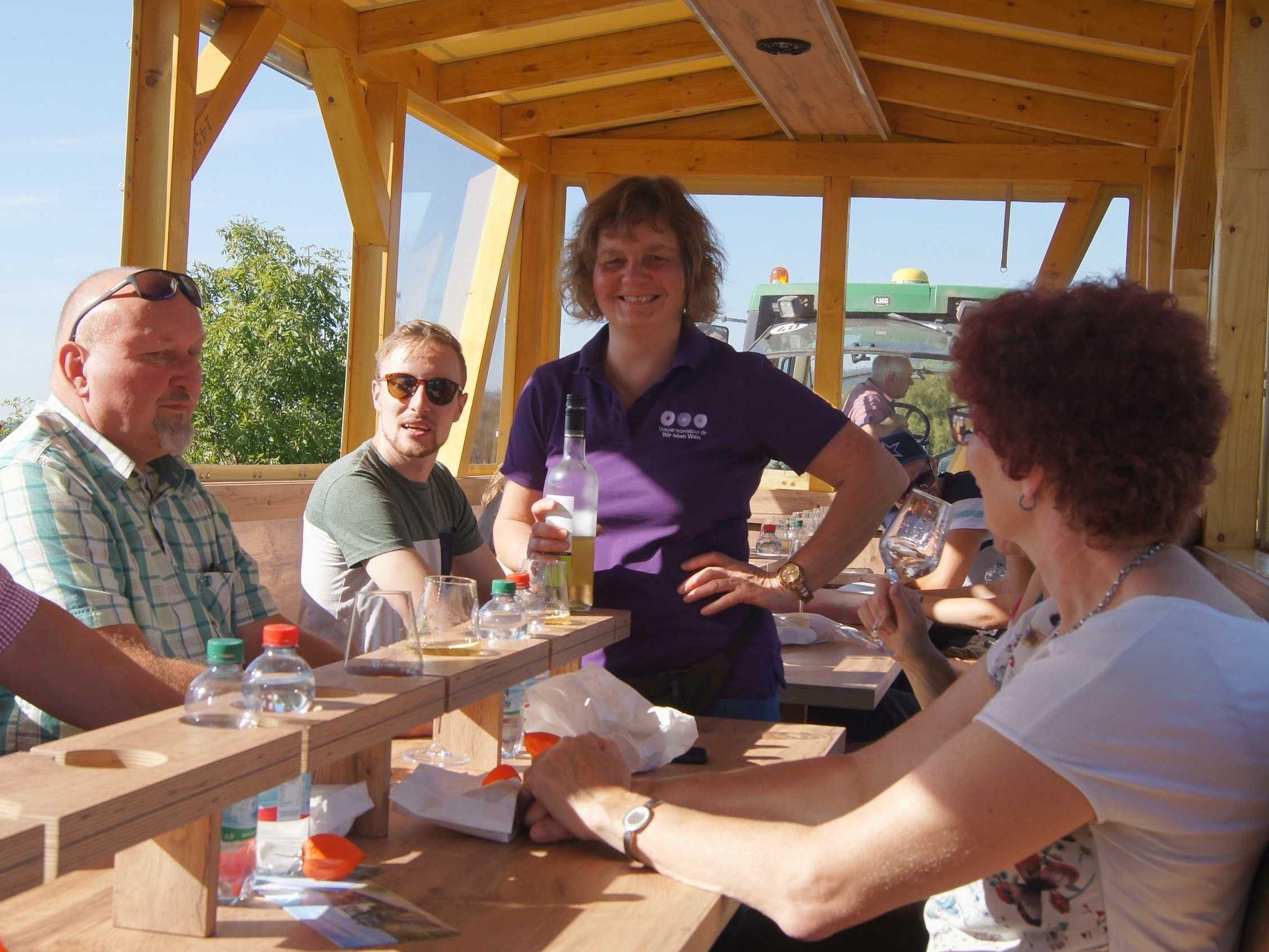 Im Haus, auf der Terrasse und im Garten kann man sich erholen und entspannen. Regionale Weine kann man bei einer Panoramafahrt mit dem Planwagen genießen.