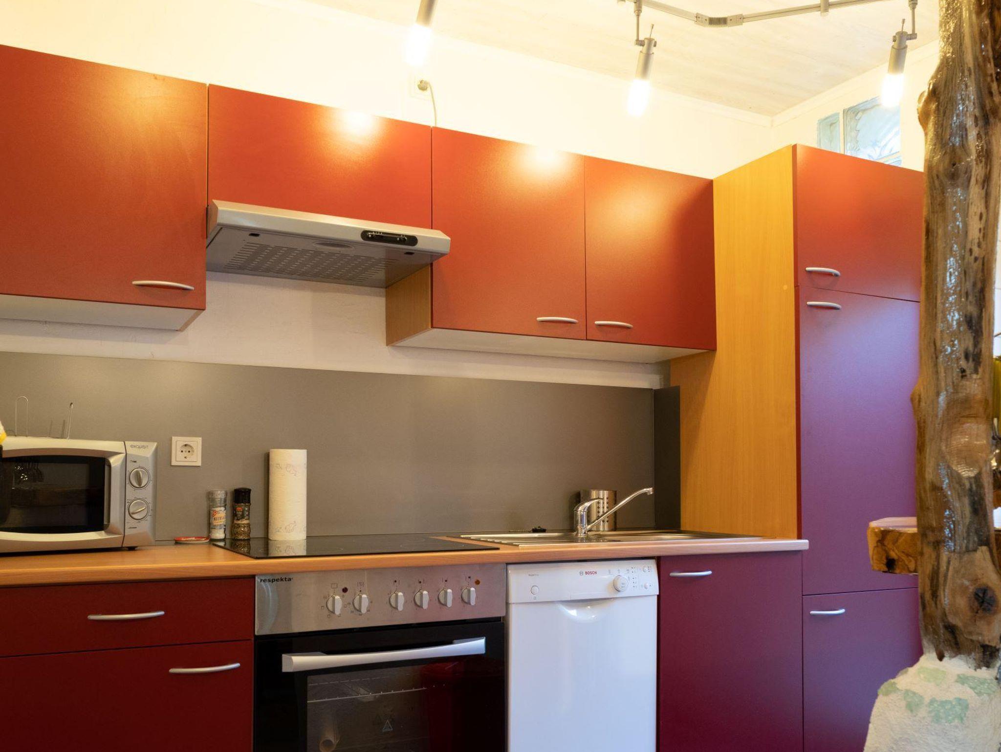 Die Ferienwohnung bietet auf 80 Quadratmetern Platz für bis zu 5 Personen. Sie verfügt über eine offene Wohnküche mit Küchenzeile, die mit Kühlschrank, Gefrierfach, Elektroherd, Backofen, Geschirrspülmaschine, Mikrowelle, Wasserkocher, Toaster und Geschirr voll ausgestattet ist. Der Essbereich verfügt über eine gemütliche Essecke. Der kombinierte Wohn- und Schlafbereich verfügt über einen TV, eine Schlafcouch für 2 Personen sowie ein Zustellbett als Schlafmöglichkeit für eine fünfte Person. Das separate Schlafzimmer verfügt über ein Doppelbett und einen Kleiderschrank. Das Badezimmer ist mit Waschbecken, WC, Dusche und Föhn ausgestattet. Das WLAN steht Ihnen kostenfrei zur Verfügung. Zudem sind Verdunklungsrollos in allen Räumen vorhanden.