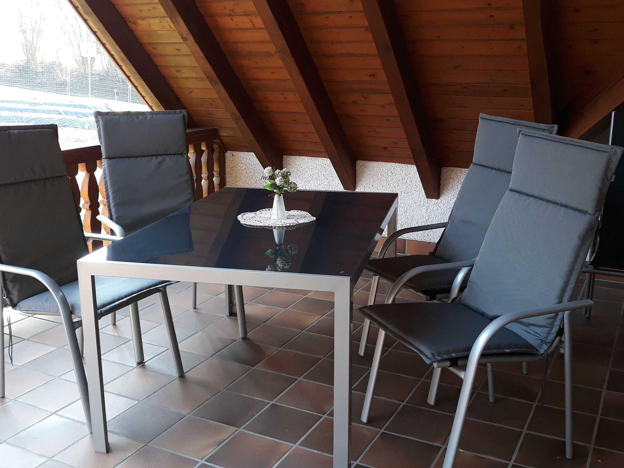 Der überdachte Balkon eignet sich perfekt für die ganze Familie ob zum Frühstück/ -Mittag oder gemütlichen Abendessen oder nur die Sonnen zu genießen. Lassen Sie sich nach einem ereignisreichen Tag bei einem Glas Wein die Seele baumeln.