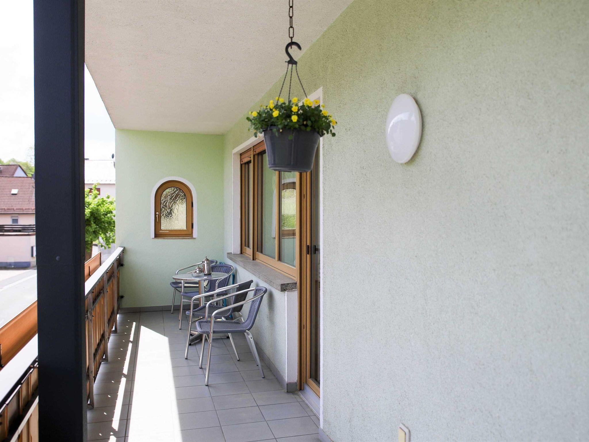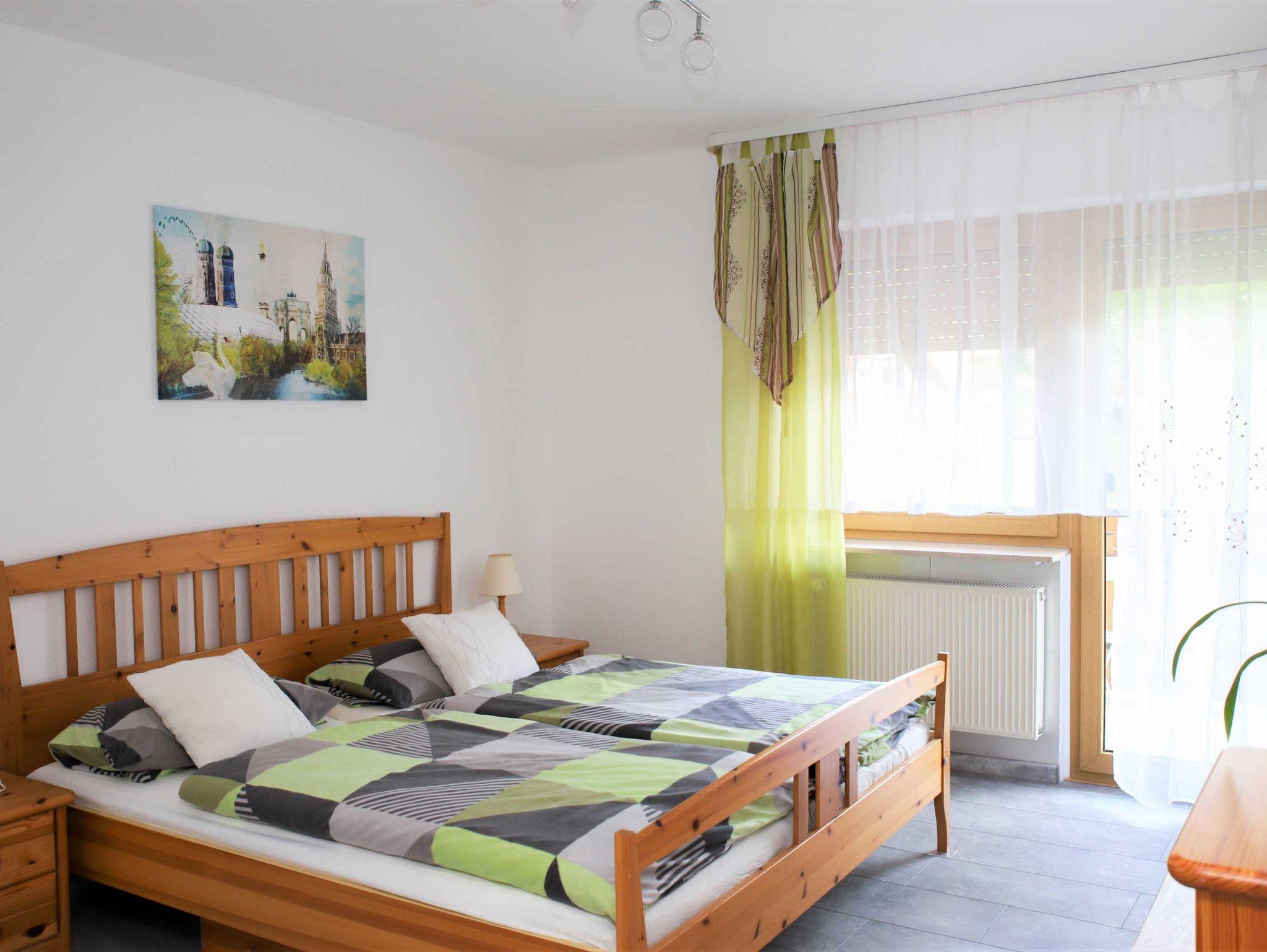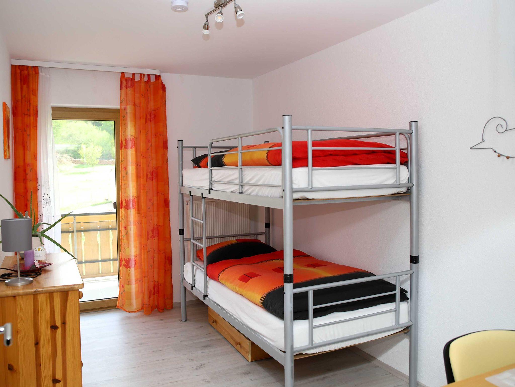 Unsere geräumige Ferienwohnung bietet auf ca. 100m² Platz für 2-5 Personen. Das Wohnzimmer ist mit einem 2-teiligen Sofa, TV/Radio und einer Spielekonsole Wii ausgestattet. Hier gelangen Sie auch direkt auf den langen Balkon. Die Wohnung besitzt ebenso eine abgeschlossene und vollausgestattete Küche mit Elektroofen sowie einem Holzofen und einer gemütlichen Essecke. Das Schlafzimmer 1 verfügt über einen großen Kleiderschrank mit Doppelbett, das Schlafzimmer 2 über 2 Einzelbetten, die als Etagenbett oder nebeneinander aufgestellt werden können. Das Badezimmer ist mit Wanne und WC ausgestattet, Fön ist vorhanden. Ein weiteres Zustellbett ist möglich.