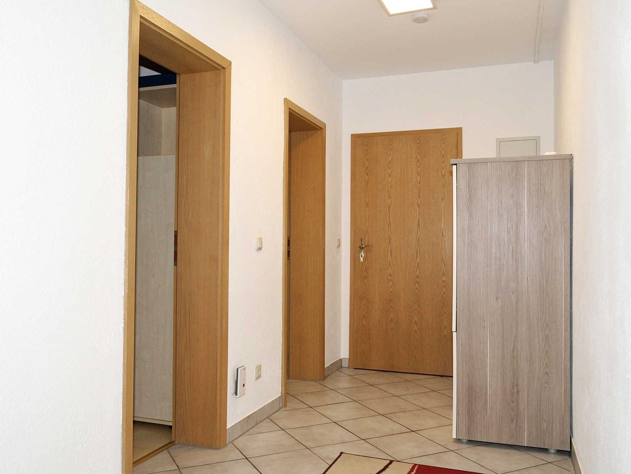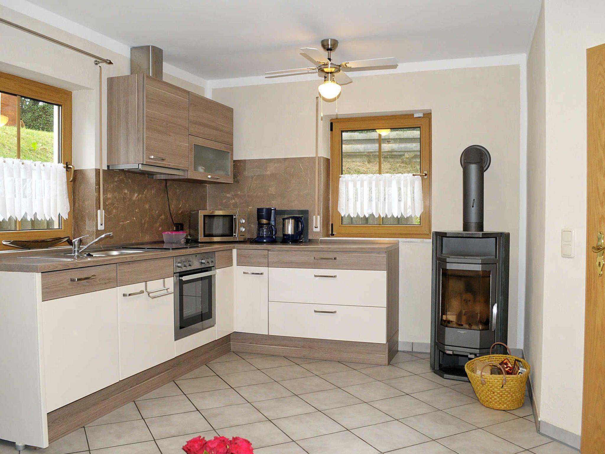 Die Wohnküche ist mit Fliesenboden und dimmbarer LEB-Beleuchtung ausgestattet. Geschirrspüler, Herd mit Ceranfeld und Backofen, Mikrowelle, Kaffeemaschine und Wasserkocher gehören zum Mobiliar. Eine Flächenheizung mit Marmorplatten und ein Kaminofen sorgen an kühlen Tagen für wohlige Wärme. Die Schlafräume sind mit Laminatboden ausgelegt und werden ebenso mit Flächenheizung und teilweise mit Konvektoren beheizt. Das Wasser im Badezimmer wird mit elektronischem Durchlauferhitzer aufbereitet. Im Flur steht ein Kühlschrank mit Gefriereinhei zur Verfügungt. In der gesamten Wohnung wird energiesparende LED-Beleuchtung verwendet.