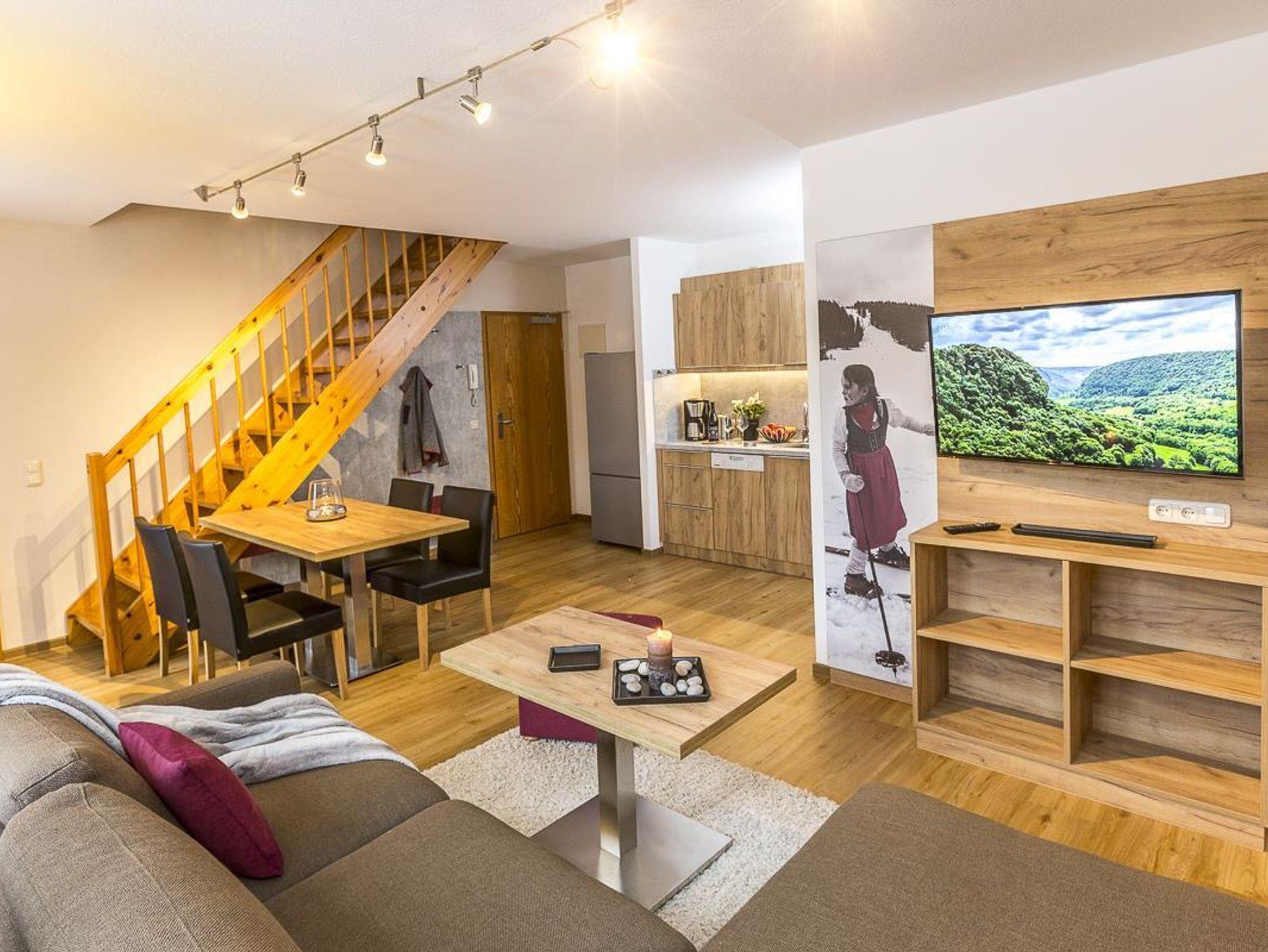 Eine super schöne, große Wohnung m. 63 qm über zwei Etagen, Balkon, drei sep. Schlafzimmer, sehr geräumigem Wohnzimmer offen zur Küche m. bequemer Eckcouch, ausziehbarem Esstisch, großem Flachbildschirm m. Kabel-TV.