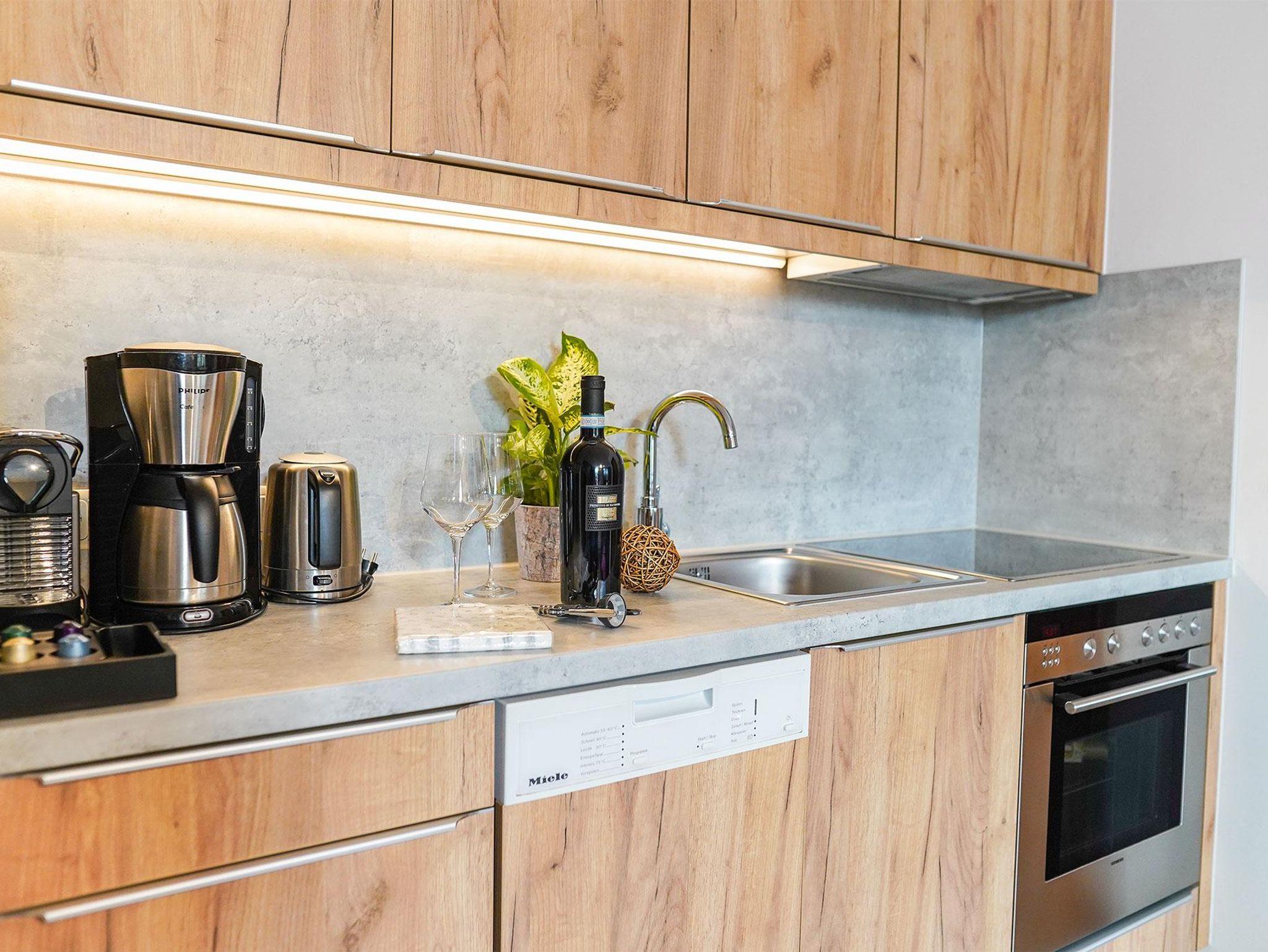 Die Küche ist komplett ausgestattet u.a. m. großem Kühlschrank mit Gefrierfächern, Cerankochfeld u. Geschirrspüler. Bettwäsche u. Handtücher sind im Preis enthalten.