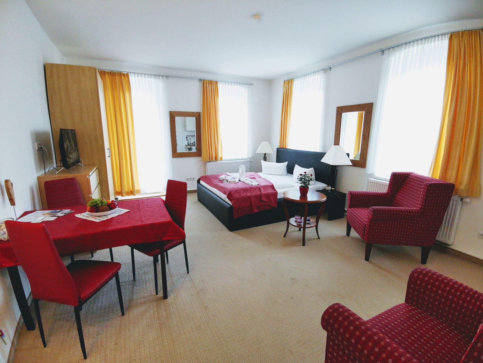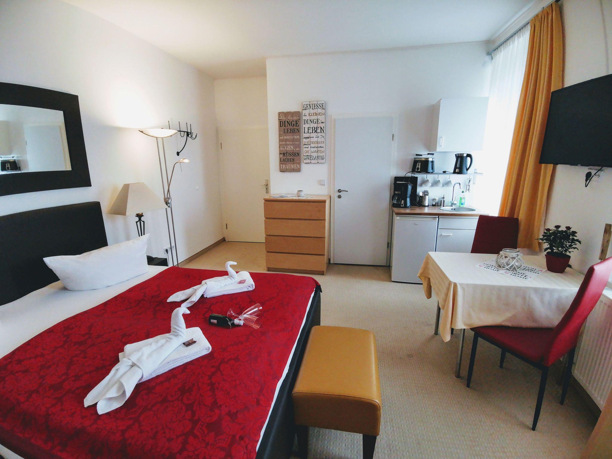 1-Zimmer-Apartments (23-27 qm) für bis zu 3 Personen mit kombiniertem Wohn- / Schlafraum. Die Apartments verfügen über kleine Kochnische mit einer Kaffeemaschine, Wasserkocher, einem Toaster und einem Kühlschrank, sowie einen Sitzbereich mit einem Flachbild-TV. Die Mikrowelle und/oder Backofen auf Anfrage.