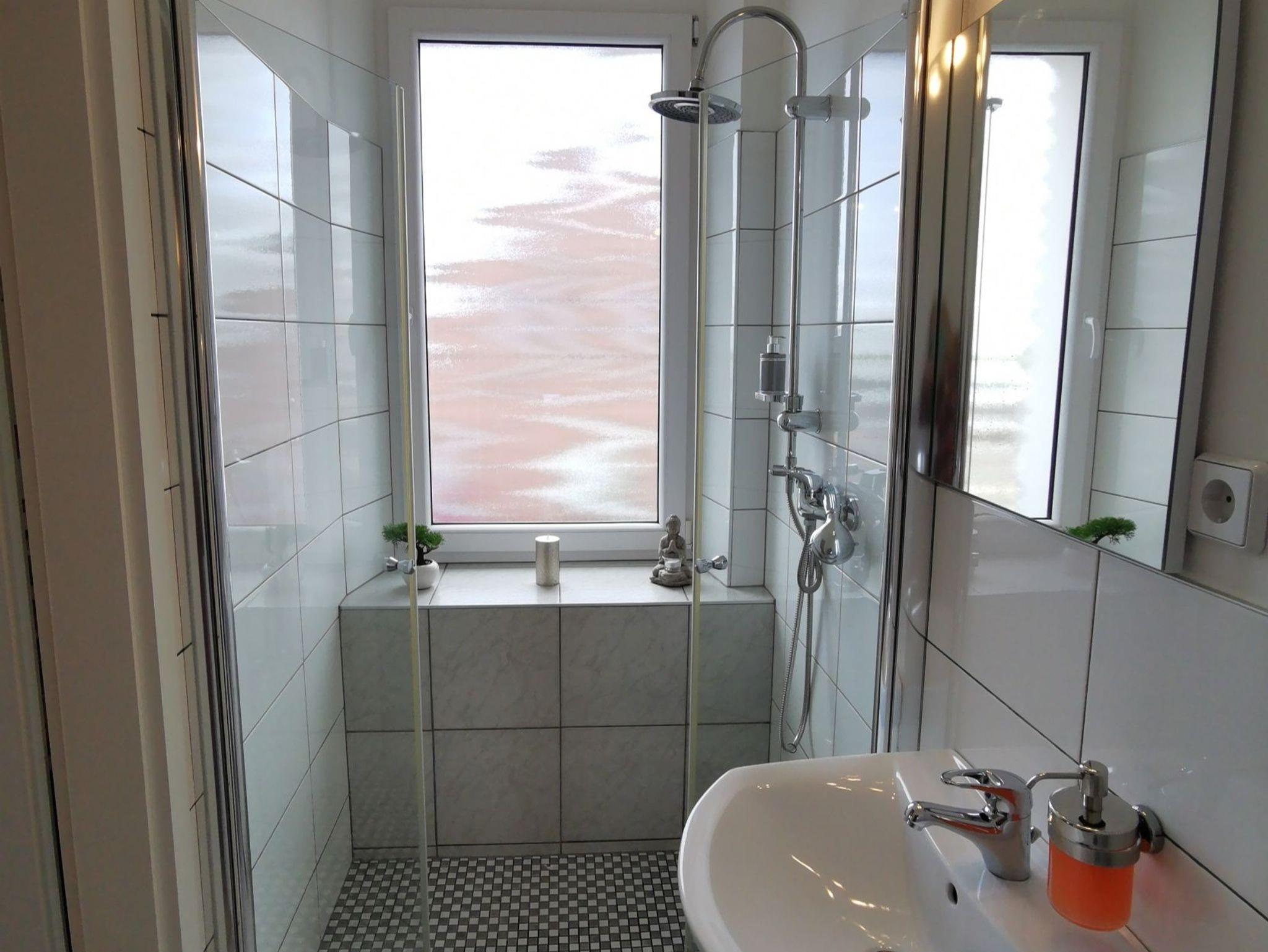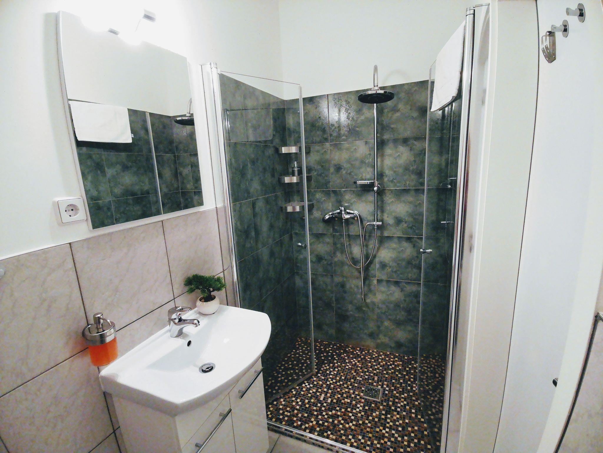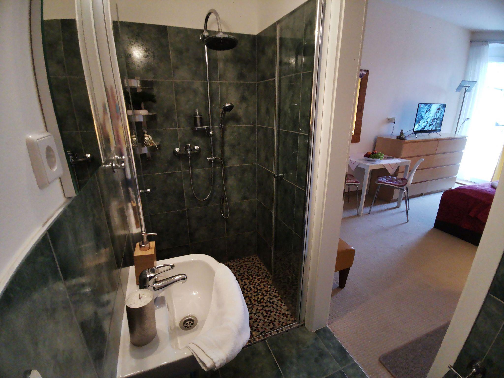 Das moderne Badezimmer mit Fußbodenheizung ist mit Dusche (ebenerdig), WC, Waschbecken und einem Haartrockner ausgestattet. Kostenfreie Parkplätze befinden sich direkt auf dem Grundstück.