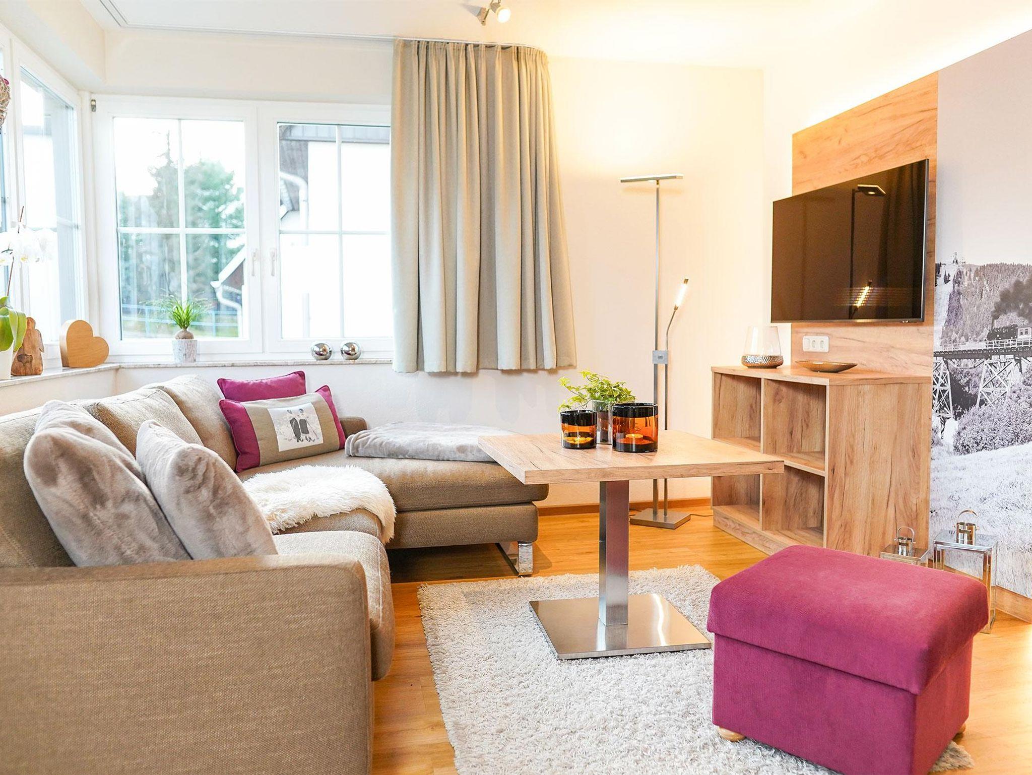 Eine super schöne, große Wohnung m. 63 qm, drei sep. Schlafzimmer über 2 Etagen, sehr geräumigem Wohnzimmer offen zur Küche mit bequemer Eckcouch, Esstisch, großem Flachbildschirm m. Kabel-TV.