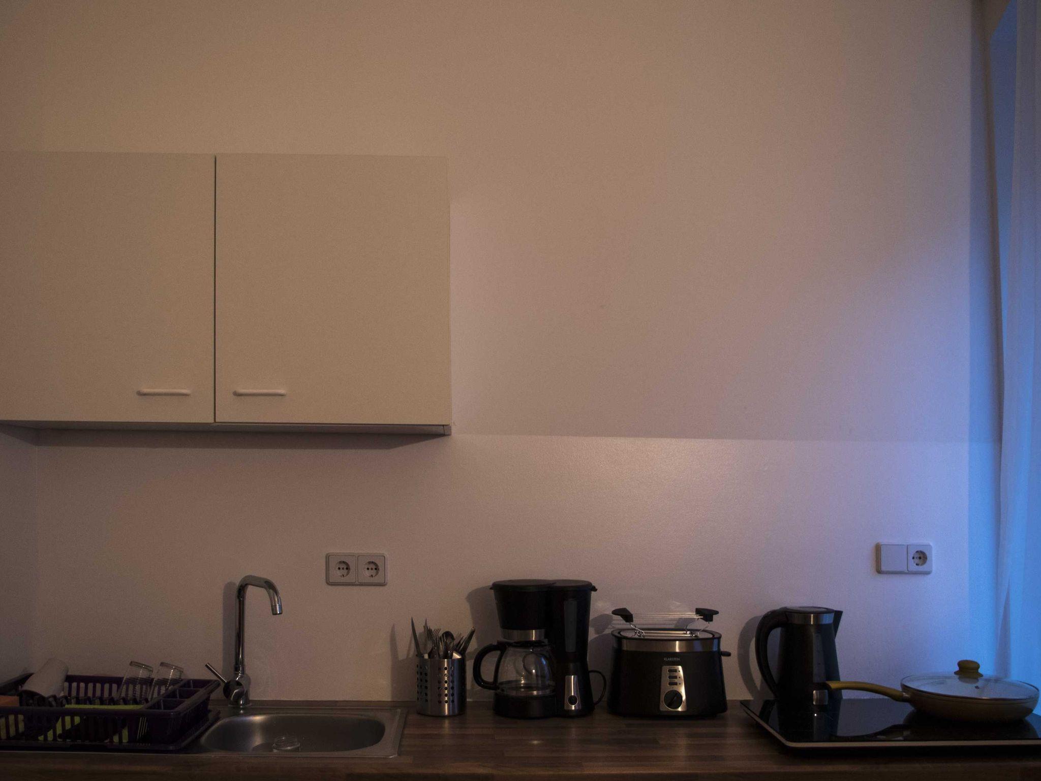 - Wohnküche mit einer Kochnische (Induktionskochfeld mit zwei Kochzonen, Kaffeemaschine, Wasserkocher, Toaster, Küchenutensilien)