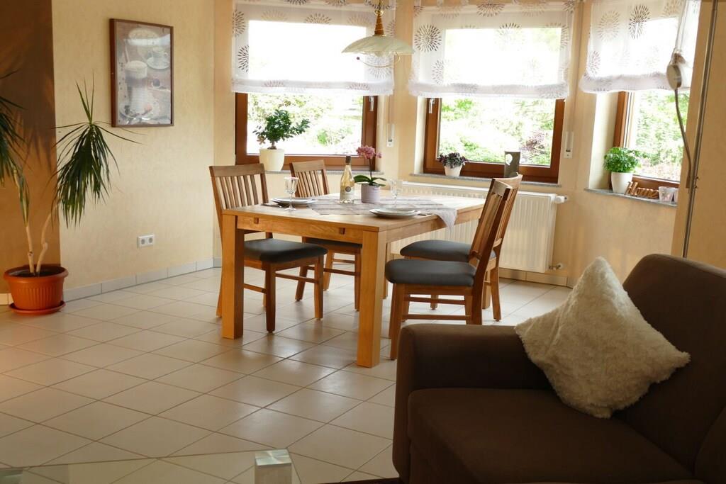 Our cozy, bright holiday apartment (67 m²) is centrally located between the Nürburgring, Bad Neuenahr-Ahrweiler and the Laacher See on a south-facing slope. Large covered terrace with a view of Olbrück Castle.