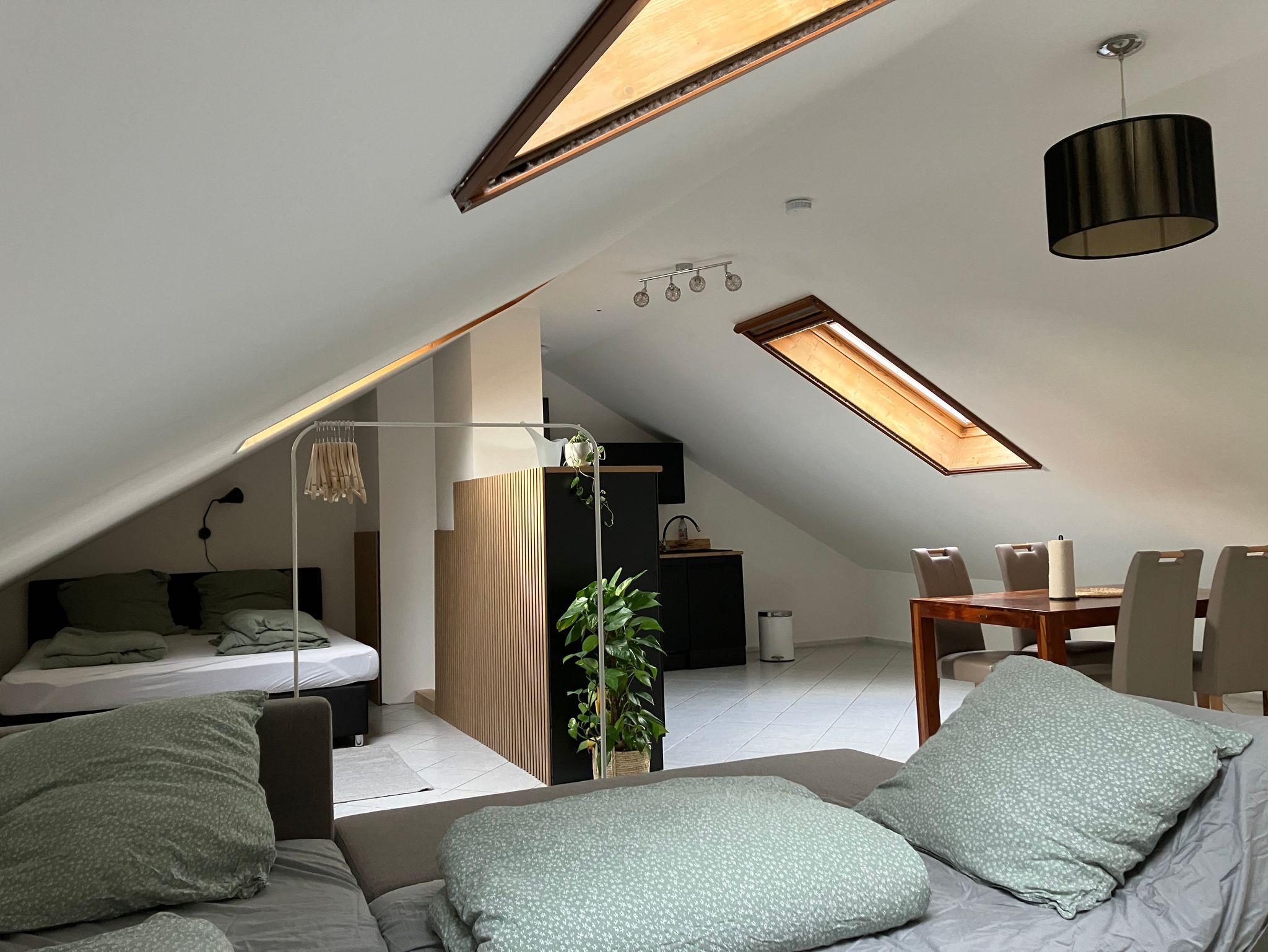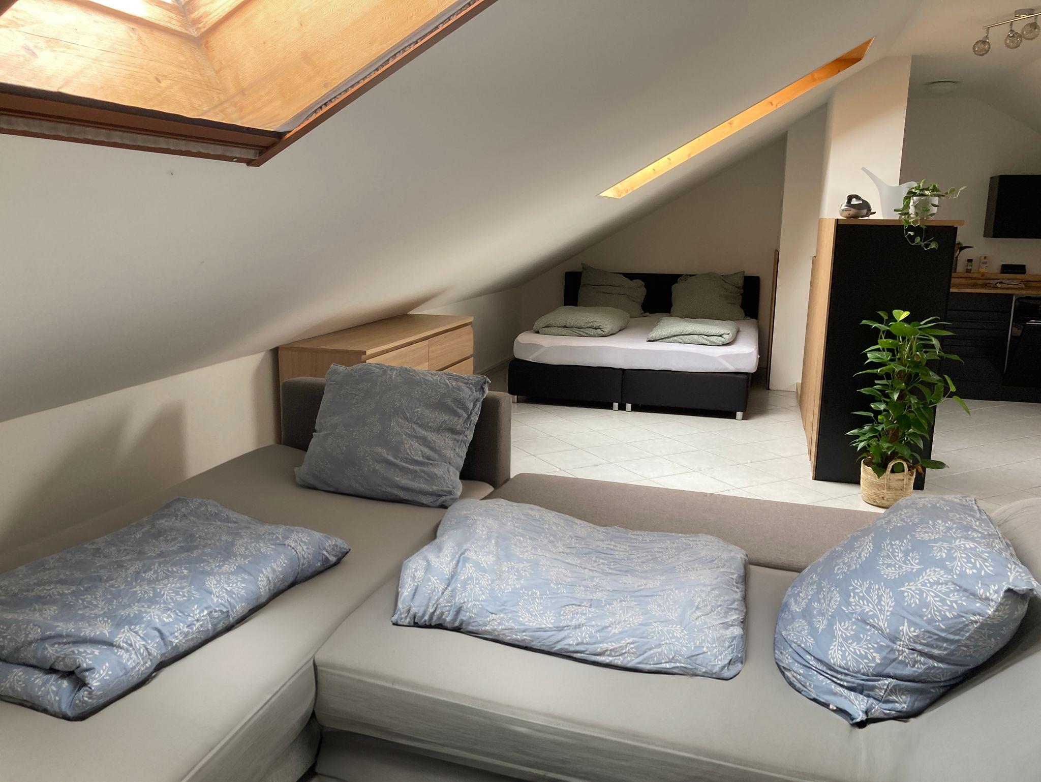 Ein großes Doppelbett (180 cm) und eine Couch, welche als Schlafcouch dienen kann, bieten zusammen Platz für bis zu 5 Personen. Auf Nachfrage ist auch ein Babybett vorhanden.