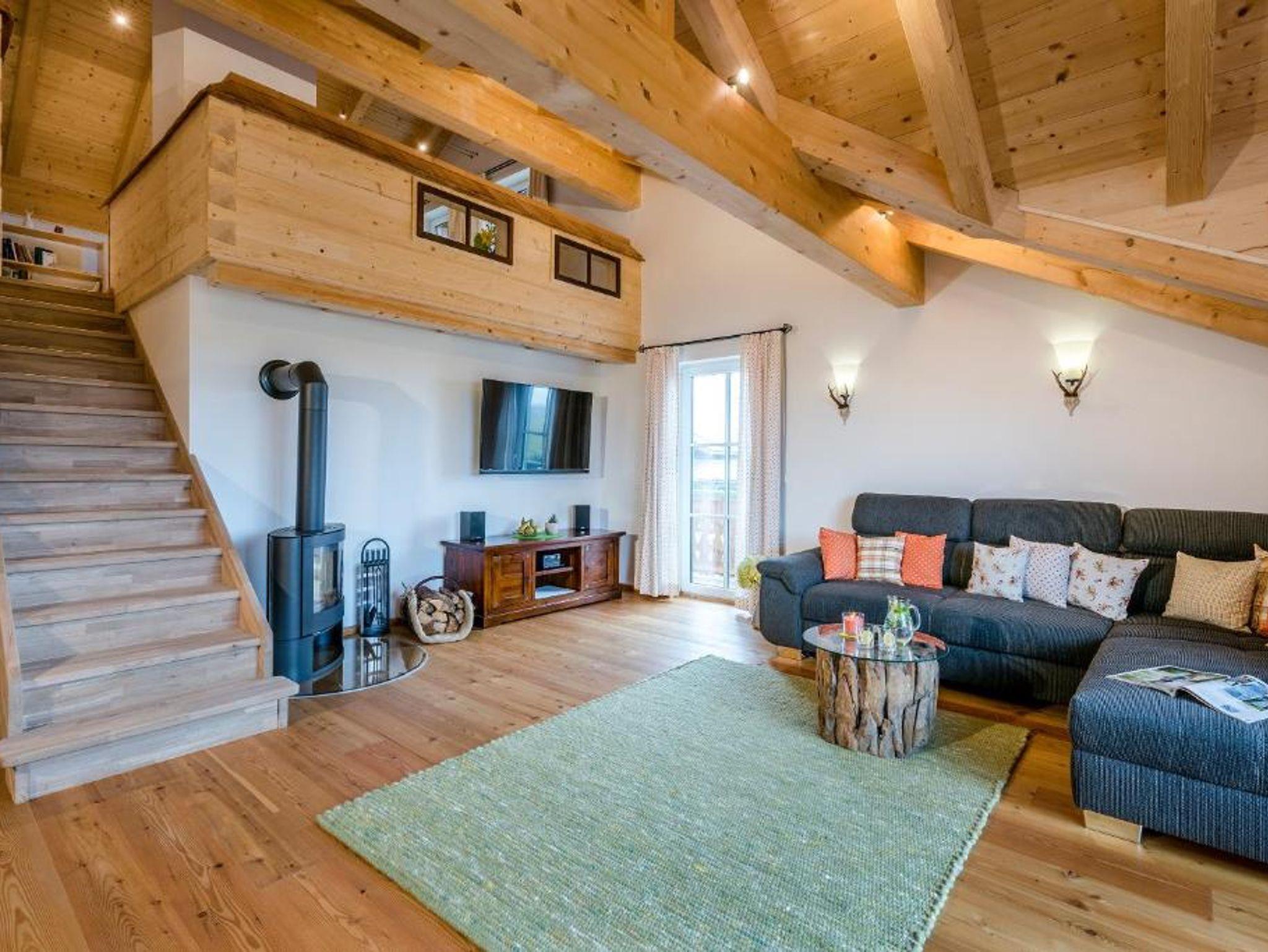 • großzügiger Wohnbereich mit Sofa, Kaminofen, großem Flachbildschirm, HiFi-Anlage und Safe