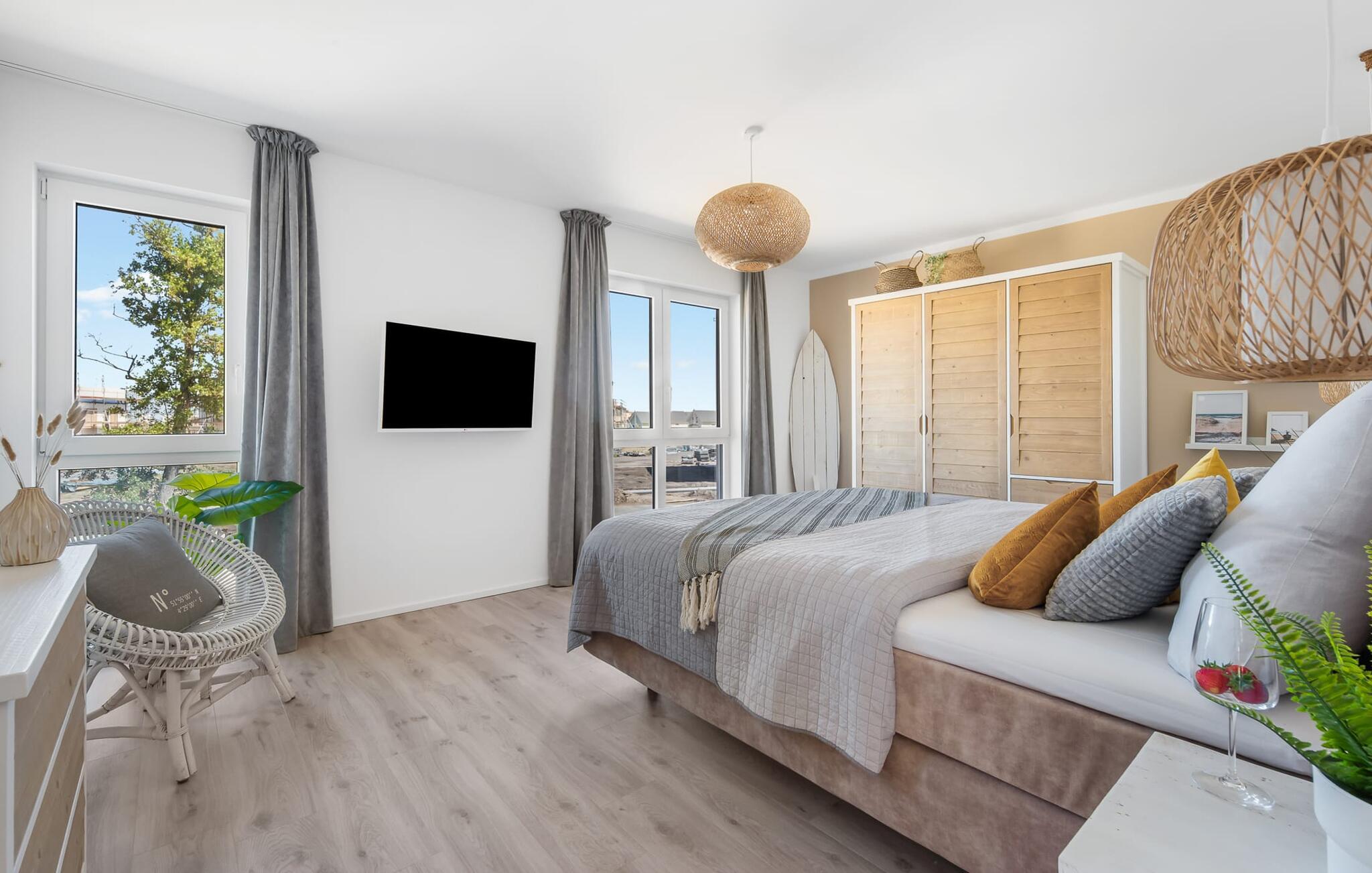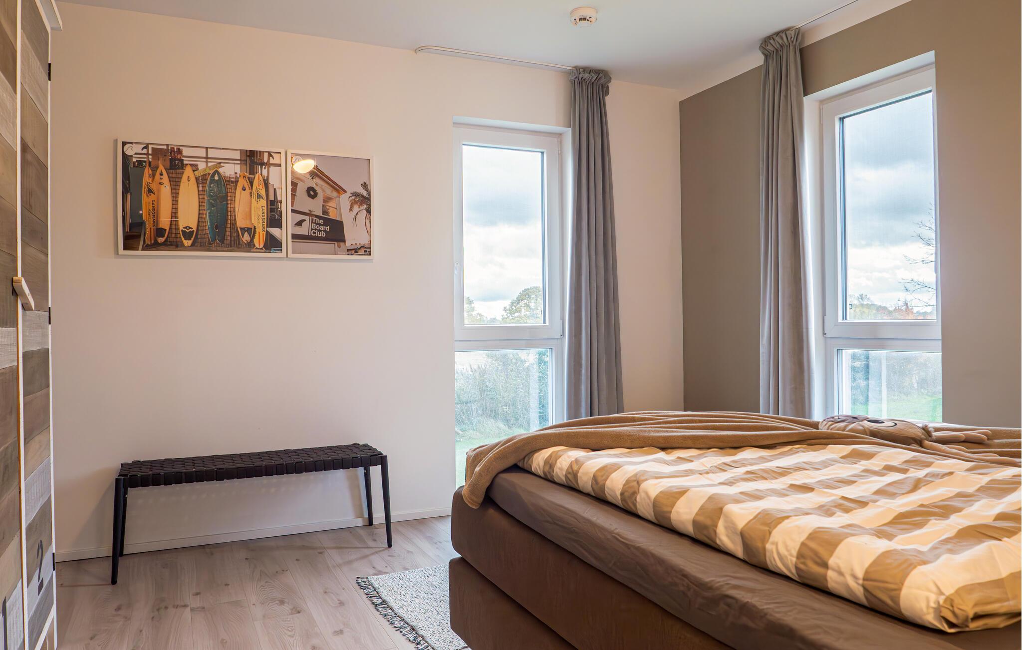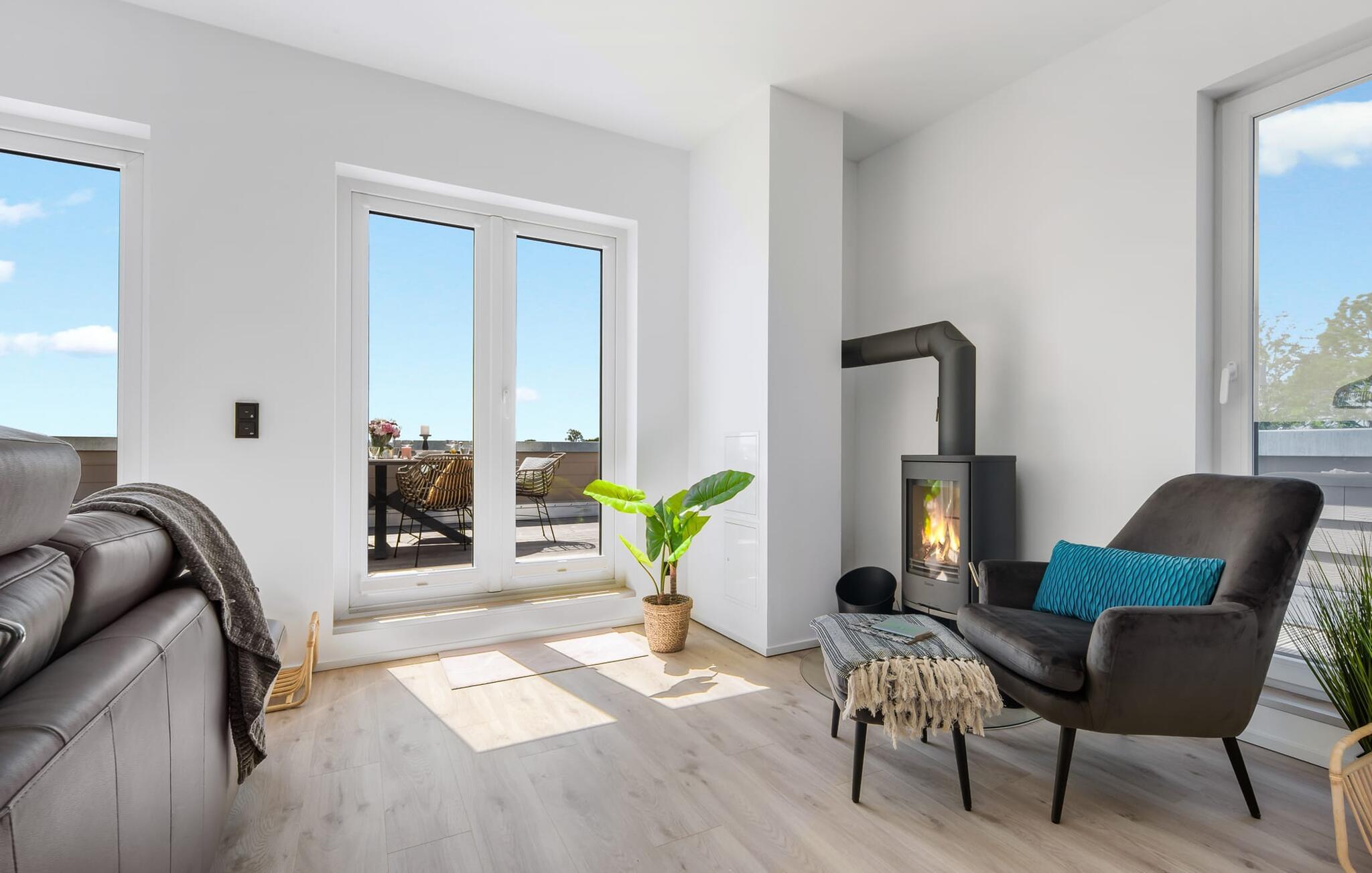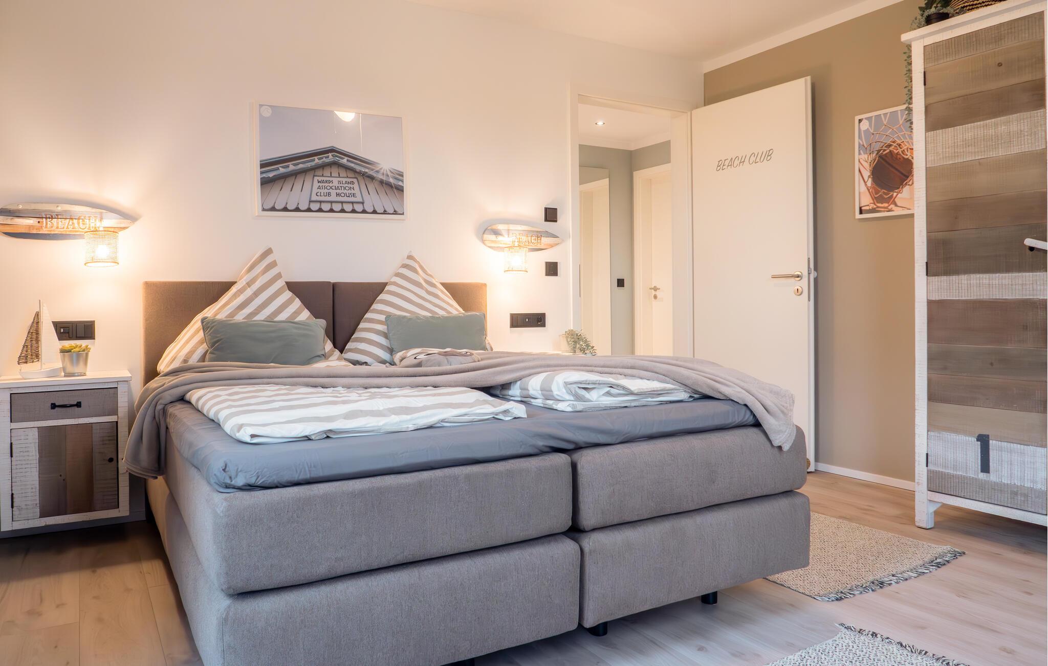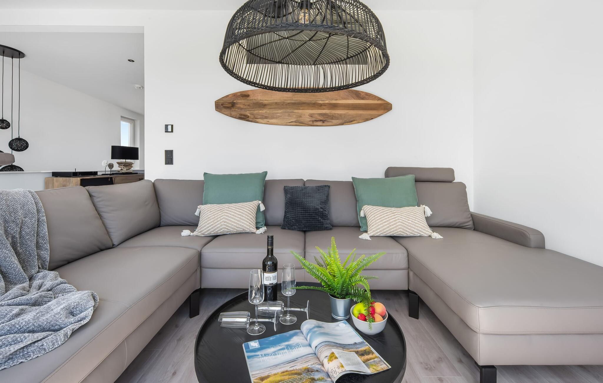 OCEANLOFT er en rummelig og rummelig maisonette ferielejlighed på første og anden sal med direkte udsigt over havet, naturbevarende strandenge og marker. Sandstranden Weidefelder med kiosk, restaurant og strandstole ligger i gåafstand og er et attraktivt rejsemål på alle tider af året. Minigolfbanen med maritimt tema ligger også i umiddelbar nærhed og nydes af både store og små. I er direkte i lejlighedens afslapningsområde. Lejlighedens tre soveværelser er placeret på denne etage. Uanset hvilket soveværelse I vælger, kan I være sikker på en afslappende søvn. To soveværelser er udstyret med dobbeltsenge, et ekstra langt (220 cm) og et fjernsyn hver. Det tredje soveværelse byder jer velkommen med to enkeltsenge. På denne etage er der også et veludstyret badeværelse med bruser i gulvniveau og infrarød sauna. En oase af velvære, der sikrer afslapning i hver sæson. En gang på anden sal lever OCEANLOFT op til sit navn. Her bliver I budt velkommen af vinduesfronten fra gulv til loft med den tilstødende terrasse og udsigt til havet og de naturbevarende strandenge. Kom ind og føl jer straks hjemme. At slappe af i den hyggelige opholdsstue, nyde naturens stilhed ud af vinduet eller tage en sauna er ren afslapning! Hverdagen bliver mere og mere fjern... Skulle vejret nogensinde blive nordisk, vil pejsen med sin brølende ild give yderligere hygge. Det integrerede køkken er perfekt udstyret, og det er sjovt at lave mad sammen. Så nyd de færdige lækkerier på terrassen eller start en hyggelig grillaften... Det er ren ferie. Direkte fra opholdsområdet kommer man ind på den store terrasse med syd-vest orientering. Vender mod bagsiden med udsigt til de naturbevarende strandenge, marker og havet, er hyggelige timer garanteret. Et andet komplet badeværelse med badekar runder ideelt set hele pakken af til en afslappende ferie. Vores favoritsted: en hyggelig grillaften med udsigt over havet, naturbevarende strandenge og markerne... Bemærk venligst: OstseeResort Olpenitz er meget populært, og der bygges fortsat i parken. Ikke desto mindre kan I se frem til en 5-stjernet standard og et førsteklasses ophold. Byggeaktiviteterne kommer ikke til at forstyrre jer på ferien, og derfor gives der ikke yderligere afslag i prisen.