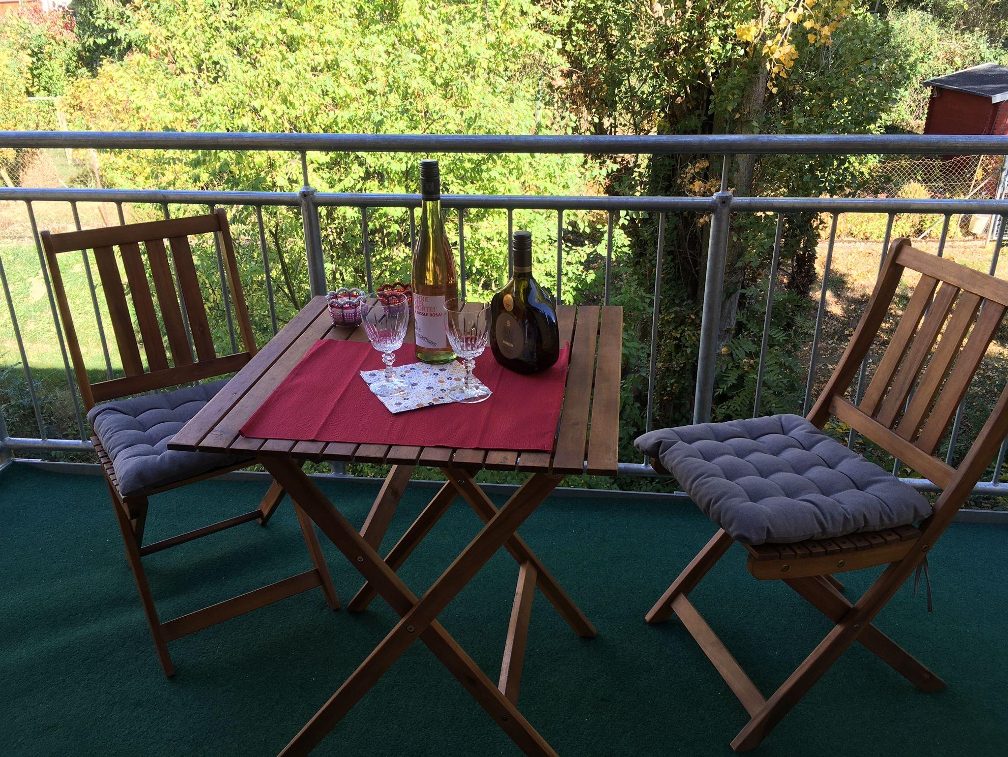 Der Wohn- und Essbereich verfügt über zwei gemütliche Ohrensessel und ein Sofa sowie über einen Esstisch, an dem auch bis zu 6 Personen Platz finden. Zur Ausstattung gehören hier auch eine Bluetooth-Lautsprecherbox sowie ein Fernseher mit SAT-und WLAN-Anschluss. Vom Wohnraum aus besteht direkter Zugang zum großzügigen Nord-Balkon (1,30 x 3,00m) mit Blick ins Grüne.