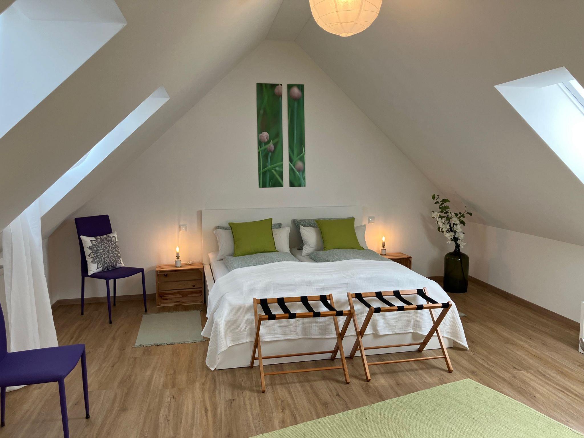 Von der Diele aus führt eine Eichenholztreppe nach oben in das Dachgeschoss. Dort befindet sich ein Schlafzimmer mit Doppelbett (1,80 x 2,00 m), Kommode und einem geräumigen Kleiderschrank. Das zweite Schlafzimmer im Dachgeschoss ist ebenfalls mit einem Doppelbett (1,80 x 2,00 m) sowie mit einem Sofa ausgestattet. Im Dachgeschoss ist darüber hinaus noch eine weitere Toilette vorhanden.