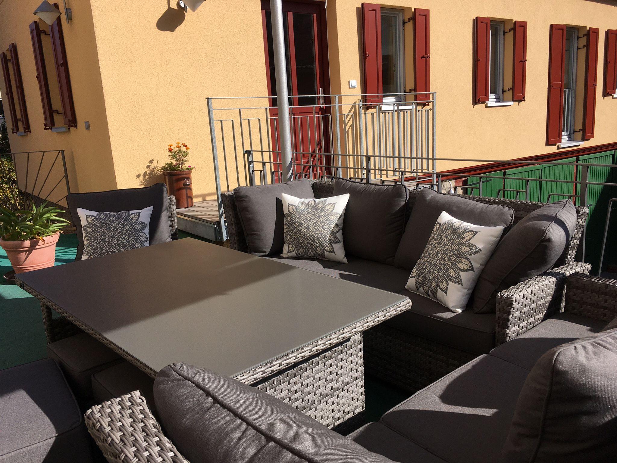 Vor dem Haus befindet sich eine großzügige Outdoor-Lounge (außer im Winter), die mit genutzt werden kann. Ca. 100 Meter vom Hof entfernt steht darüber hinaus ein Garten als weiterer Rückzugsort zur Verfügung. Unmittelbar in Anschluss an das Grundstück erstrecken sich Wiesen, Felder und Natur pur – man ist also unmittelbar im Grünen.