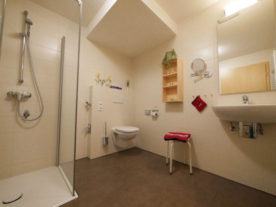 Die barrierefreie Ferienwohnung mit 65 m² Wohnfläche bietet komfortables Wohnen im modernen Landhausstil. Sie verfügt über einen Wohnraum, ein separates Schlafzimmer sowie ein Bad mit Dusche/WC. Die Küchenzeile ist mit Spülmaschine, Mikrowelle und Kühl-/Gefrierkombination ausgestattet.