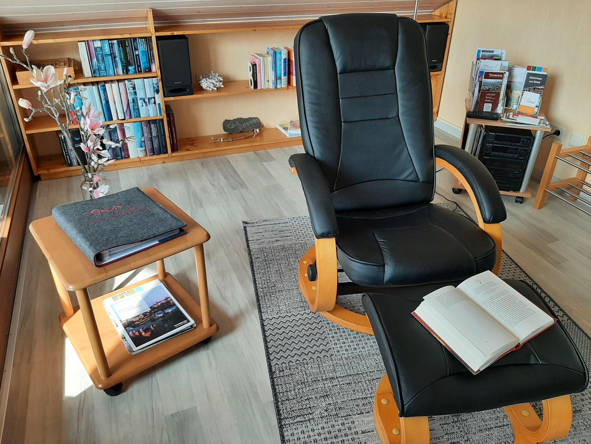 Stilvolles, komfortables Feriendomizil mit Wohlfühlgarantie im 1000-jährigen Wein- und Ferienort Ockfen im Dreiländereck Deutschland-Frankreich-Luxemburg. Die helle, mit viel Liebe zum Detail eingerichtete, 65 qm große Ferienwohnung (Nichtraucher) befindet sich im Dachgeschoss mit separatem Eingang. Die Leseecke mit Wintergartenatmosphäre lädt Sie ein Platz zu nehmen. Gerne können Sie sich aus der vorhandenen Bücherauswahl bedienen.