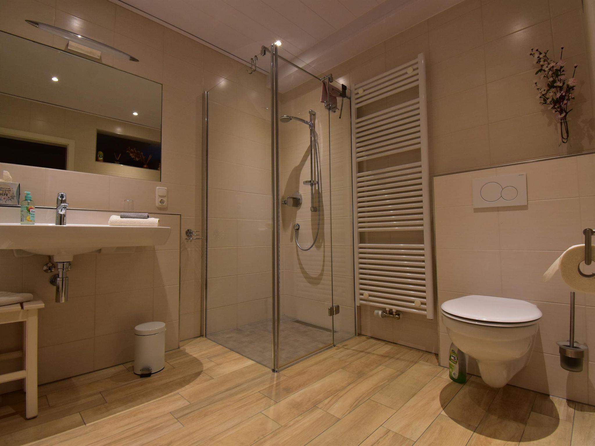 Sep. ebenerdiger Eingang, sep. Doppelzimmer, Wohnzimmer, modern eingerichtete Küche (zusätzliche Küchengeräte: Mikrowelle, Wasserkocher, Toaster, Eierkocher), modernes Bad mit Fußbodenheizung, ebenerdigem Eingang zur Dusche. Terrasse, Liegewiese mit Sonnenliegen und Grill.