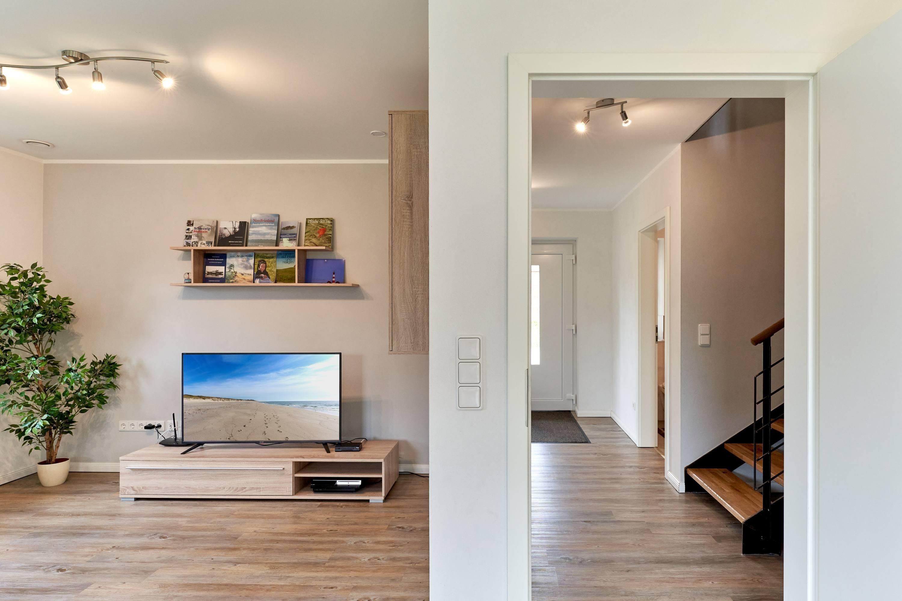 Im Erdgeschoss erwartet Sie ein großzügiger, offener Wohn- und Essbereich, der perfekt für gemeinsame Stunden mit Familie oder Freunden geeignet ist. Die großen Fensterfronten lassen viel Tageslicht herein und bieten einen herrlichen Blick in den Garten. Die bequeme Sofaecke lädt zu gemütlichen Abenden ein, sei es mit einem guten Buch oder einem spannenden Film. Ein Flachbild-TV sowie kostenfreies WLAN sorgen für Unterhaltung.